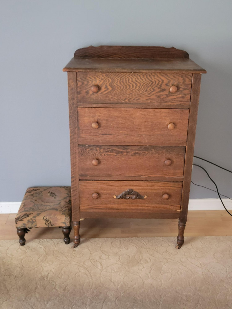 Lot # 4 - Antique Wooden 4-Drawer Dresser & Upholstered Foot Stool Starting Bid: $ 5.00 Bids: This sale will end in: |