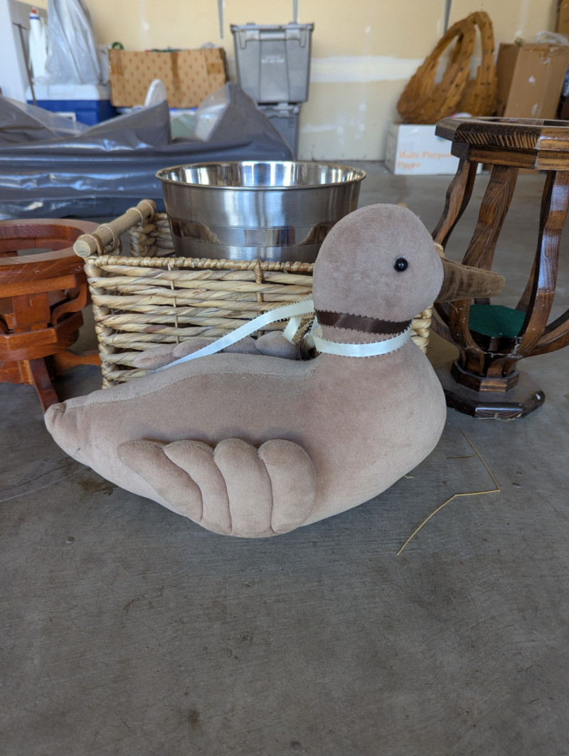 Lot # 85 - Wood Votives, wicker basket, metal waste basket and stuff goose/duck Starting Bid: $ 5.00 Bids: This sale will end in: |