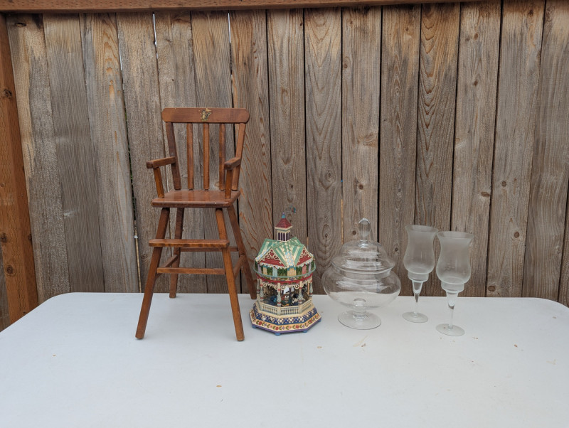 Lot # 105 - Doll Chair, Musical Carousel, Apothocary Vase and Votive Candle Holder Starting Bid: $ 5.00 Bids: This sale will end in: |