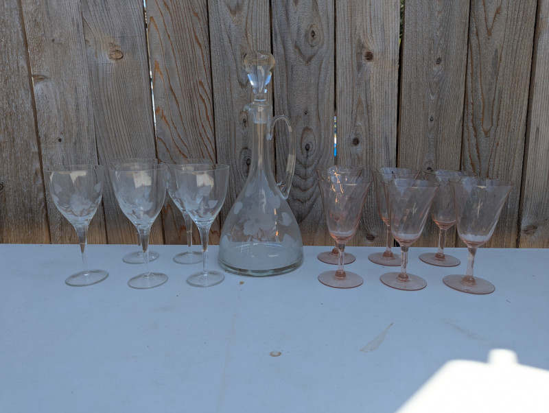 Lot # 119 - Carafe & 5 PC Wine Set with 6 additional Pink Depression Glasses Starting Bid: $ 5.00 Bids: This sale will end in: |