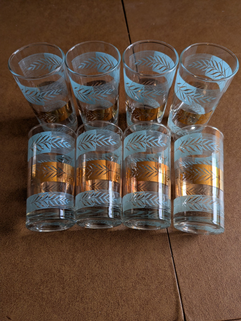 Lot # 7 - Set of 8 MCM Turquoise and Gold Wheat Hiball Glasses Starting Bid: $ 5.00 Bids: This sale will end in: |