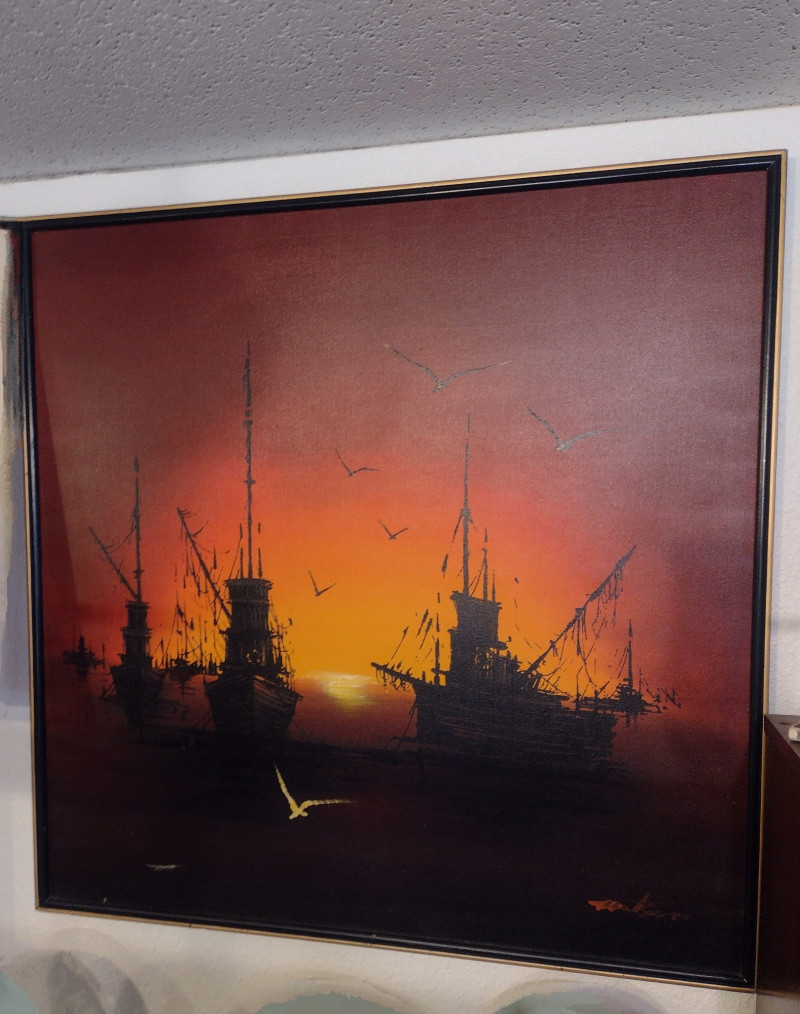 Lot # 17 - MCM Painting of Asian Sailboats - Under an Orange Sunset Starting Bid: $ 5.00 Bids: This sale will end in: |