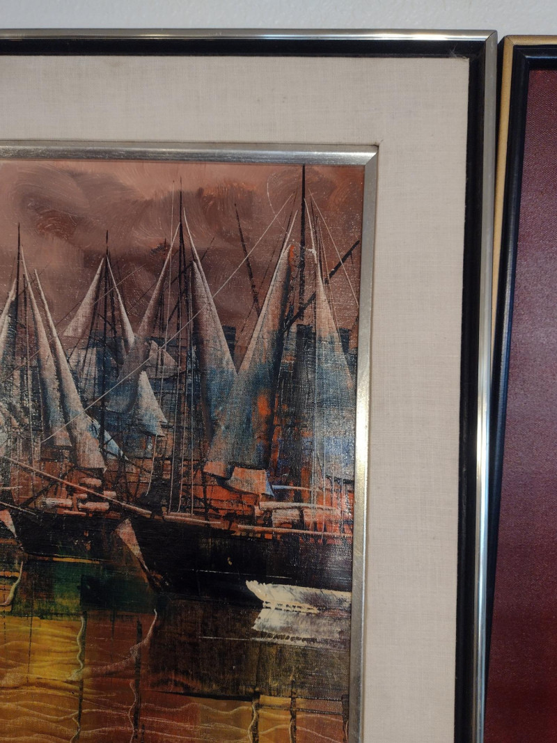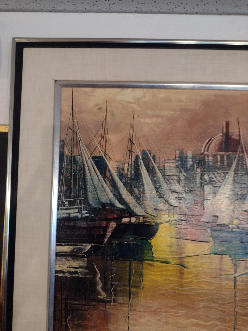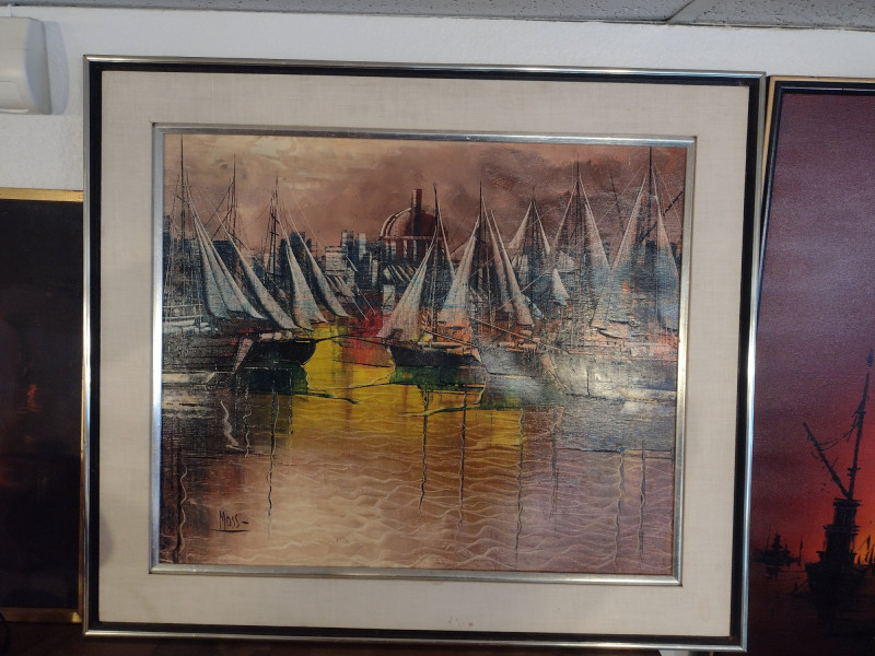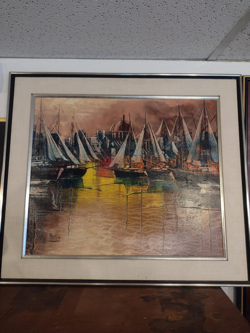 "Sailboats in Port with Golden Reflections" by Moss (Signed) Evocative harbor scene by Moss, featuring a striking lineup of sailboats against an industrial skyline. Warm golden light spills across the deep shadowed hulls, creating a captivating play of color and reflection. Heavy, textured brushwork adds depth and movement. Framed with a linen mat and metallic trim. Mat shows some foxing and age spots; frame has minor wear, but these do not detract from the striking presence of the piece.