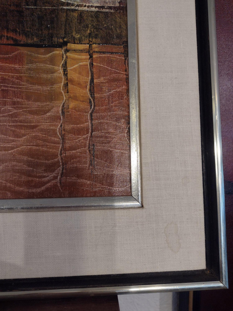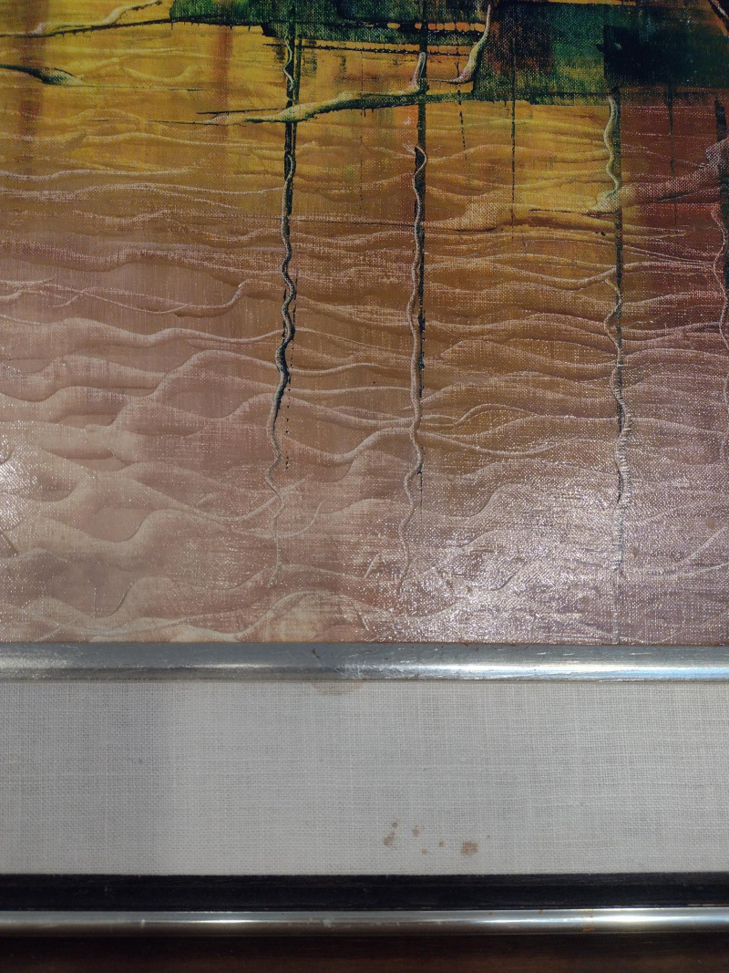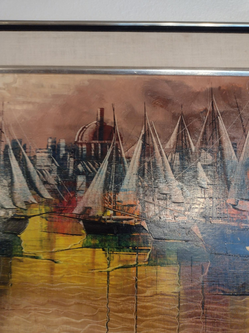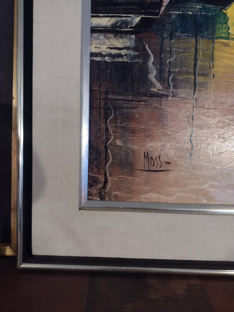 "Sailboats in Port with Golden Reflections" by Moss (Signed) Evocative harbor scene by Moss, featuring a striking lineup of sailboats against an industrial skyline. Warm golden light spills across the deep shadowed hulls, creating a captivating play of color and reflection. Heavy, textured brushwork adds depth and movement. Framed with a linen mat and metallic trim. Mat shows some foxing and age spots; frame has minor wear, but these do not detract from the striking presence of the piece.