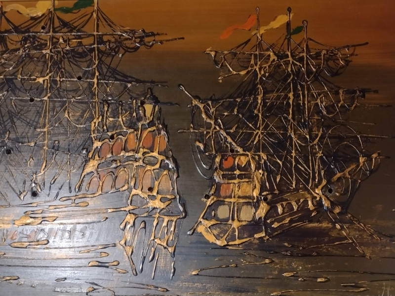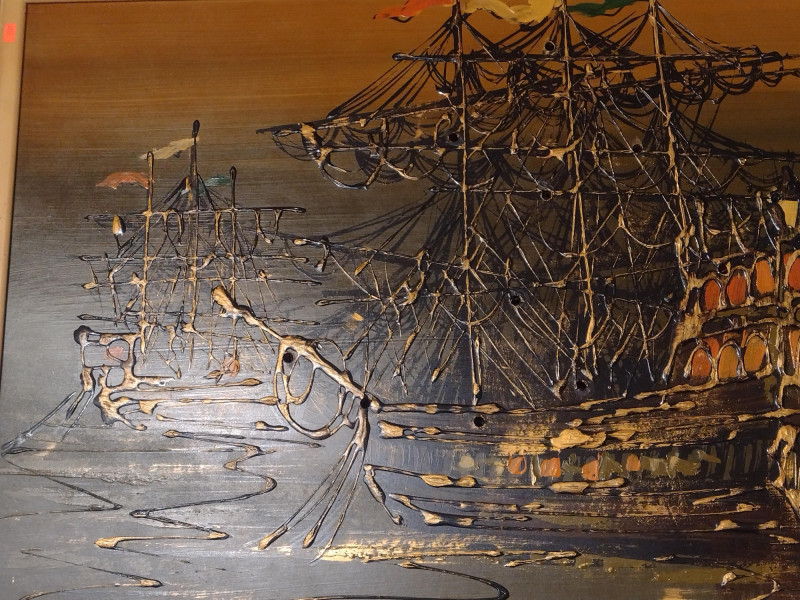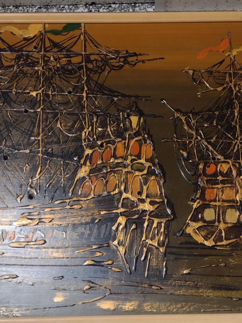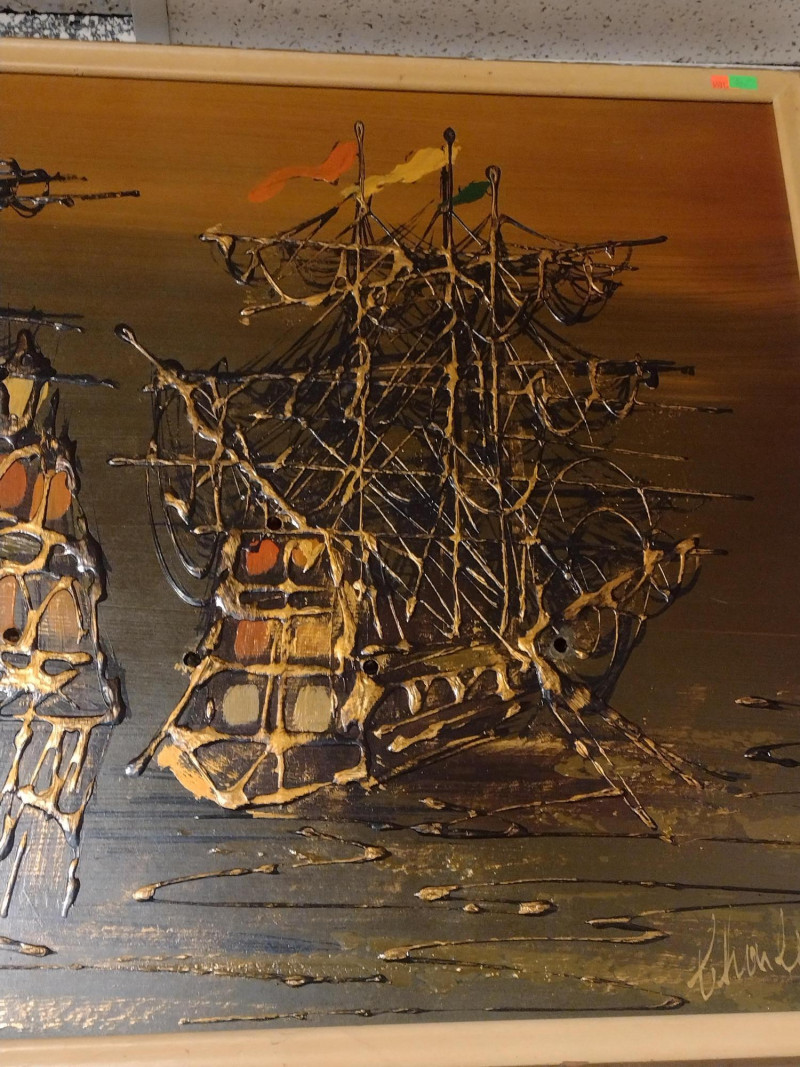 Lot # 18 - MCM mixed media Painting- Gold Drip Ships by Thonlis (signed)
