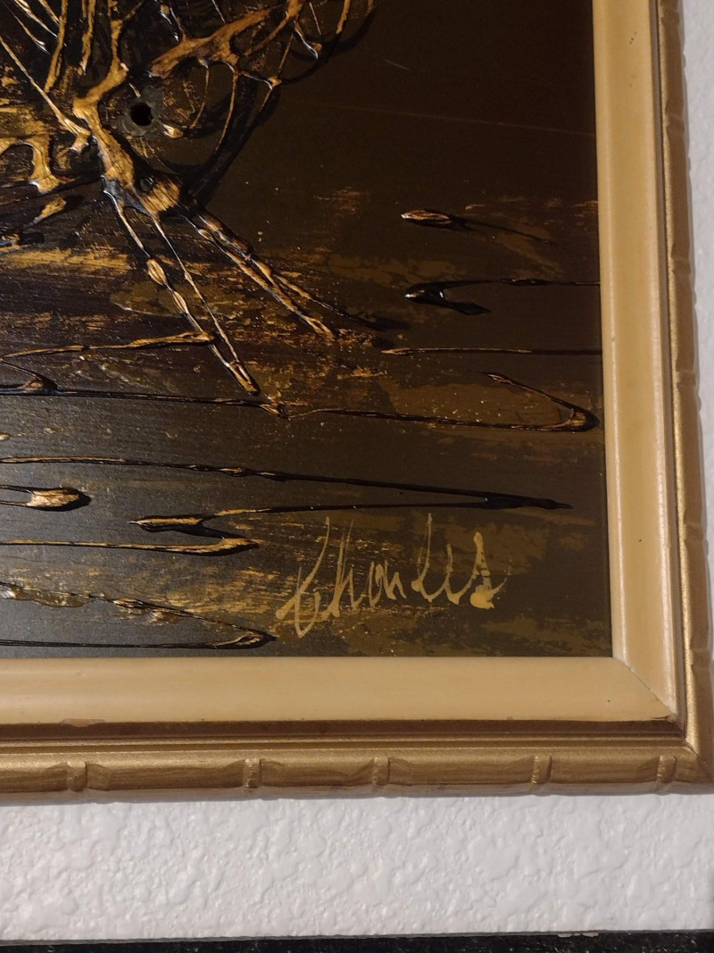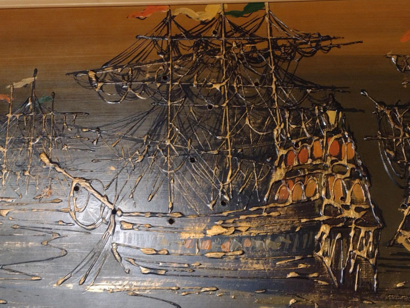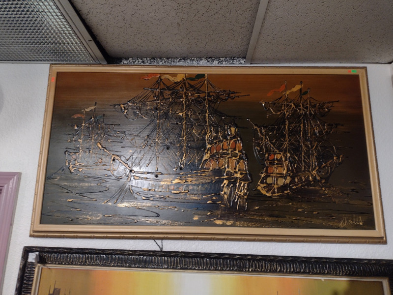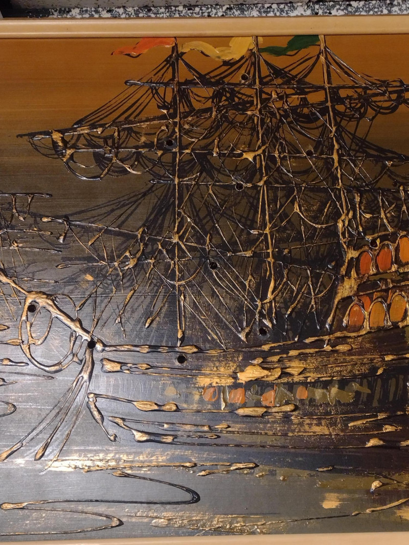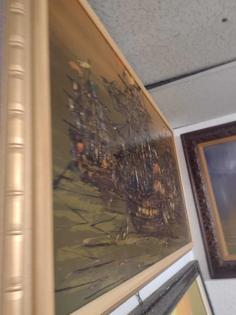 Lot # 18 - MCM mixed media Painting- Gold Drip Ships by Thonlis (signed)