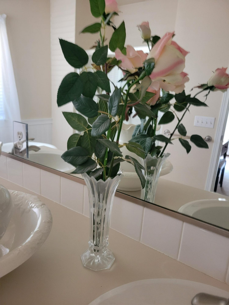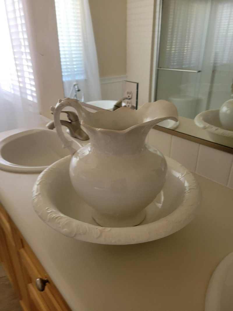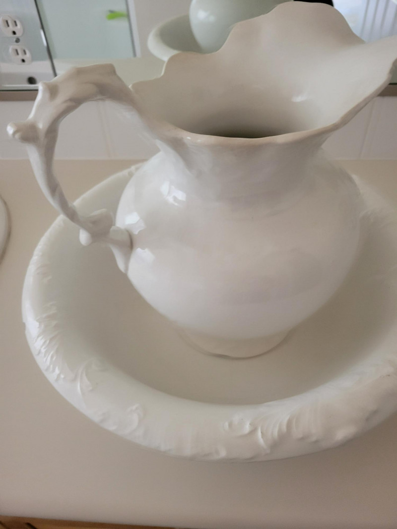 Gorgeous antique pitcher and matching wash basin featuring a scalloped rim and delicate embossed scrollwork along the edges. This elegant set adds instant vintage charm to any space. Whether displayed as a centerpiece, part of a farmhouse or Victorian-style decor, or used functionally. Includes a clear faceted glass/crystal vase, perfect for fresh or decorative blooms. All pieces are in excellent condition with minimal signs of age. Measurements: Wash Basin: 16 inches in Diameter Pitcher: 11.5 inches H Vase: 9.5 inches H