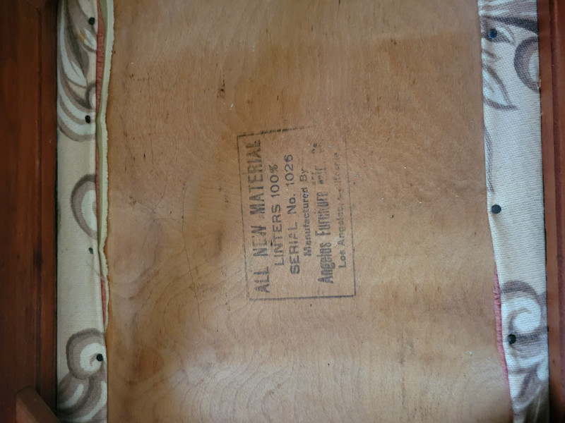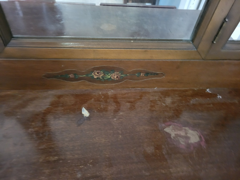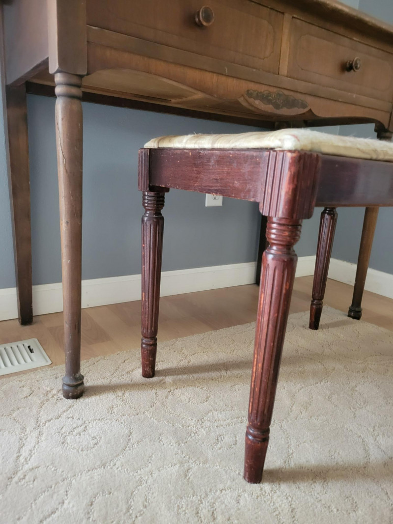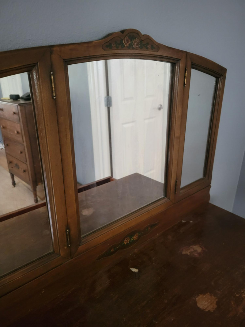 Charming early-20th-century dressing table with tri-fold mirror, slender turned legs, and delicate floral inlay accents. The warm wood tone and classic design bring a timeless elegance, while the original mirror glass adds vintage character. The top surface shows visible wear and would benefit from restoration, but the piece is structurally sound. Included is a vintage upholstered stool by Angelus Furniture Co. (Los Angeles, c. 1920s), upholstered in a floral tapestry fabric. While not an exact match to the table, the stool complements it beautifully in style and proportion. Measurements: Vanity: 37 in W x 18 in D x 29.5 H Vanity with Mirror: 54.5 in H Stool: 22 in L x 14 in W x 18 in H