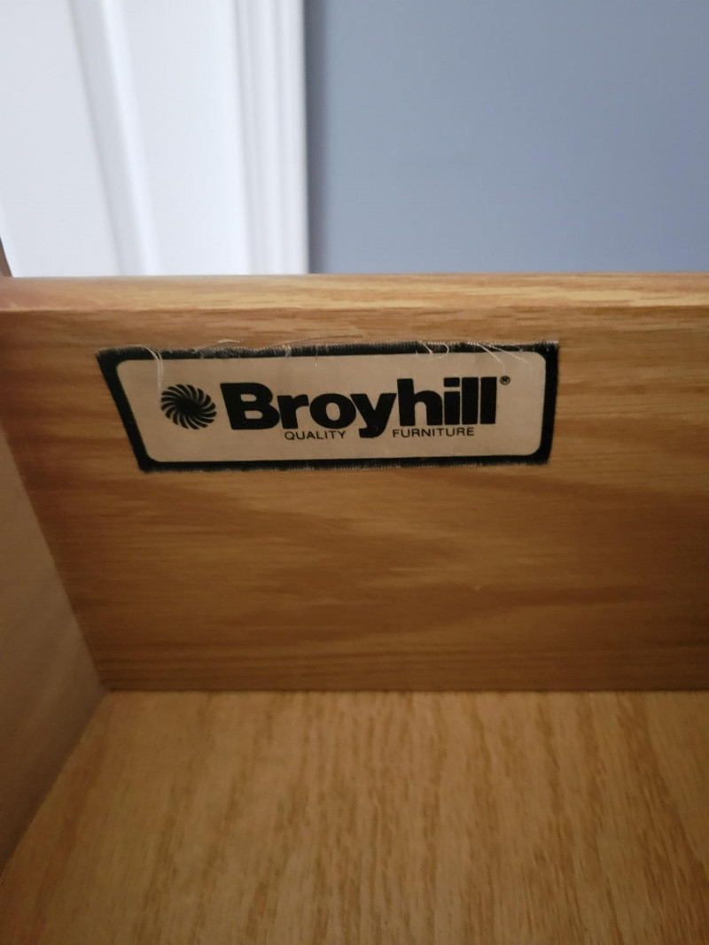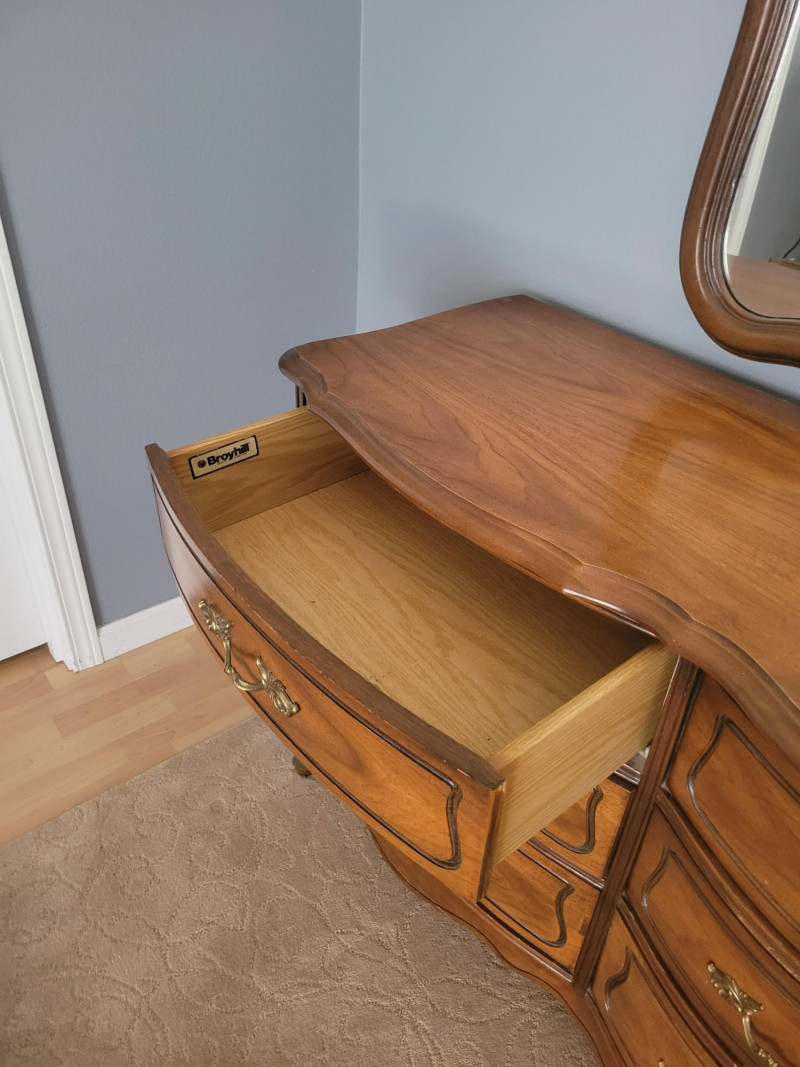This beautiful vintage 9-drawer dresser by Broyhill exemplifies the timeless elegance of French Provincial design. Featuring a graceful curved front, cabriole legs, and ornate hardware, it combines both style and functionality. The matching mirror is attached to the dresser, completing the classic look and adding sophistication to any room. Excellent overall condition. Please note: the top center drawer is missing a handle. This is an ideal piece for anyone seeking a blend of practical storage and classic design. Perfect for bedrooms, entryways, or any space that could use a timeless statement piece. measurements: Dresser: 65 in W x 19 in D x 32 in H Mirror: 34.5 in H x 32.5 in W