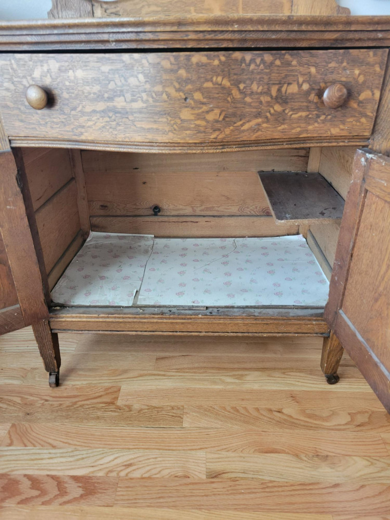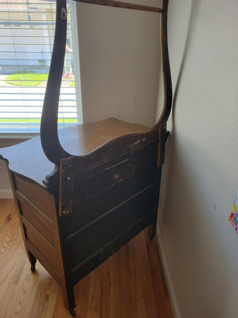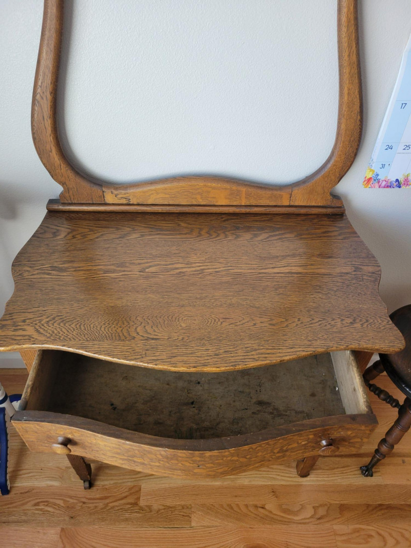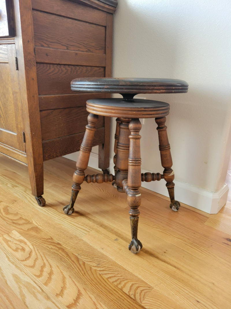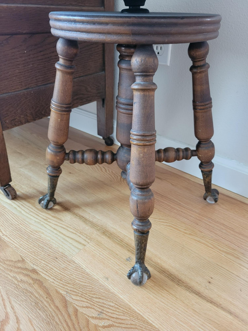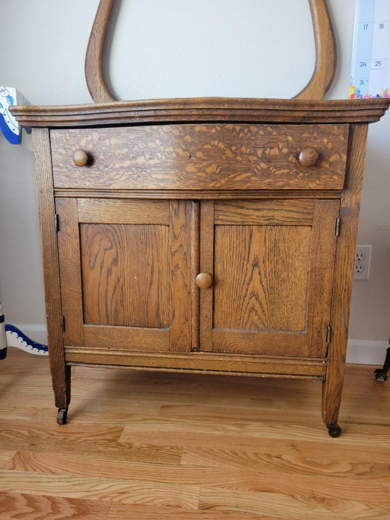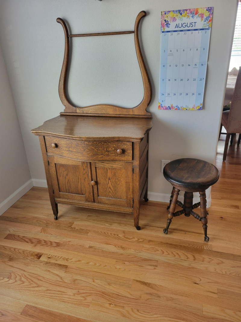 This charming antique oak wash stand features a classic high back with an integrated towel bar, a single curved front drawer, and double-door cabinet storage. This piece is crafted in beautiful quarter-sawn oak, a premium woodworking technique prized for its stability and its striking "ray flake" grain pattern, visible in the shimmering lines and flecks of the surface. Turned legs, original wood knobs, and smooth rolling casters add to its vintage appeal. The included antique swivel piano stool complements the set perfectly, featuring turned spindle legs, ornate cast-iron claw-feet gripping glass ball casters, and a round wooden seat. Ideal as a decorative accent or display. Both pieces are in good antique condition with age-appropriate wear and patina. Functional and sturdy, with the kind of authentic charm only time can create. Measurements: Wash stand: 32 in W x 20 in D x 30 in H (56.5 in H including Towel Bar) Stool: 19 in H x 14.5 in Seat Diameter