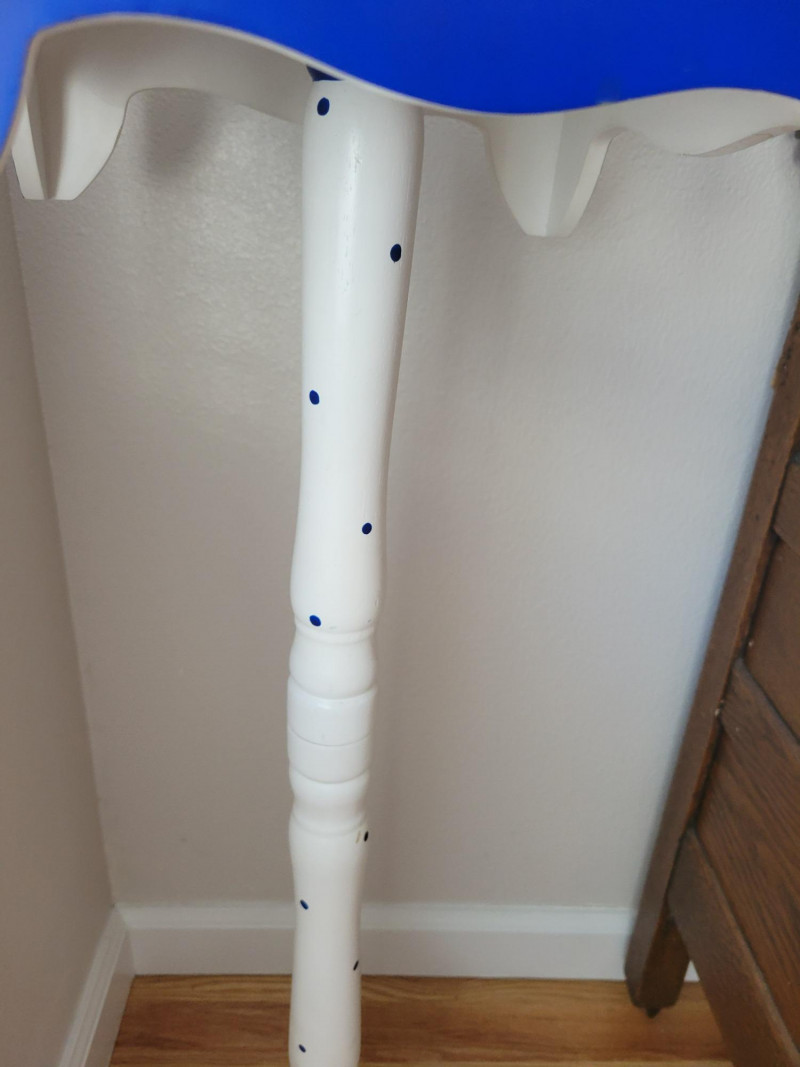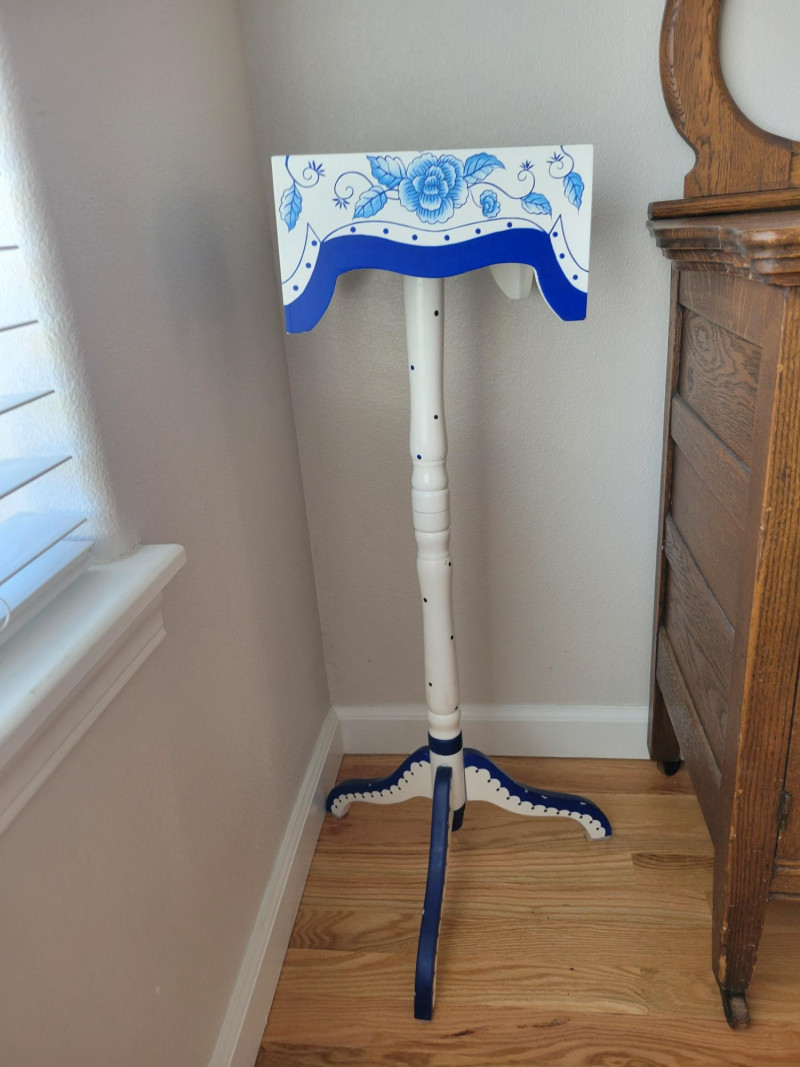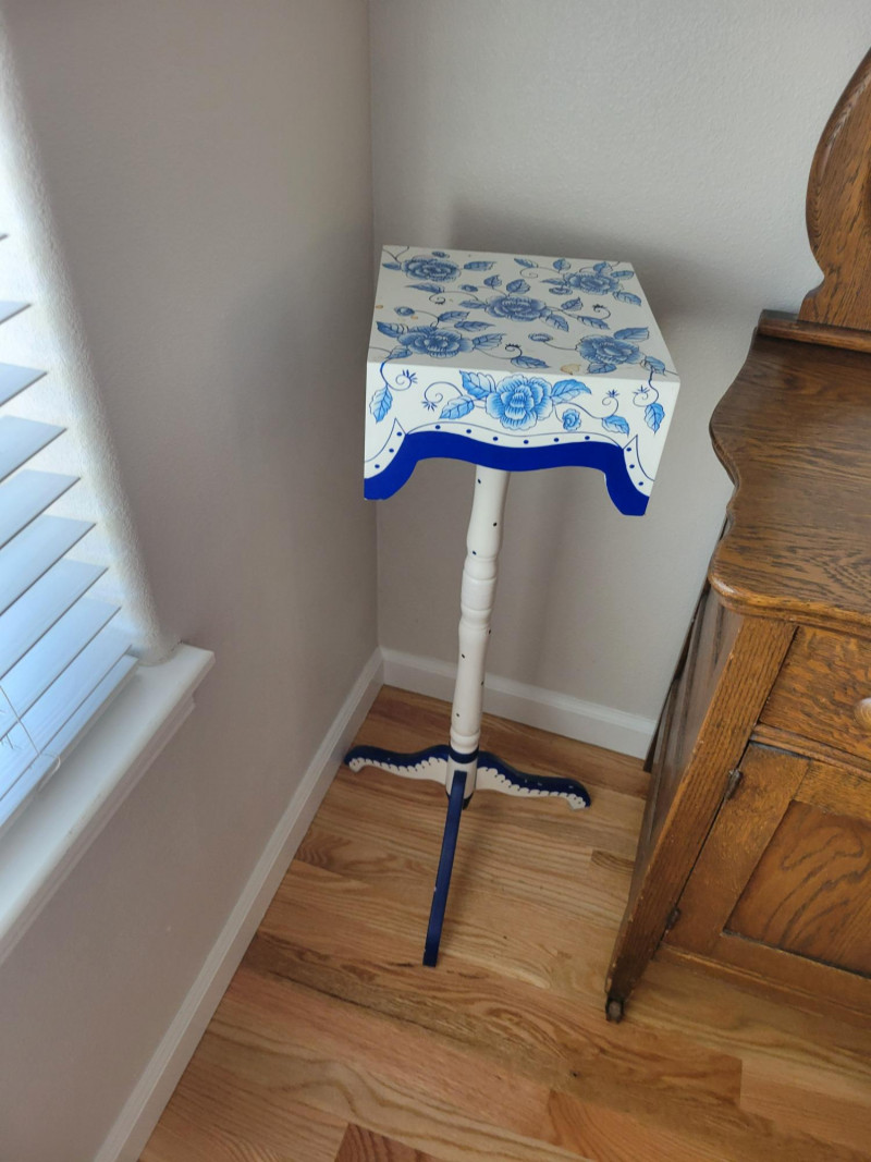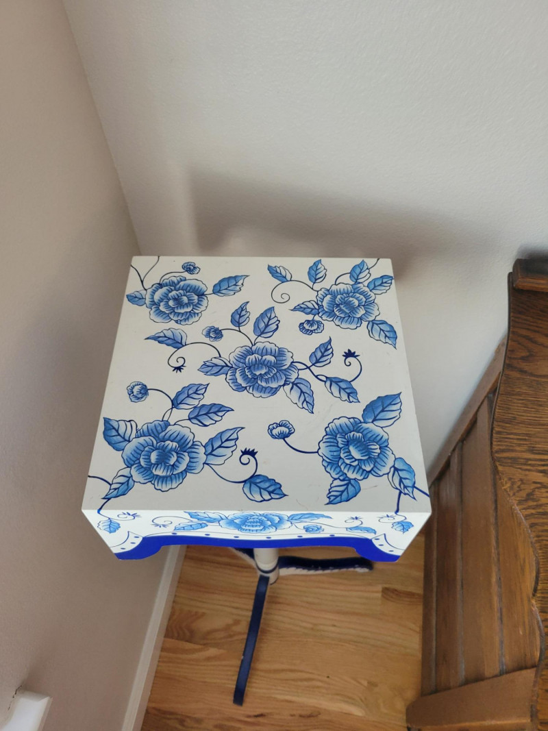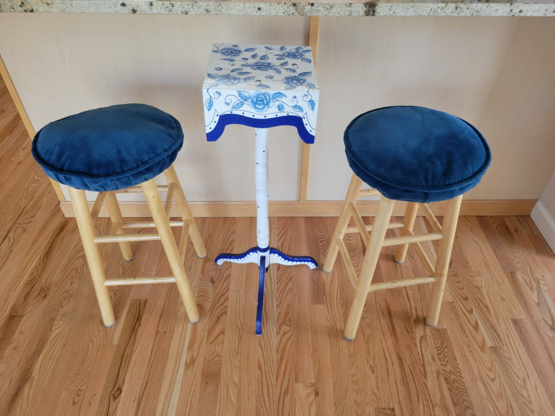 Bring charm and color to your space with this cheerful set. The two honey-toned wooden bar stools feature classic lines and rich blue removable cushions that add comfort and a pop of style. The hand-painted wooden accent table or plant stand steals the show with its crisp white finish, vibrant cobalt blue floral motif, scalloped apron, and graceful tripod base. Perfect for adding personality to a kitchen, bar area, or any corner that needs a stylish lift. Solid, sturdy and full of character - this set is ready to brighten your home. Measurements: Stools: 24.5 in H Accent Table: 10 in L x 10 in W x 33 in H