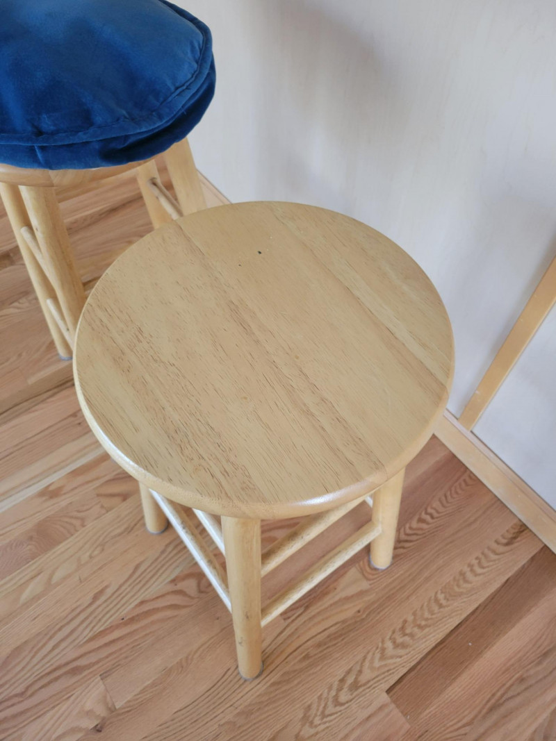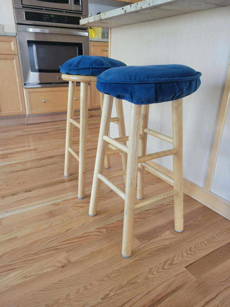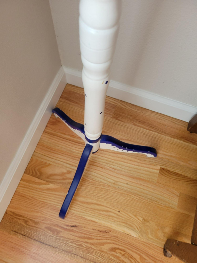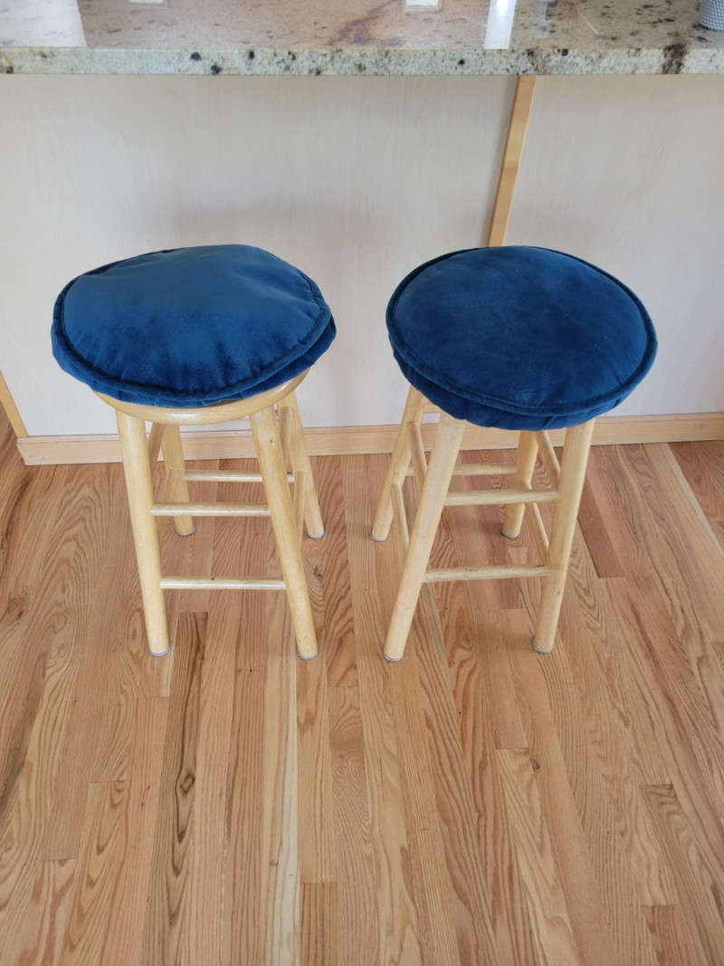 Bring charm and color to your space with this cheerful set. The two honey-toned wooden bar stools feature classic lines and rich blue removable cushions that add comfort and a pop of style. The hand-painted wooden accent table or plant stand steals the show with its crisp white finish, vibrant cobalt blue floral motif, scalloped apron, and graceful tripod base. Perfect for adding personality to a kitchen, bar area, or any corner that needs a stylish lift. Solid, sturdy and full of character - this set is ready to brighten your home. Measurements: Stools: 24.5 in H Accent Table: 10 in L x 10 in W x 33 in H