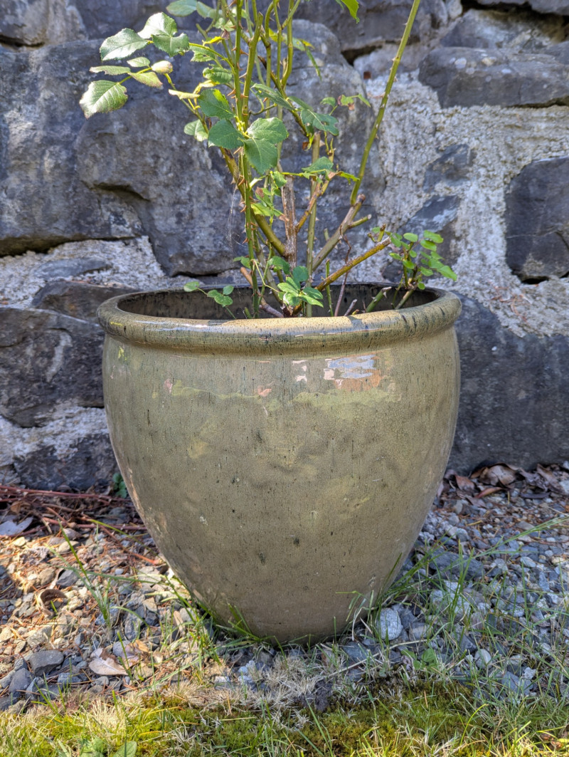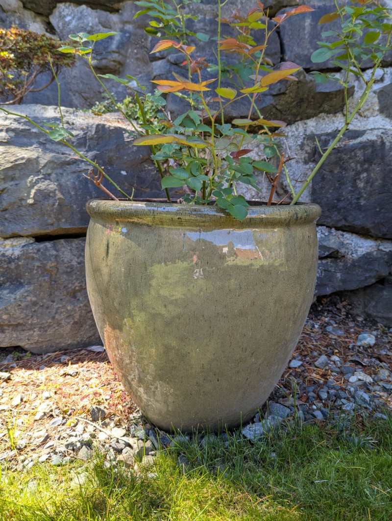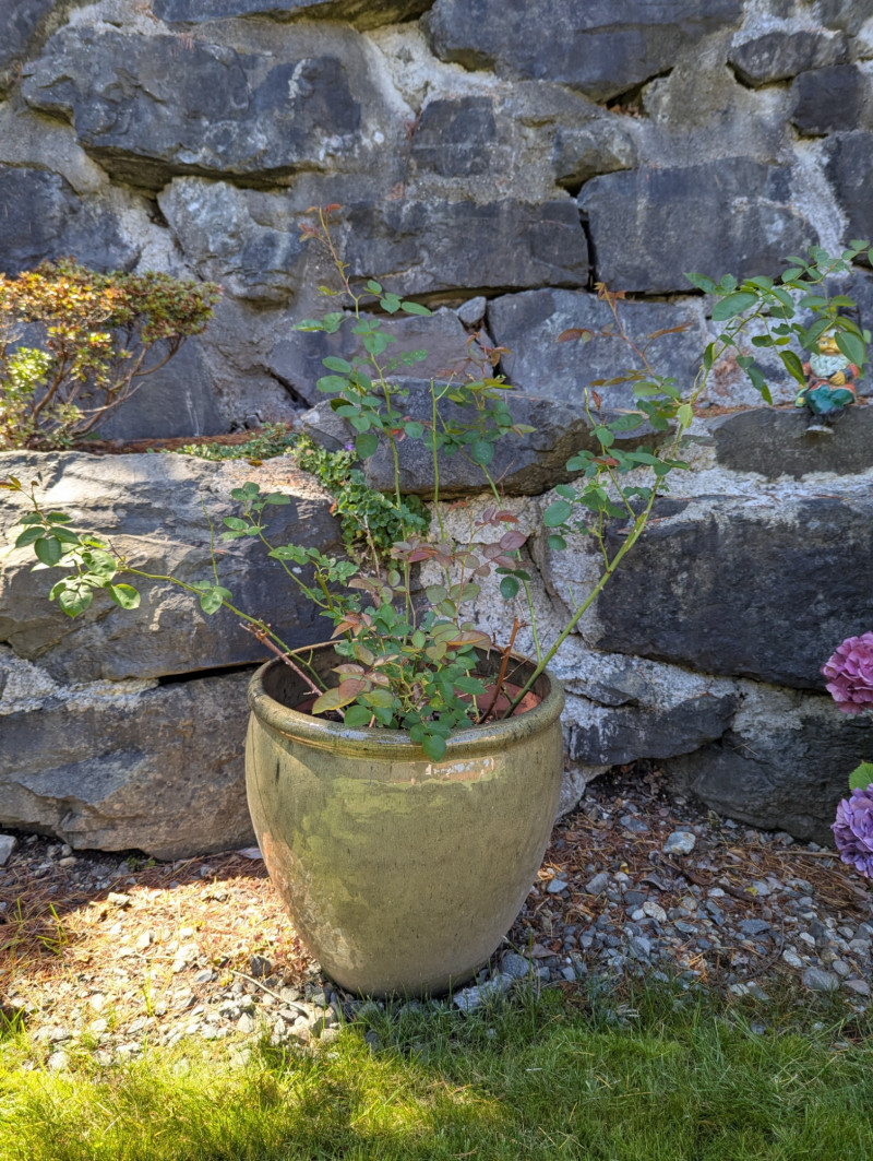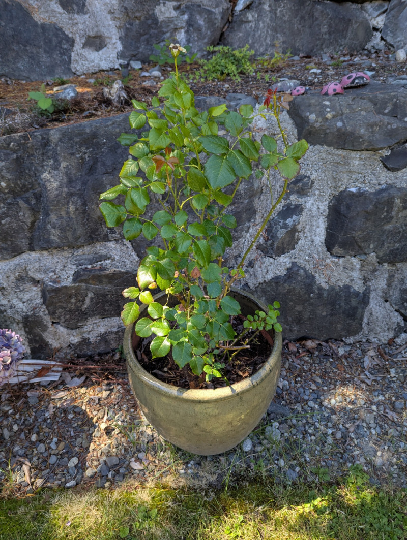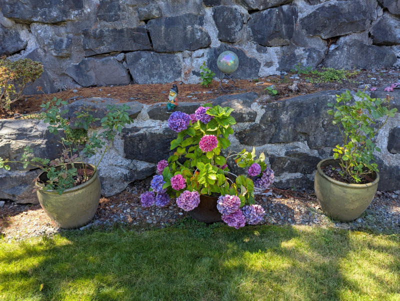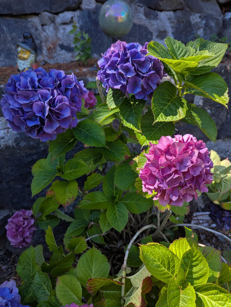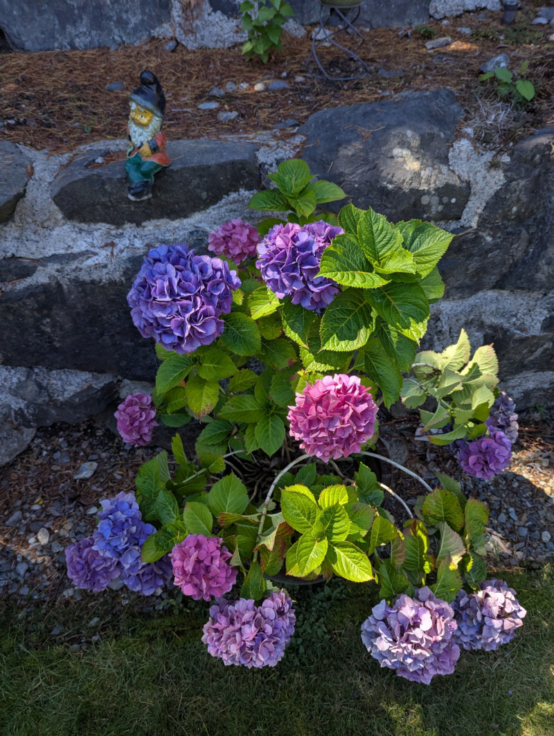 3 Beautifully potted outdoor plants and a friendly garden gnome: 2 Potted Rose Bushes, Hydrangea Macrophylla ( Pink & Purple), Garden Gnome - 11 inches long Note: Globe NOT included.