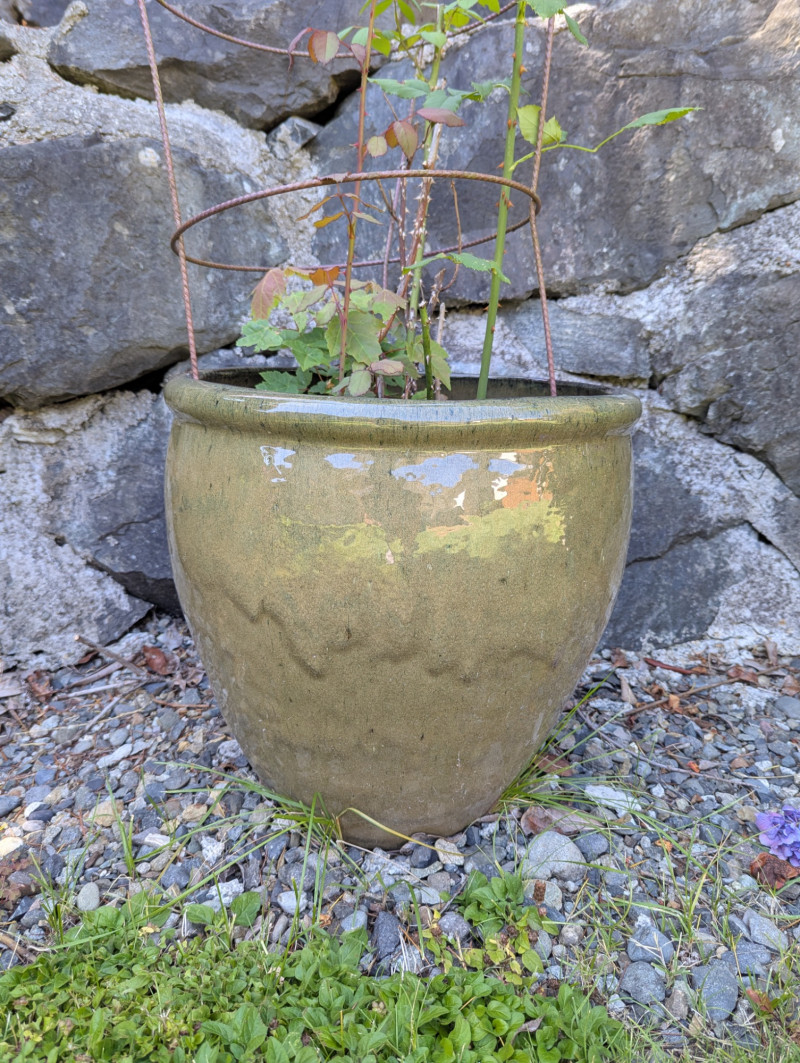 Set of 4 beautifully potted outdoor plants: Hydrangea Macrophylla (Purple) in Medium blue drip glaze pot, Small Hydrangea Macrophylla (Purple) in floral ceramic pot, and 2 Large Potted Rose Bushes in set of Large drip-glazed out door planters.