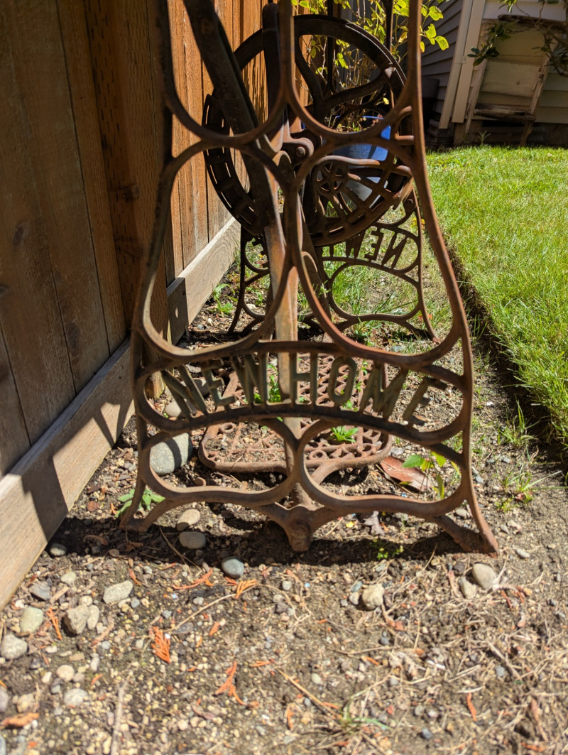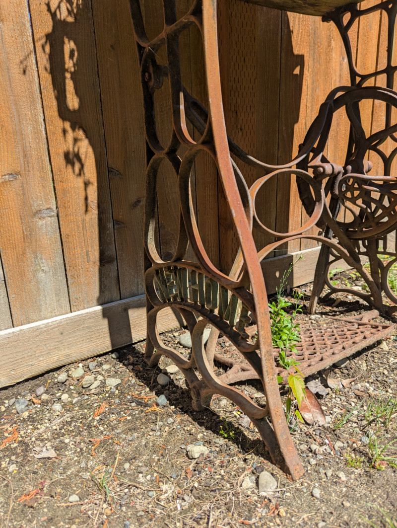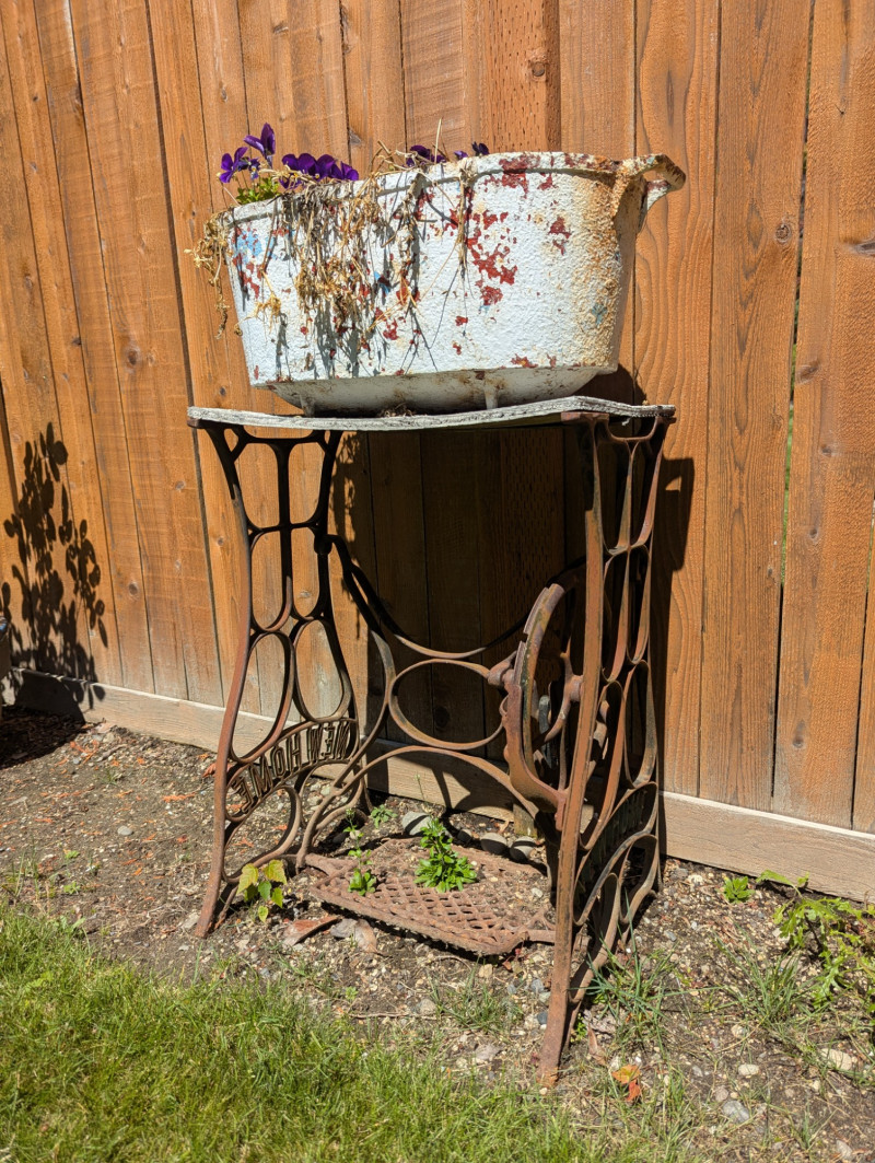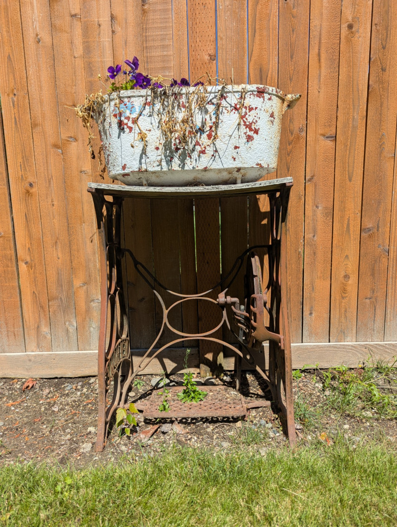 Set of 3 outdoor pots - two with established climbing roses, and one beautiful large decorative pot ready for your favorite plants. Mix of textured neutrals and vibrant blues for instant visual appeal. Includes a repurposed antique Newhome Treadle sewing table and basin, now a unique planter with ornate cast-iron base and weathered patina. An eye-catching display perfect for seasonal flowers, cascading greenery, or herbs. Approximate measurements of sewing table: 30 in H x 18 in D x 35 in W