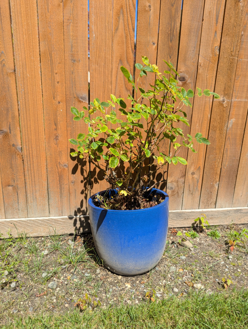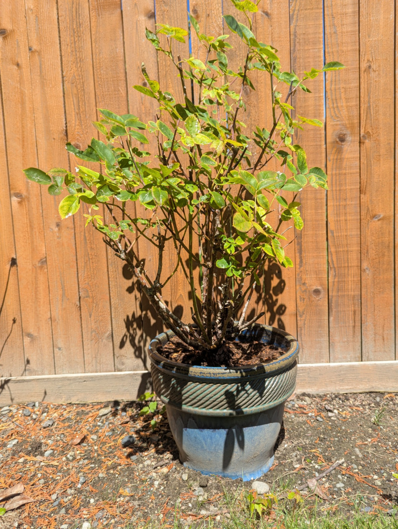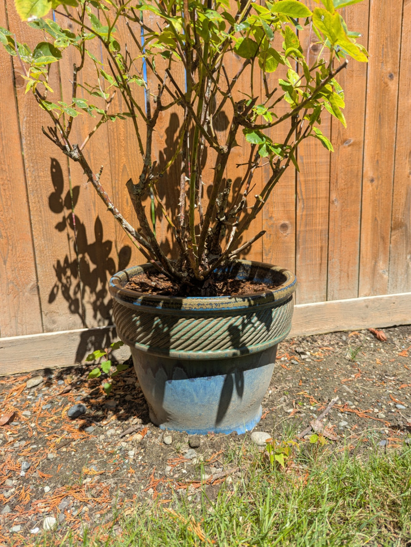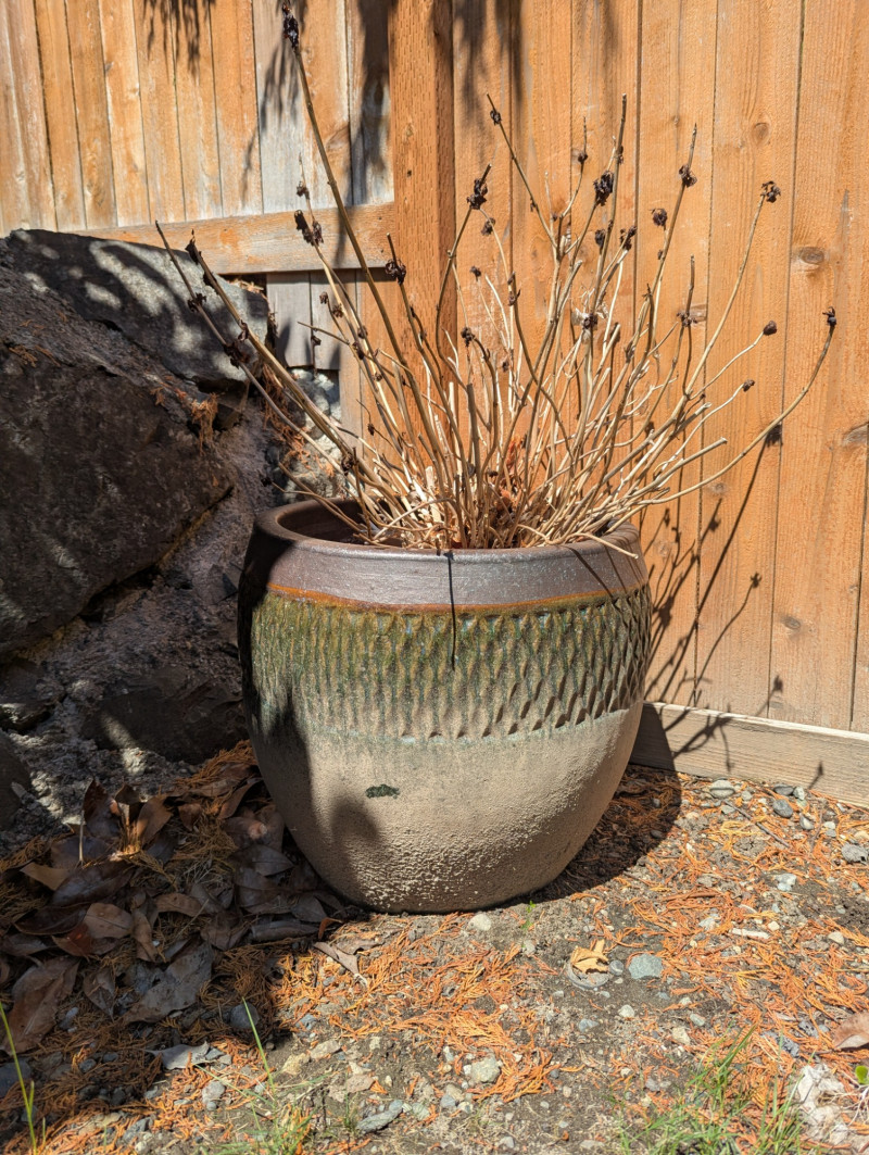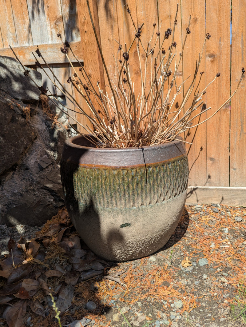 Set of 3 outdoor pots - two with established climbing roses, and one beautiful large decorative pot ready for your favorite plants. Mix of textured neutrals and vibrant blues for instant visual appeal. Includes a repurposed antique Newhome Treadle sewing table and basin, now a unique planter with ornate cast-iron base and weathered patina. An eye-catching display perfect for seasonal flowers, cascading greenery, or herbs. Approximate measurements of sewing table: 30 in H x 18 in D x 35 in W