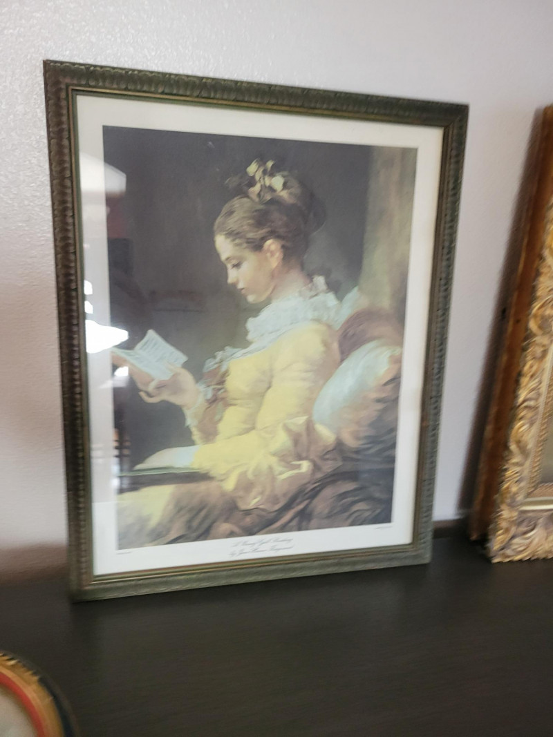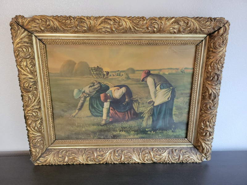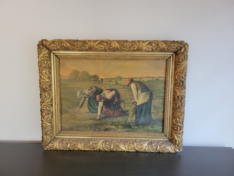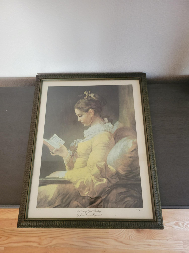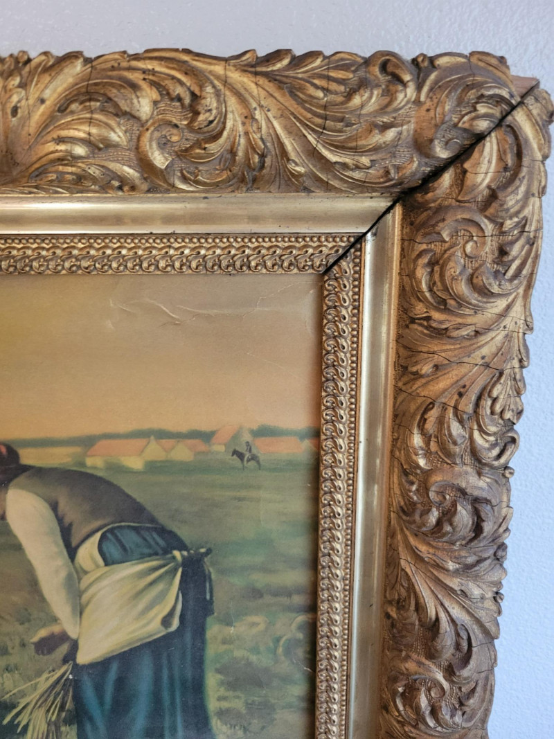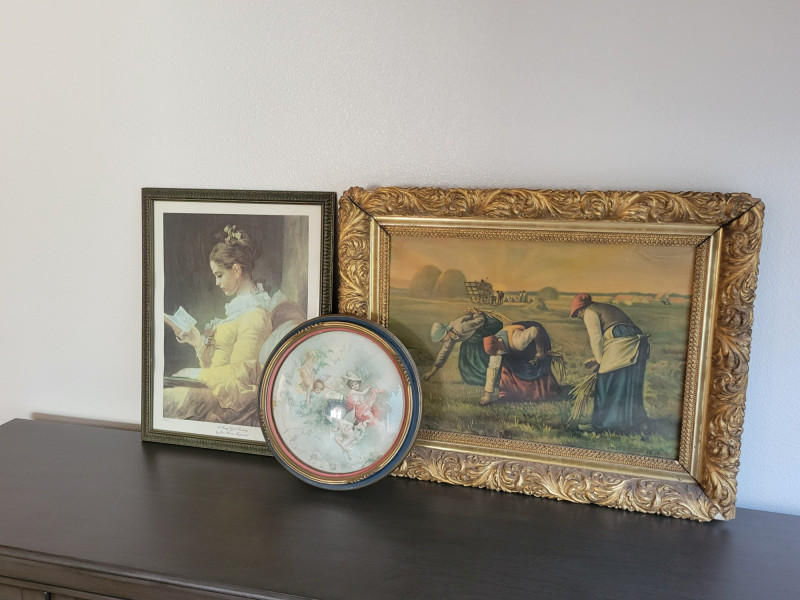 A charming collection of three framed are prints: "A Young Girl Reading" by Jean Honore Fragonard - Classic Rococo portrait of quiet contemplation, in a textured vintage frame. (19.5 H x 15.5 W) "The Gleaners" by Jean Francois Millet (c. 1857) - Realist depiction of women gleaning after harvest, in ornate gilt frame with richly scrolled molding. (26 W x 20 H). Frame shows some age with splits and surface cracks to the ornate molding; print has light creasing but displays beautifully. (See photos). Round cherub/fairy print - Romantic chromolithograph-style depiction of cherubic figures, set in a round gold-tone frame with blue and red trim. (12 inch diameter). Frame and print show light age-related wear and spotting. All pieces show expected wear consistent with age, but these do not detract from the antique charm and presence of the grouping. A lovely decorative lot that brings together Rococo elegance, Realist grit and Victorian Romanticism - perfect for collectors or vintage decor.
