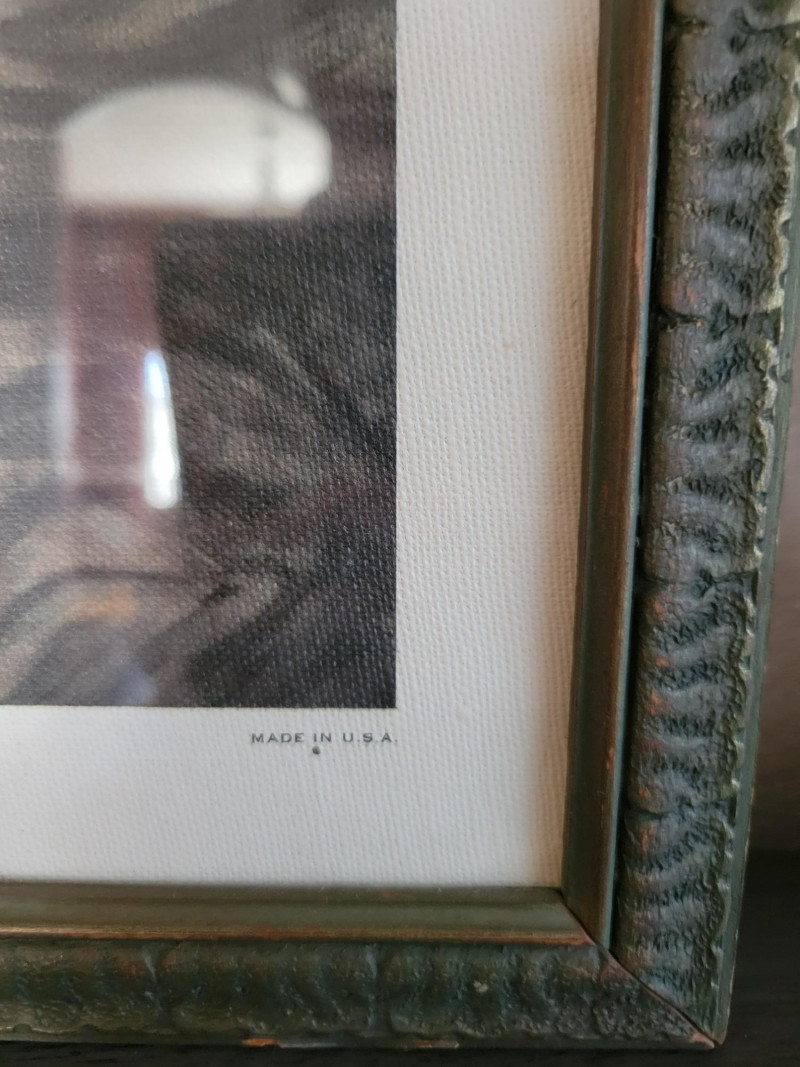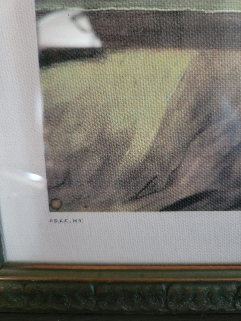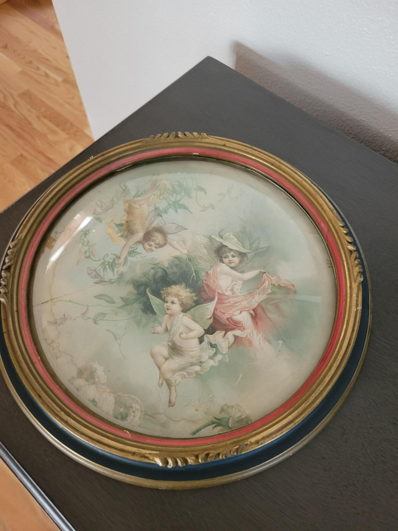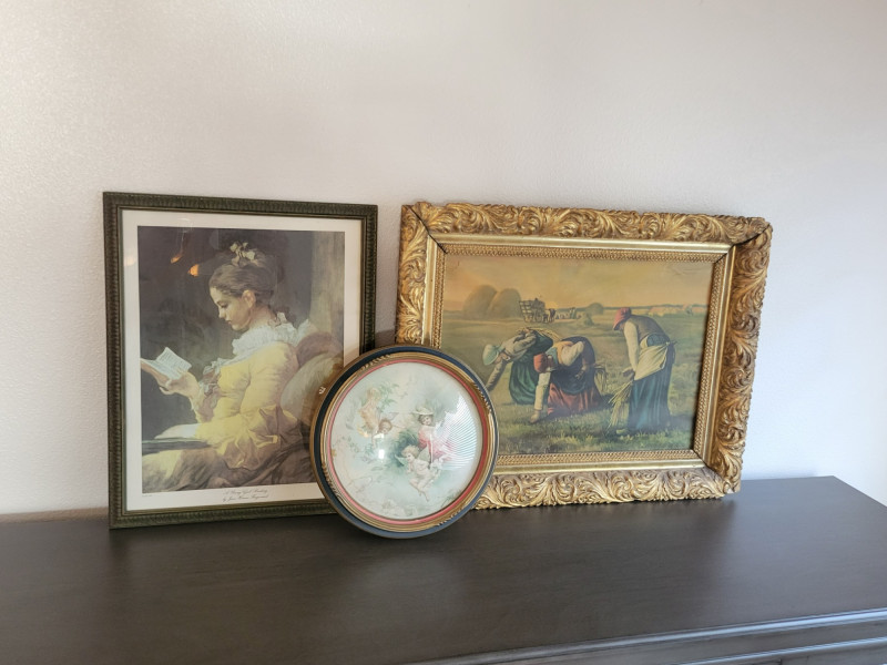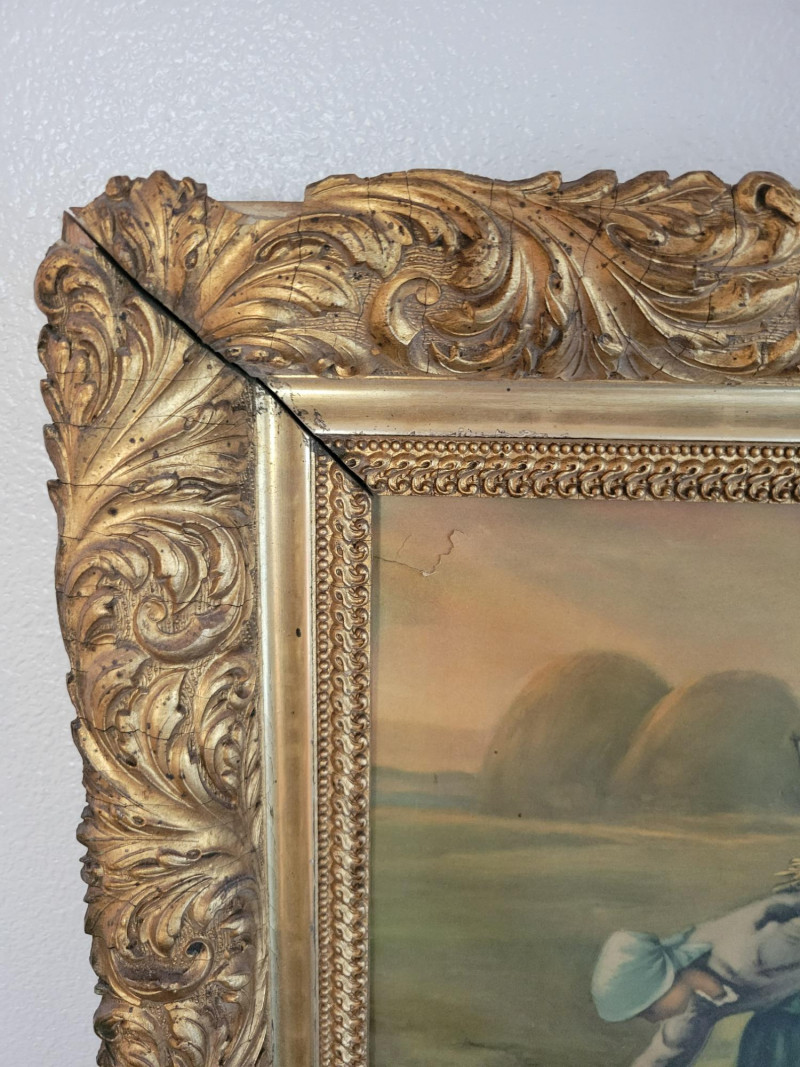 A charming collection of three framed are prints: "A Young Girl Reading" by Jean Honore Fragonard - Classic Rococo portrait of quiet contemplation, in a textured vintage frame. (19.5 H x 15.5 W) "The Gleaners" by Jean Francois Millet (c. 1857) - Realist depiction of women gleaning after harvest, in ornate gilt frame with richly scrolled molding. (26 W x 20 H). Frame shows some age with splits and surface cracks to the ornate molding; print has light creasing but displays beautifully. (See photos). Round cherub/fairy print - Romantic chromolithograph-style depiction of cherubic figures, set in a round gold-tone frame with blue and red trim. (12 inch diameter). Frame and print show light age-related wear and spotting. All pieces show expected wear consistent with age, but these do not detract from the antique charm and presence of the grouping. A lovely decorative lot that brings together Rococo elegance, Realist grit and Victorian Romanticism - perfect for collectors or vintage decor.