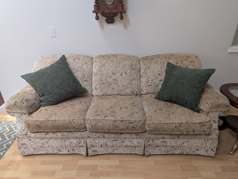 This lovely sofa offers both comfort and style. Upholstered in a neutral fabric with an intricate paisley-inspired design, it blends beautifully into a variety of decors. The sofa is in good condition for its age, with only minor wear consistent with use, and it comes from a smoke-free home. Plush cushioning and detailed upholstery make it both inviting and visually appealing. Dimensions: 86 in L (from arm rest to arm rest) 67.5 in L (from seat to seat) 19 in H (from floor to seat) 31 in H (from floor to back) 20 in W (seat depth) A timeless piece that works equally well as everyday seating or as a decorative accent in your living space.