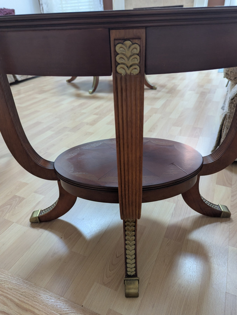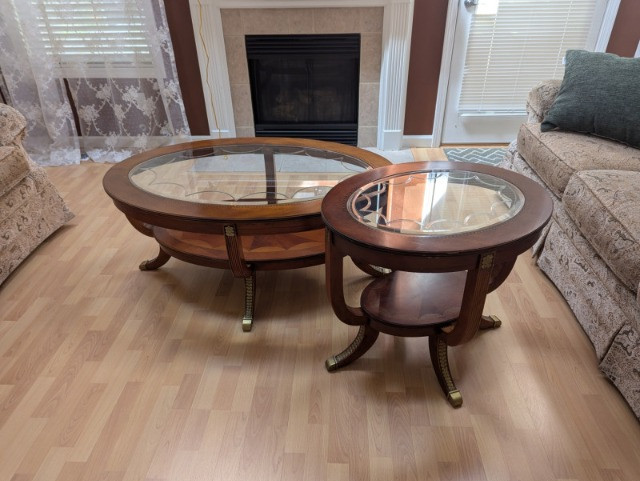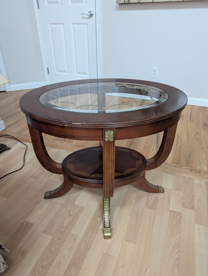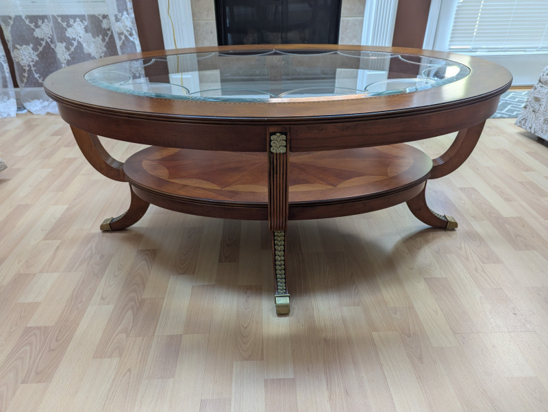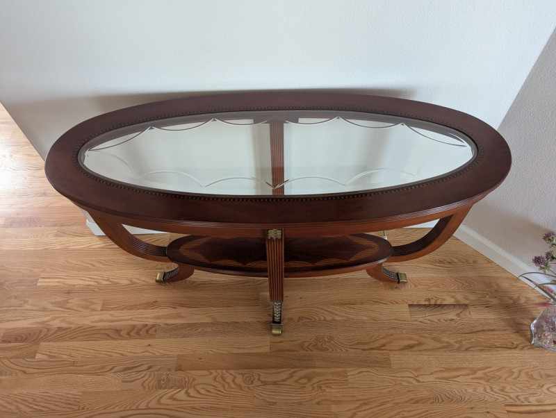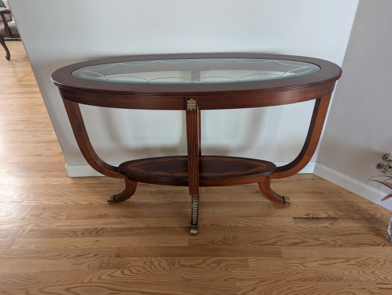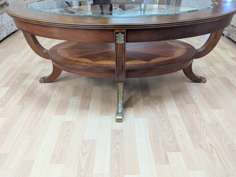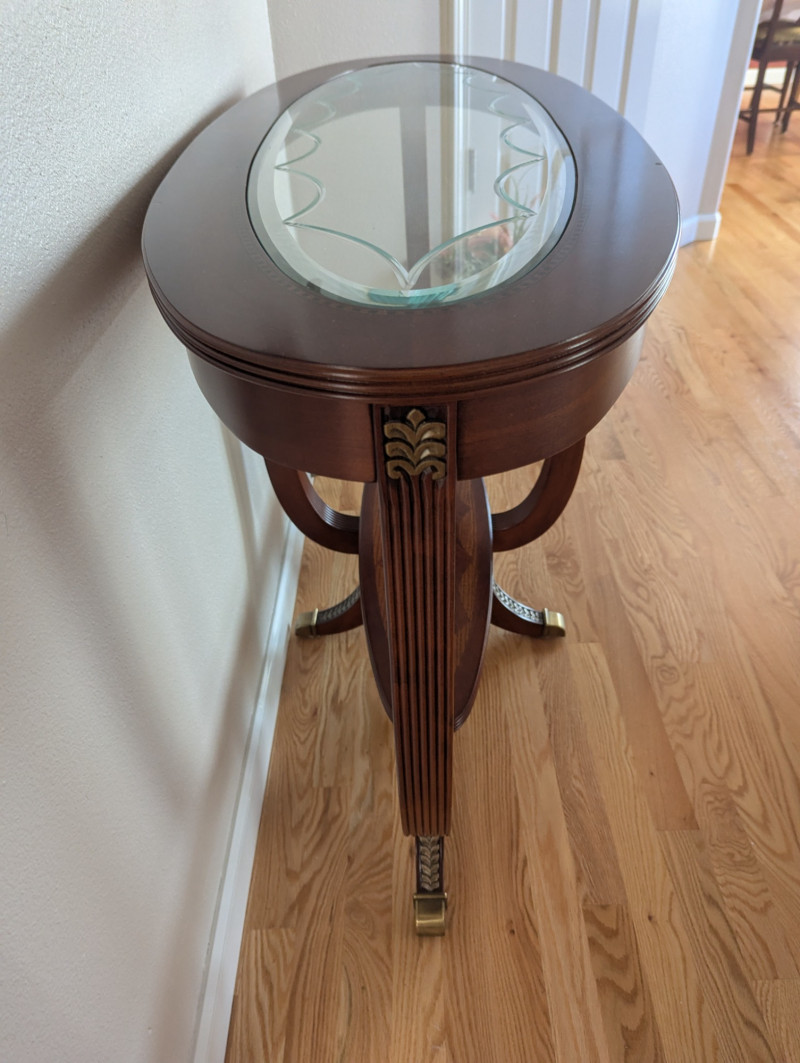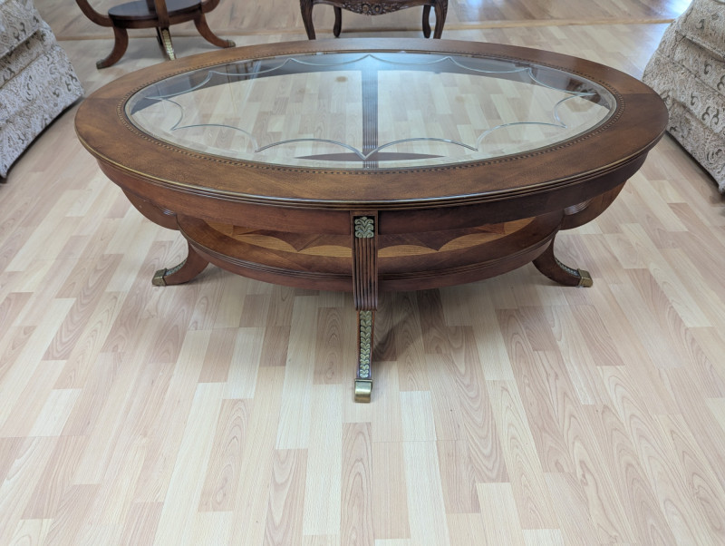 Bring timeless sophistication into your home with this remarkable trio of "French Empire-Style" tables. A complete matching set rarely found together. Crafted with elegance and precision, each piece features a beveled, etched glass to resting on a richly finished wood base, accented with ornate brass paw feet and rosette medallions. The intricate mix of carved wood details creates heirloom-quality presence worthy of both collectors and design enthusiasts. This set is more than furniture, it's a statement. Perfect for everyday living, whether adding charm to an apartment, enhancing a cozy living space or completing a curated home design. Versatile and refined - use the coffee table as a stylish anchor for your seating area, the console as a graceful accent along a wall or hallway, and the side table beside your favorite chair. Their classic design blends effortlessly into both modern and traditional interiors, bringing instant character and elegance to any setting. smaller side table is: 28L x 22W x 2ft H coffee table: 45.75 x 30w x 20H tall hallway/sofa table: 45.5L x 18W x 30H A rare opportunity to acquire a complete Empire-style ensemble with lasting style and craftsmanship. Truly an investment in beauty and history.