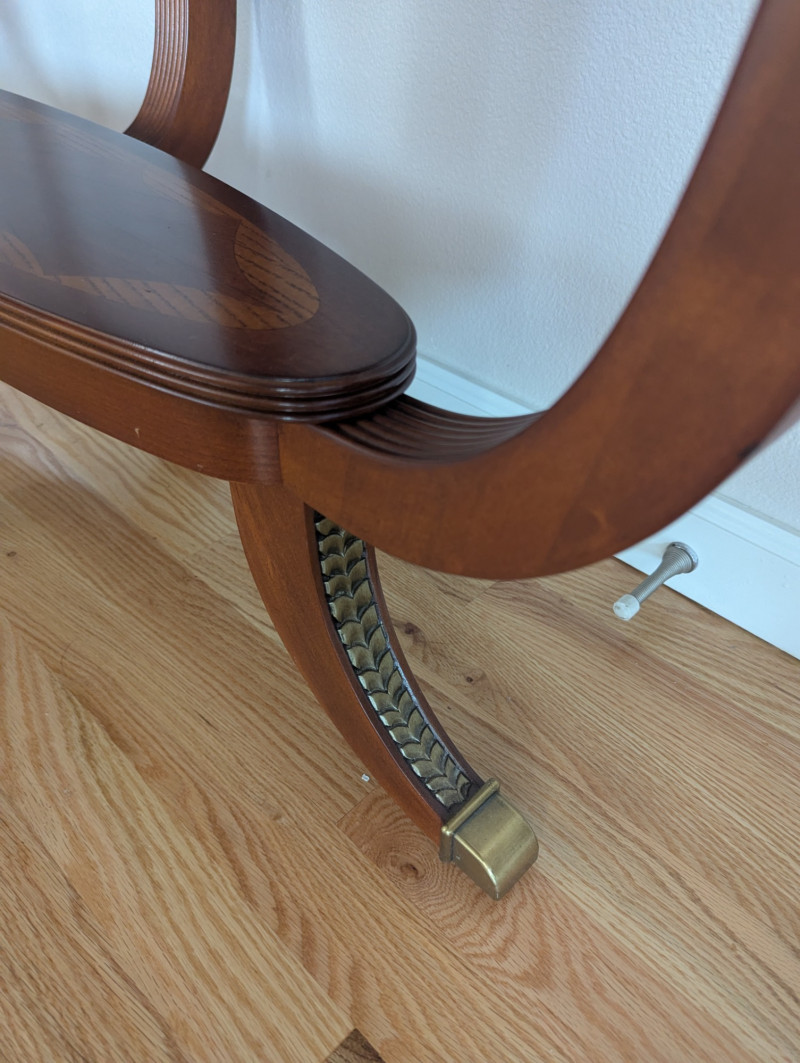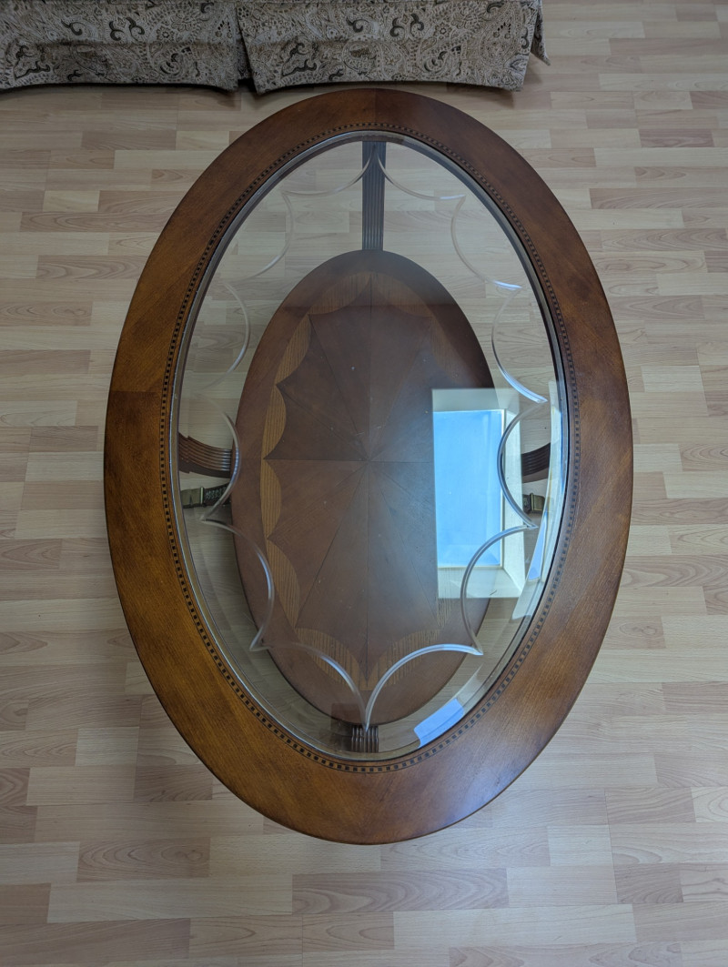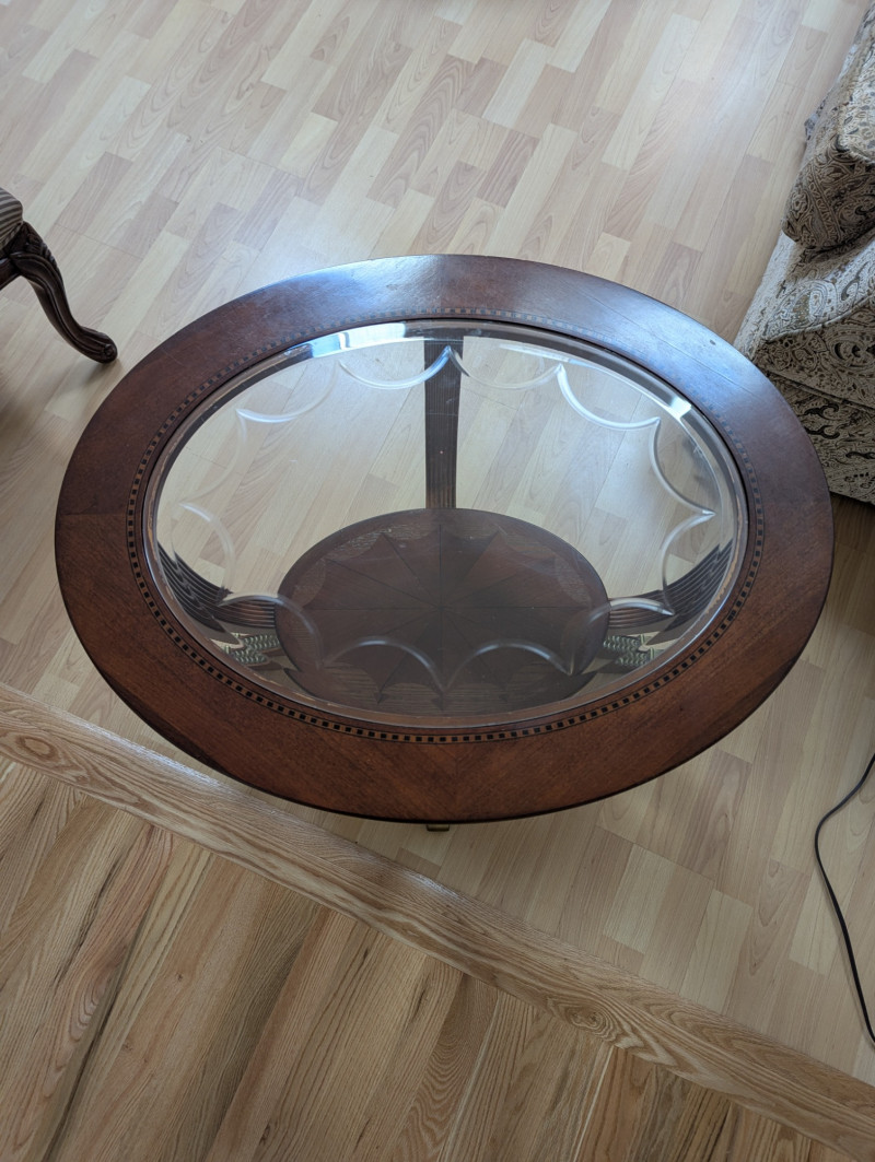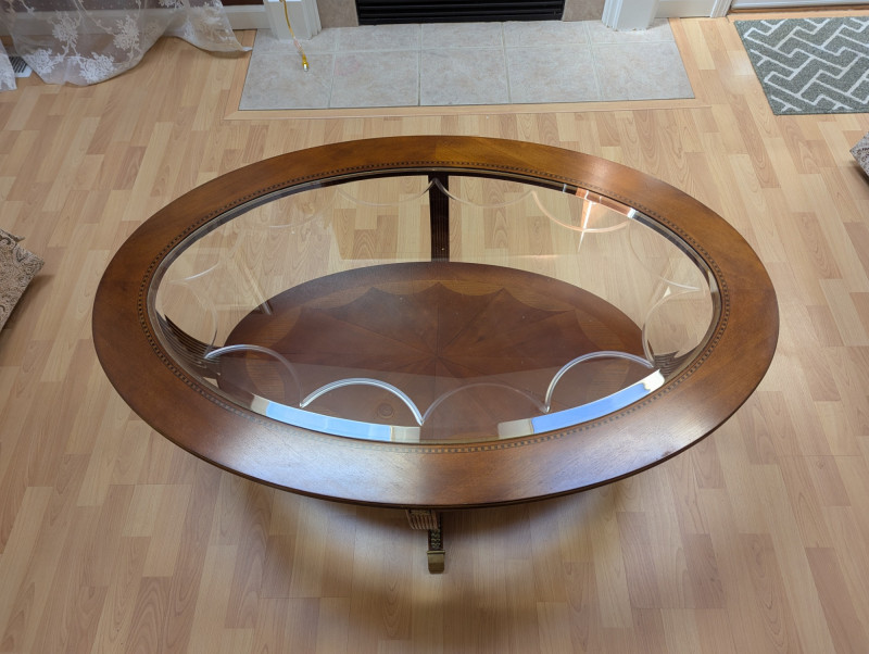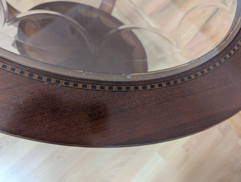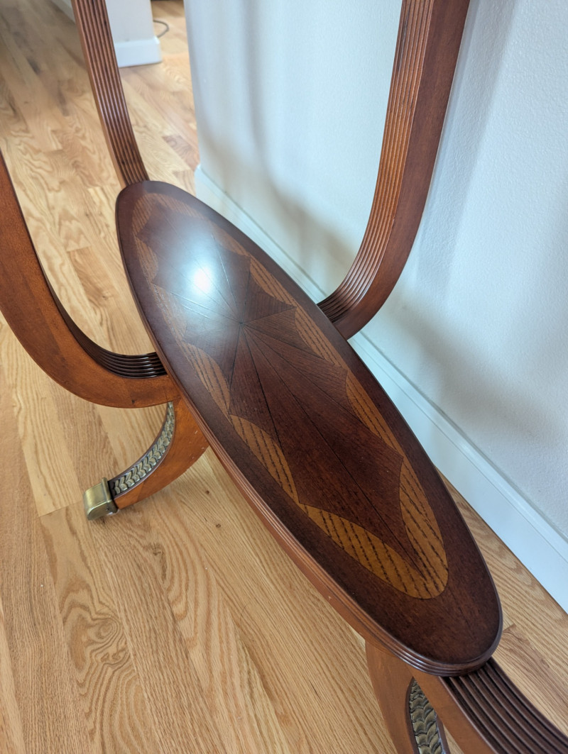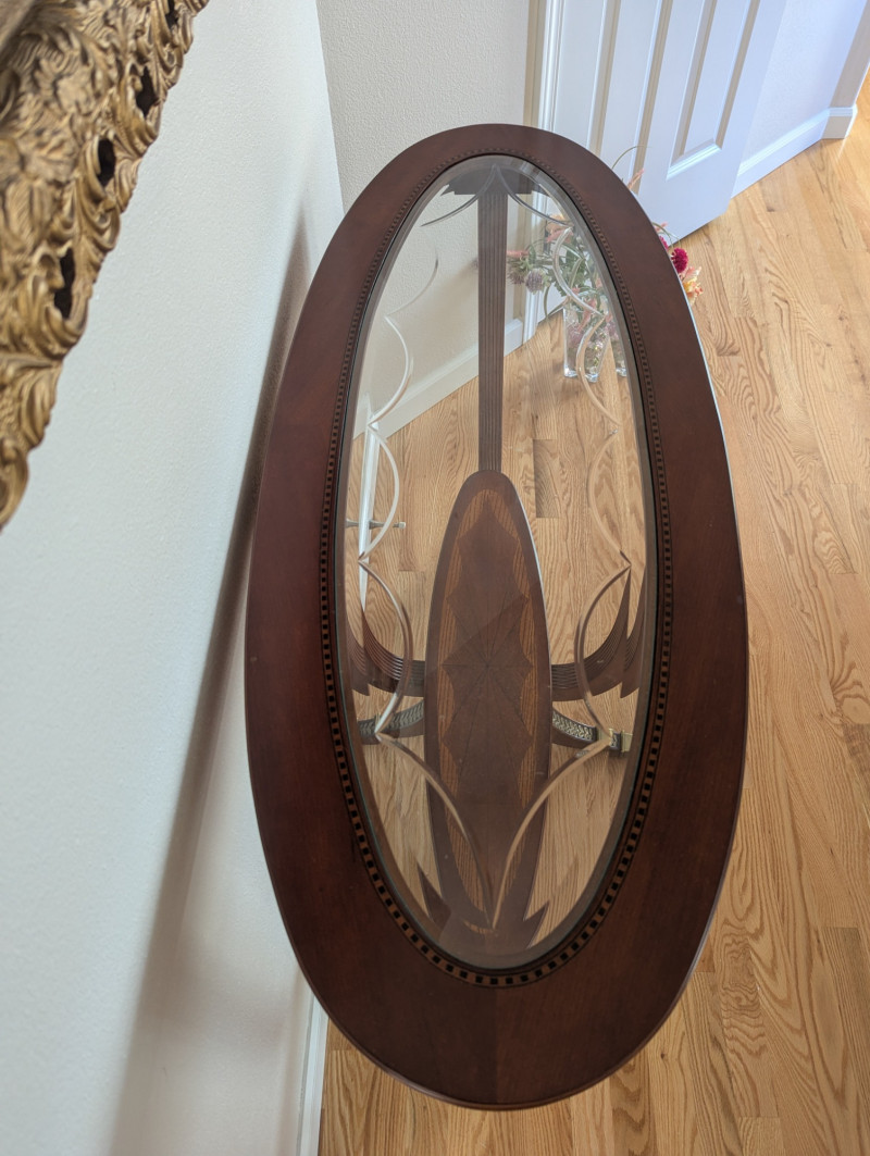 Bring timeless sophistication into your home with this remarkable trio of "French Empire-Style" tables. A complete matching set rarely found together. Crafted with elegance and precision, each piece features a beveled, etched glass to resting on a richly finished wood base, accented with ornate brass paw feet and rosette medallions. The intricate mix of carved wood details creates heirloom-quality presence worthy of both collectors and design enthusiasts. This set is more than furniture, it's a statement. Perfect for everyday living, whether adding charm to an apartment, enhancing a cozy living space or completing a curated home design. Versatile and refined - use the coffee table as a stylish anchor for your seating area, the console as a graceful accent along a wall or hallway, and the side table beside your favorite chair. Their classic design blends effortlessly into both modern and traditional interiors, bringing instant character and elegance to any setting. smaller side table is: 28L x 22W x 2ft H coffee table: 45.75 x 30w x 20H tall hallway/sofa table: 45.5L x 18W x 30H A rare opportunity to acquire a complete Empire-style ensemble with lasting style and craftsmanship. Truly an investment in beauty and history.