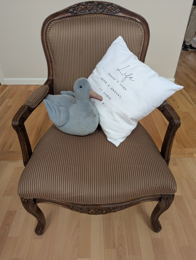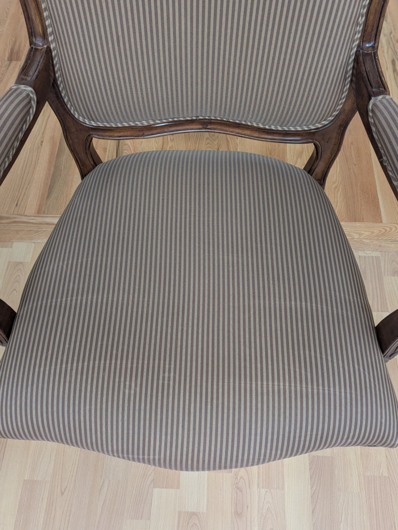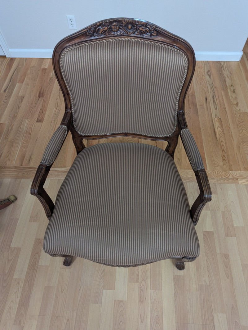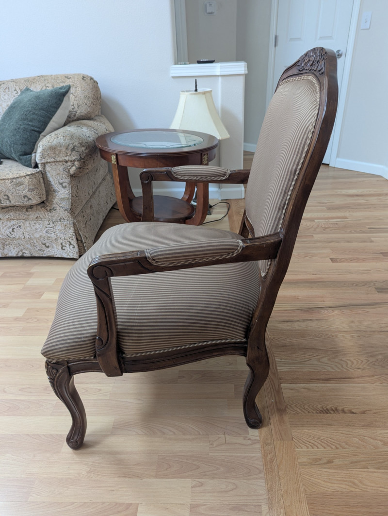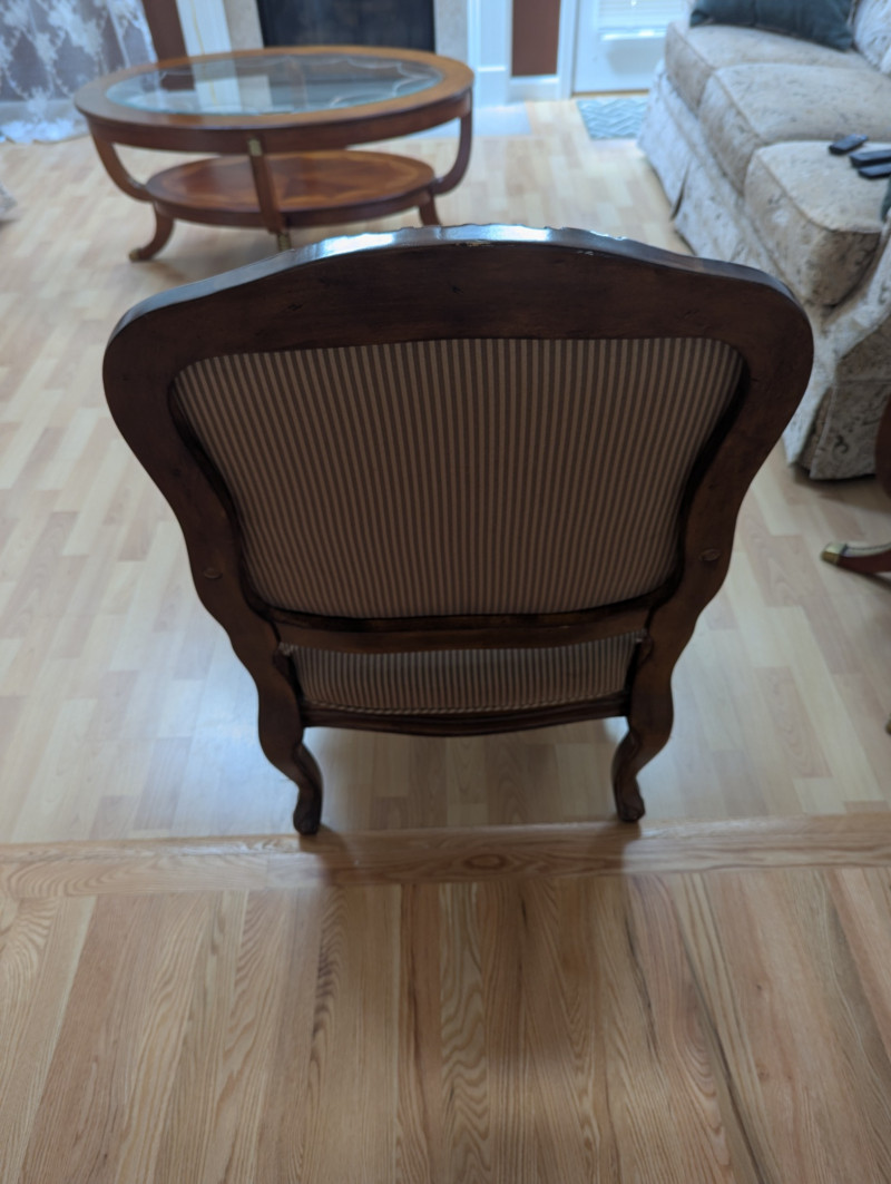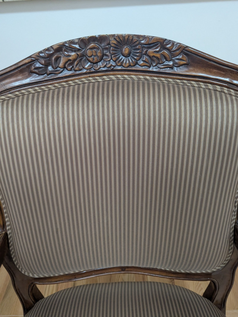 A beautiful unmarked accent chair. It's a very masculine and feminine chair all at the same time with its sleek pin striped fabric and it's dainty floral etched design on top of the back rest. It would be great or a lounge, living room, guest room or office. Pillows are included. Dimensions: 39H (floor to back) 17H (floor to seat) Seat is 26W (from armrest to armrest) 23W x 23D Back is 22.5H
