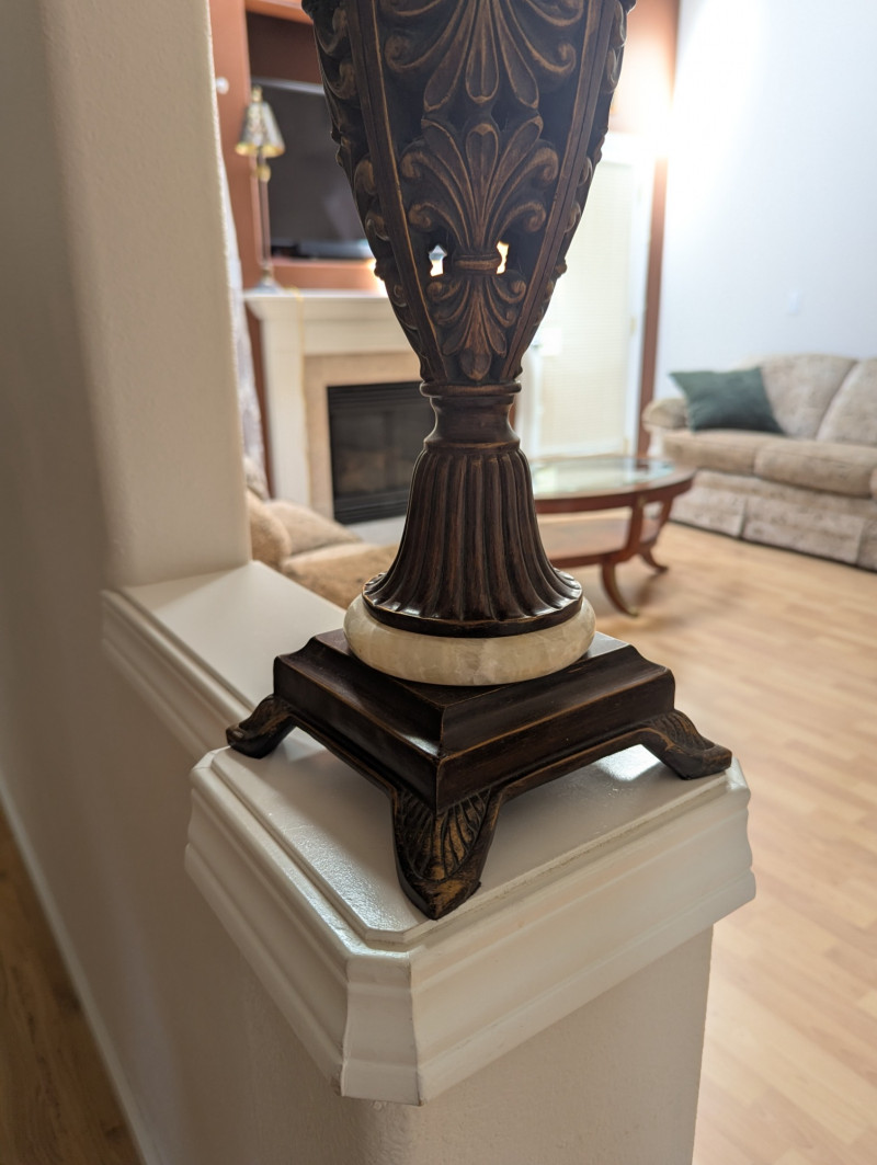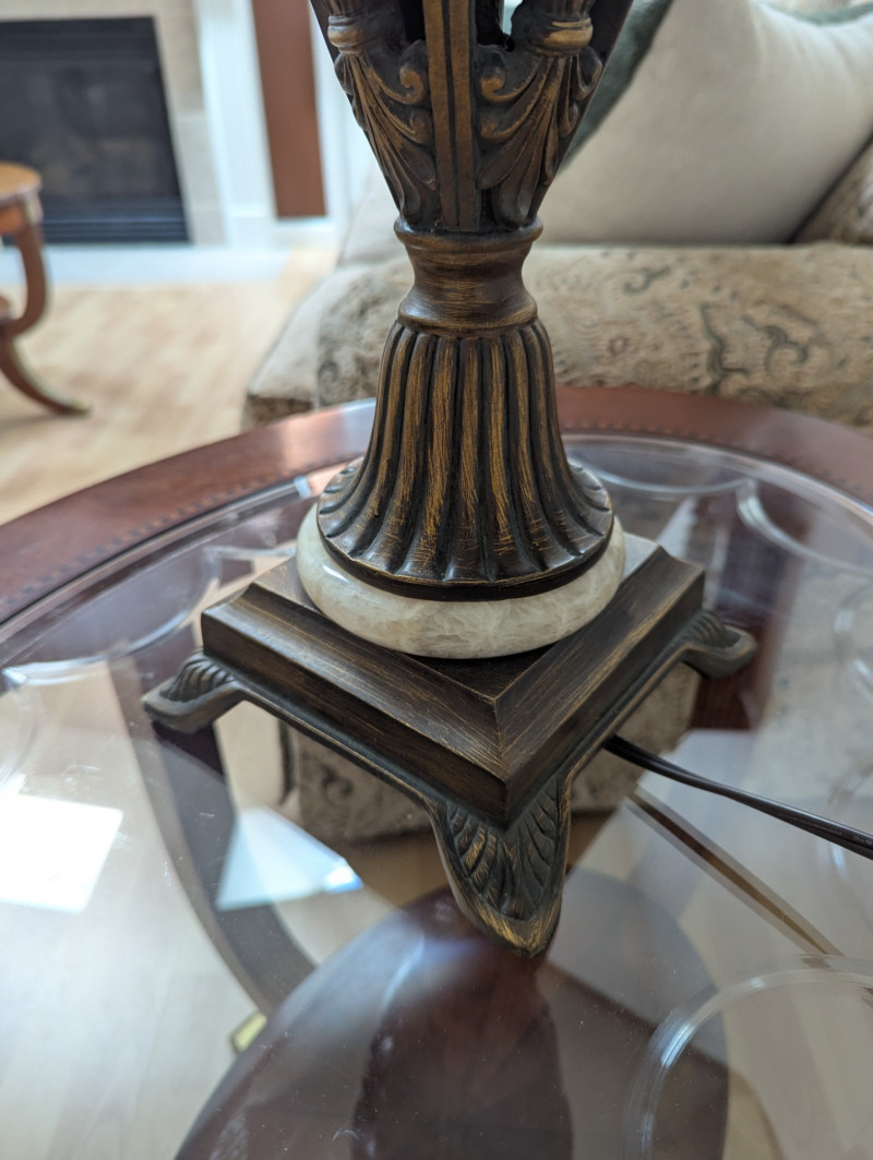 A sophisticated pair of table lamps showcasing sculpted bases with fluted columns, scrolled openwork, and elegant leaf motifs. Finished in deep bronze with warm golden accents, each lamp rests on a tiered square plinth, adding weight and presence. The design is beautifully balanced with classic cream shades that diffuse a soft, inviting glow. Dimensions (each): 34.5 in H x 7 in W (at the base) x 14 in W (shade) Both decorative and functional, these lamps are statement pieces - perfect for elevating a living room, bedroom, or study with timeless style and refined character.