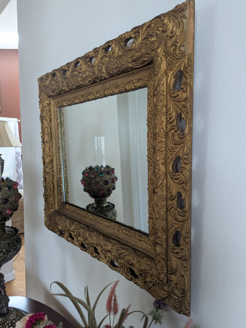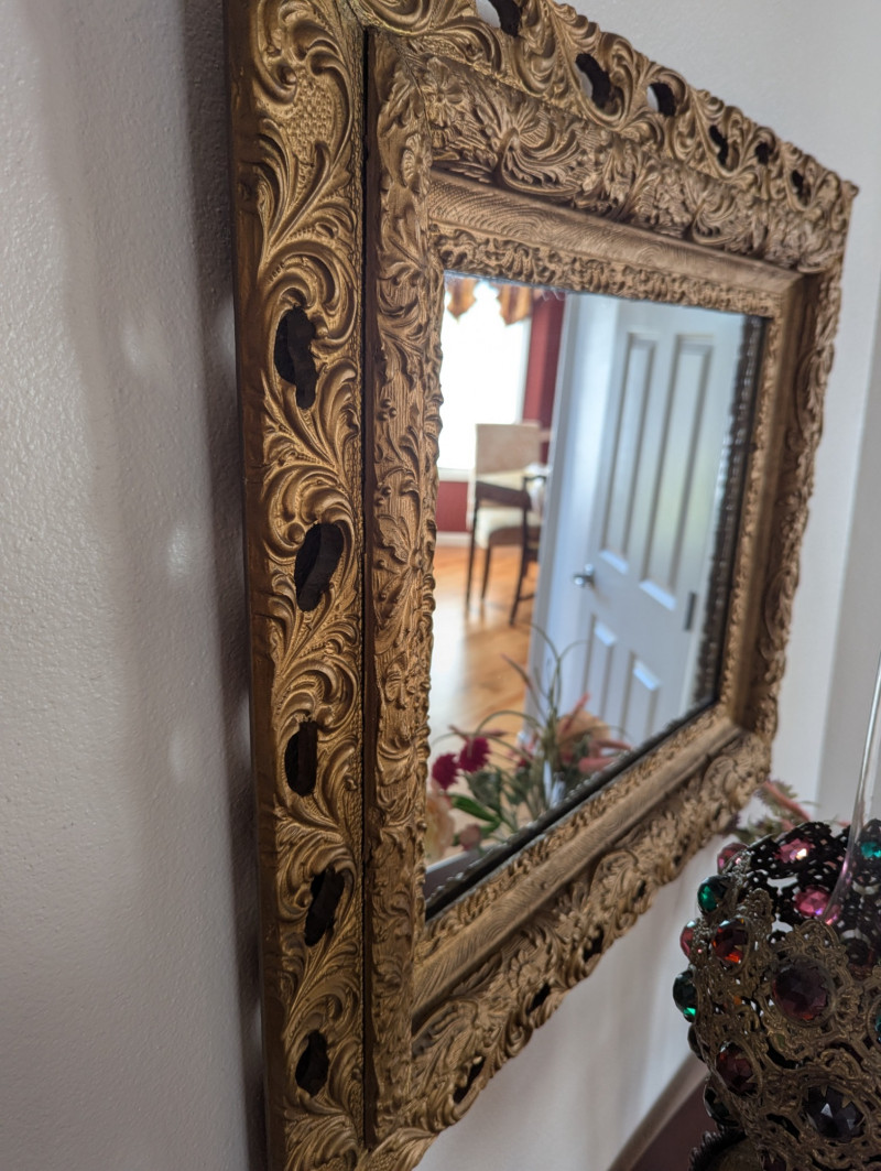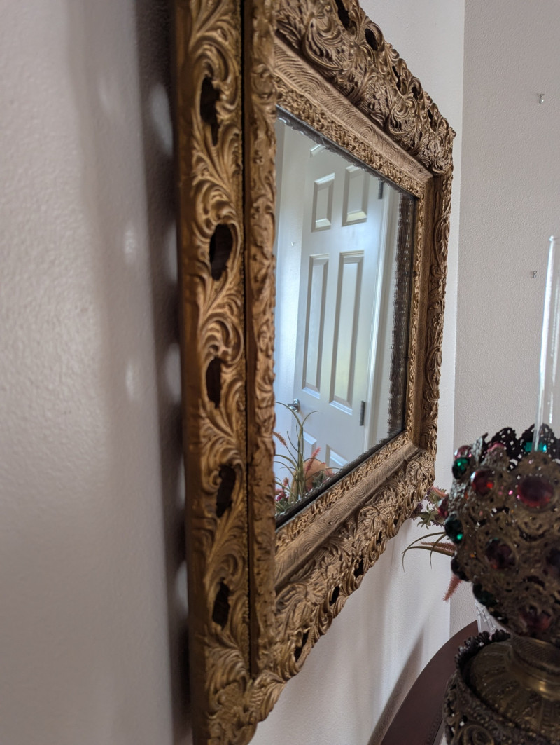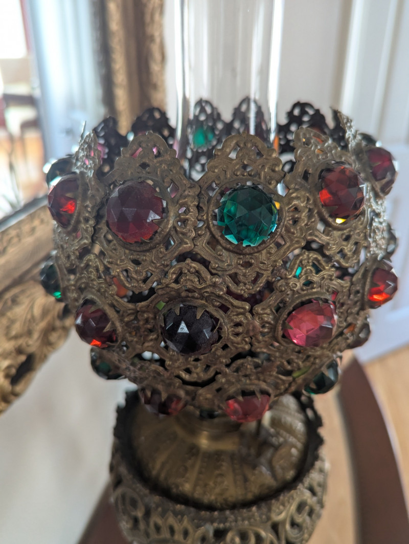 This dazzling trio of vintage decor is sure to turn heads, featuring an opulent gold-style mirror with richly carved scrolling frame (approx. 26.5 in H x 30 in W), a dramatic brass-style jeweled lamp encrusted with vibrant ruby-red and emerald-green cabochons that give it a crown-like presence (approx. 30 in H x 6 in W), and a sparkling cut-glass vase, possibly crystal, measuring 8 in H x 4.5 in W. Together these pieces bring a touch of old grandeur and eclectic vintage flair - a ready-made statement set for an entryway, hallway, or living room that adds instant glamour and character. Please note: The table shown in photos is NOT included and is offered separately in Lot # 48.