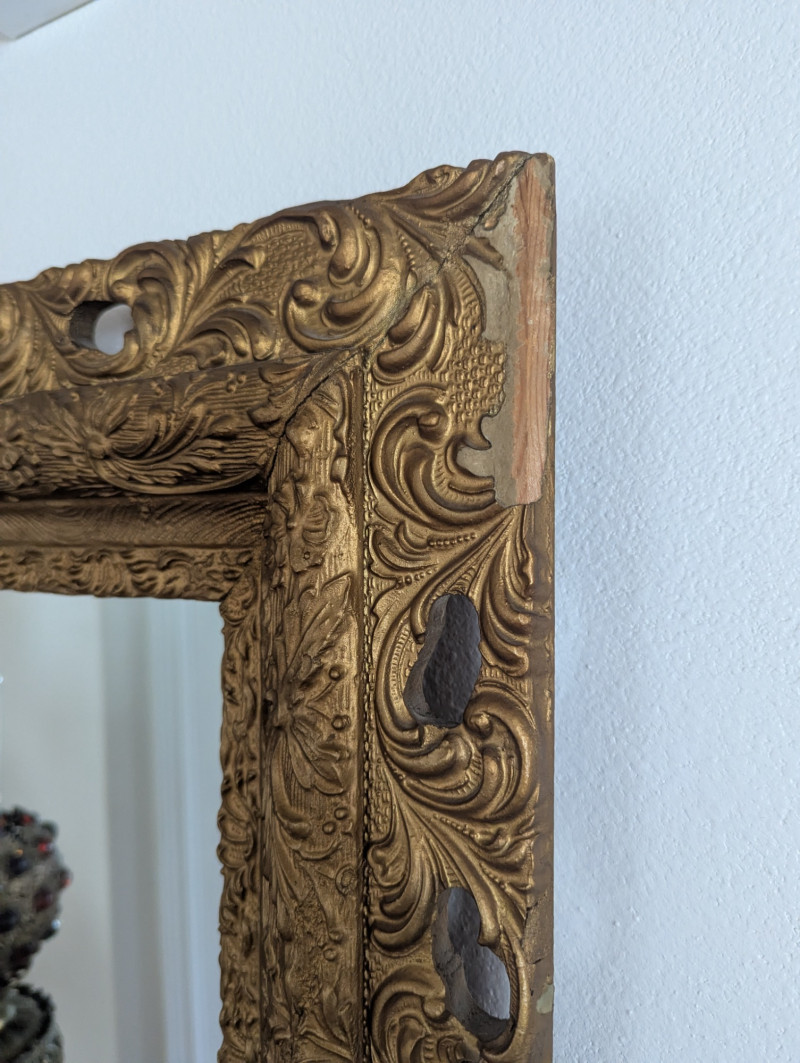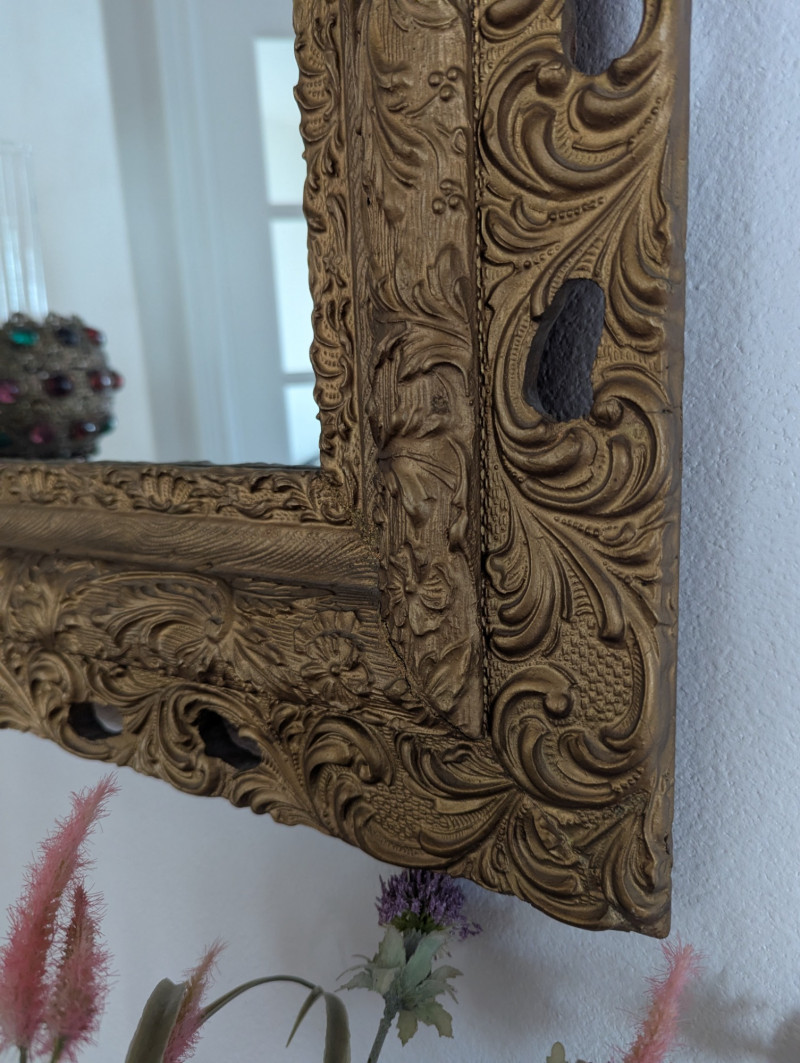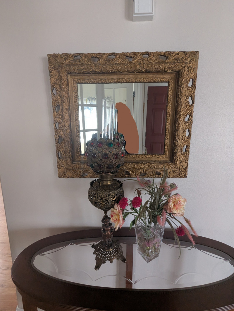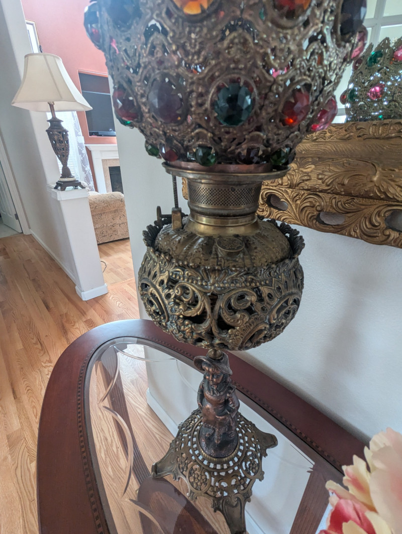 This dazzling trio of vintage decor is sure to turn heads, featuring an opulent gold-style mirror with richly carved scrolling frame (approx. 26.5 in H x 30 in W), a dramatic brass-style jeweled lamp encrusted with vibrant ruby-red and emerald-green cabochons that give it a crown-like presence (approx. 30 in H x 6 in W), and a sparkling cut-glass vase, possibly crystal, measuring 8 in H x 4.5 in W. Together these pieces bring a touch of old grandeur and eclectic vintage flair - a ready-made statement set for an entryway, hallway, or living room that adds instant glamour and character. Please note: The table shown in photos is NOT included and is offered separately in Lot # 48.
