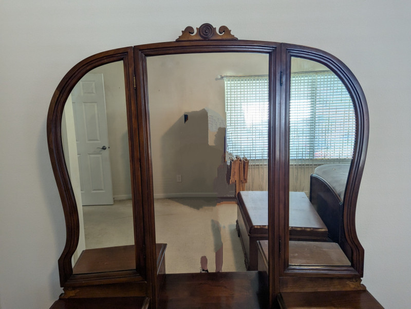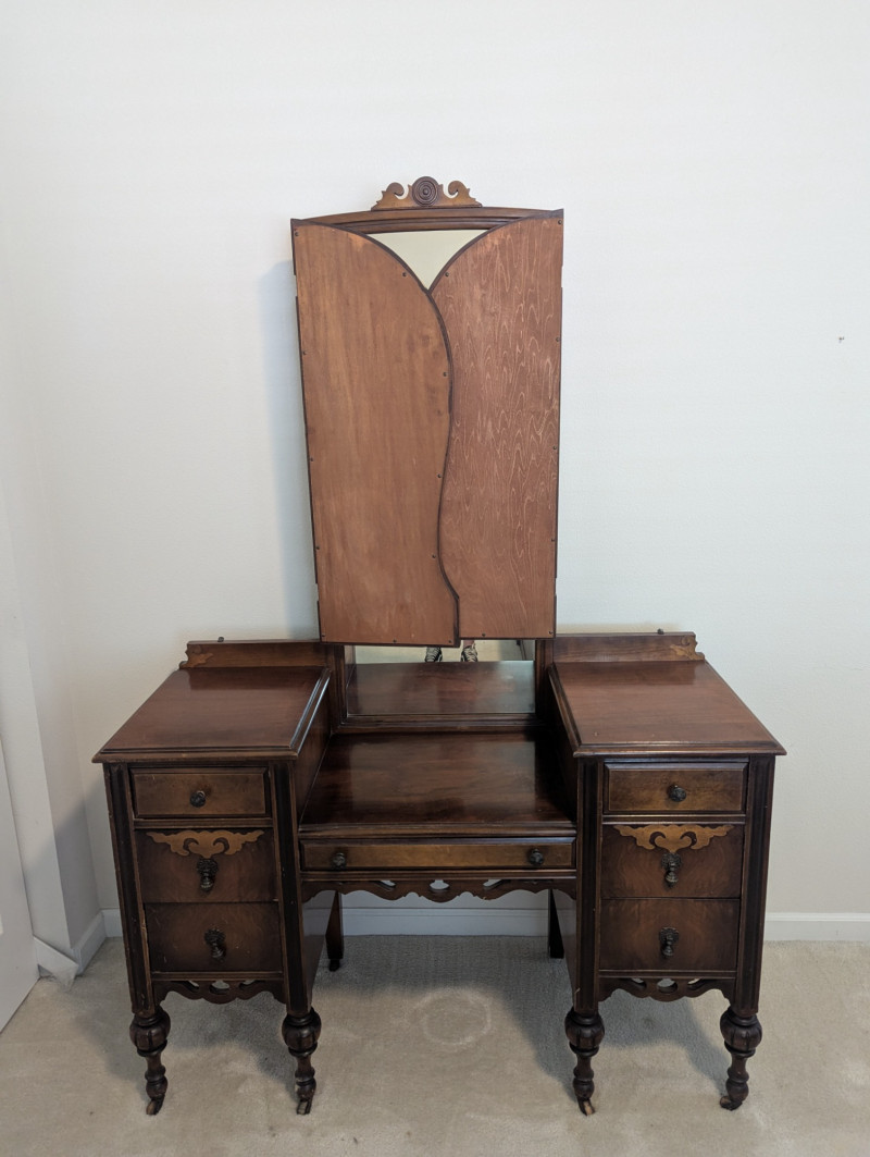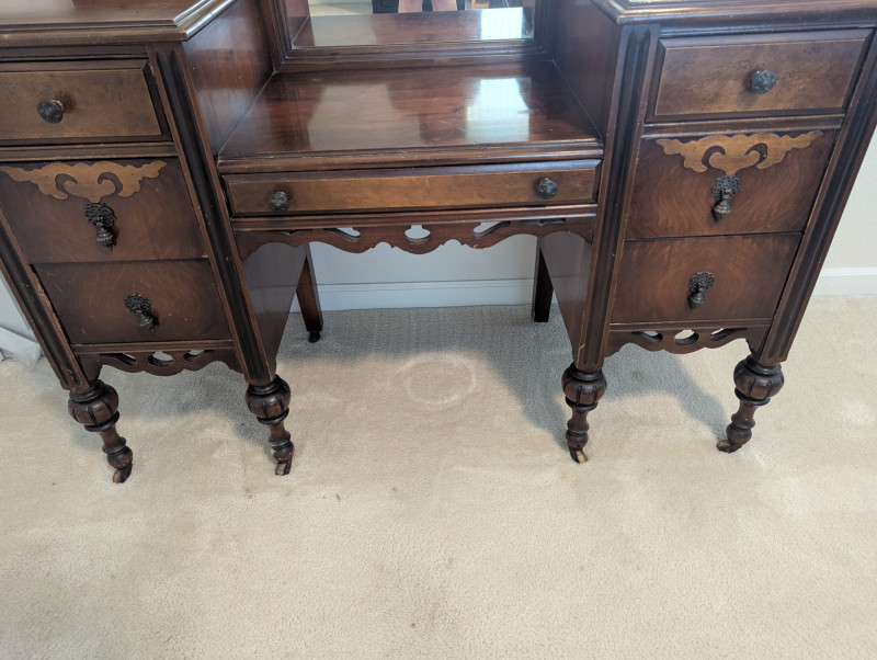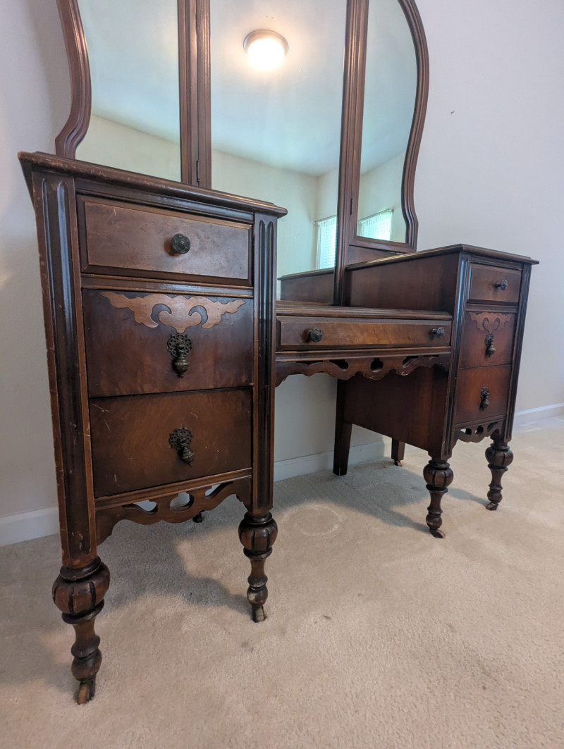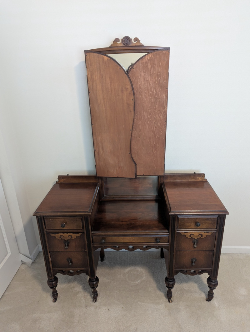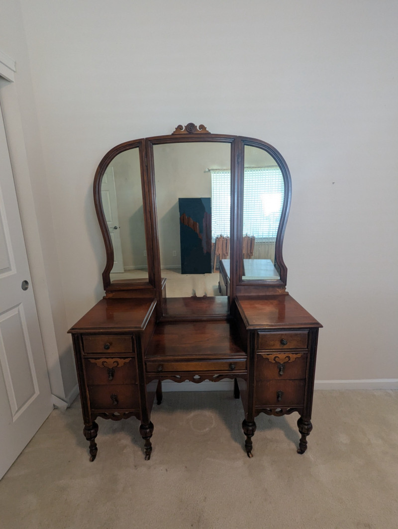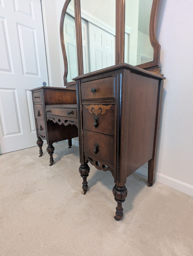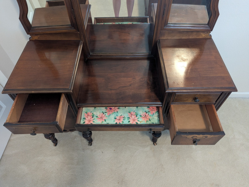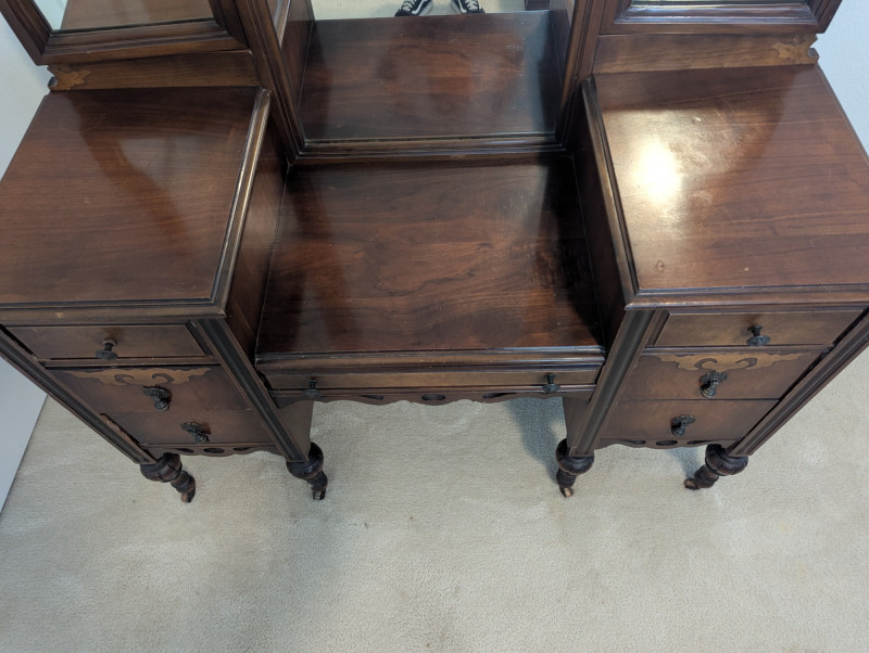 An exquisite Victorian-style hardwood vanity, richly detailed with ornate carvings , delicate inlay, and turned accents. The impressive trifold mirror features a gracefully arched center panel flanked by two adjustable side mirrors, folding inward for ease of use and transport. The vanity rests on elegant cabriole-style legs with original casters, a hallmark detail of fine furniture from the late 1800s to early 1900s. Measuring approx. 4 ft L x 18 in W x 67 in H, this piece offers both function and artistry, making a true statement item. A rare find that brings timeless Victorian elegance and heirloom quality into any home.