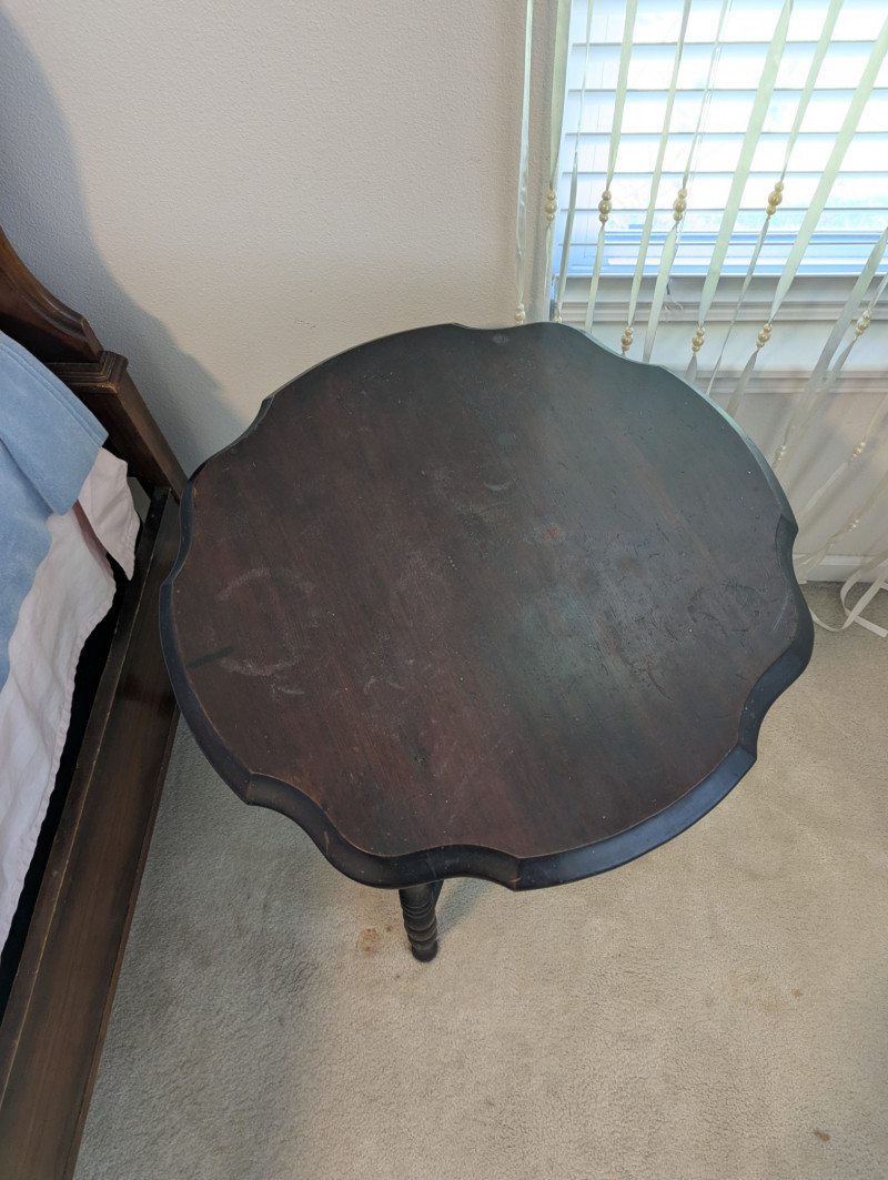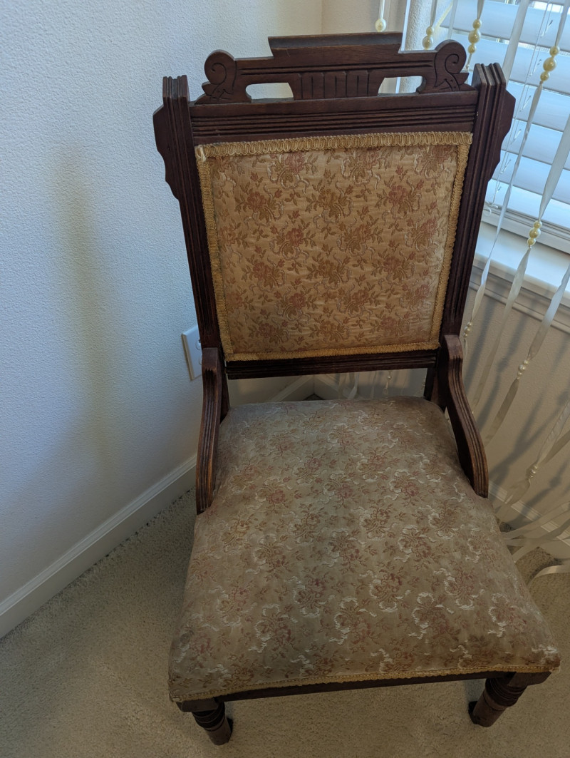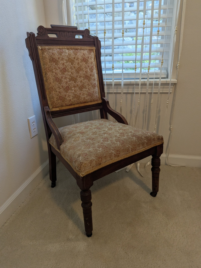 A handsome Victorian parlor chair in the Eastlake style, featuring a carved wood frame with incised detail and its original vintage upholstery. The chair is in good condition for its age and displays the clean, architectural lines that define Eastlake furniture in the late 19th century. Dimensions approx. 33 in H (floor to back), 14 in H (floor to seat), 16.5 in W and 19 in H (seat to back). Accompanying the chair is a sturdy round side table on turned legs, measuring approx. 23 in diameter x 26.5 in H, offering a practical yet complementary accent. Together, the set reflects the charm and craftsmanship of the Victorian era, making a graceful addition to any room or display. Table: 23 in Diameter and 26.5H