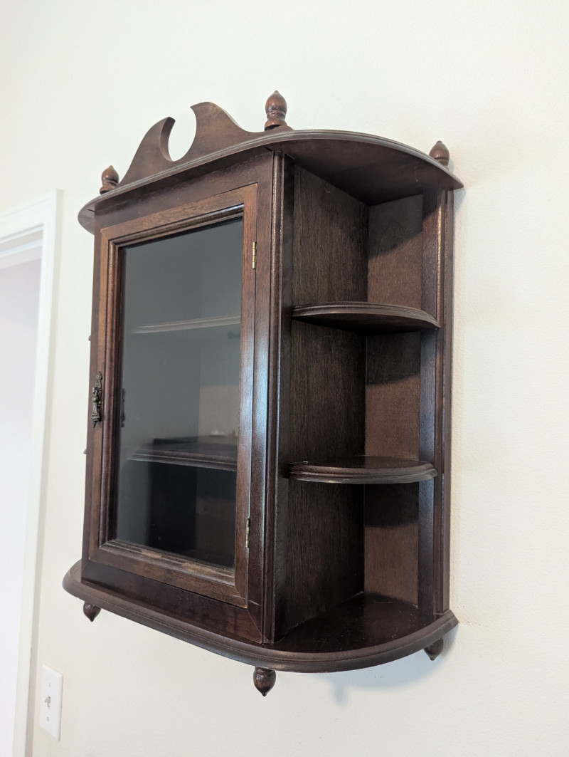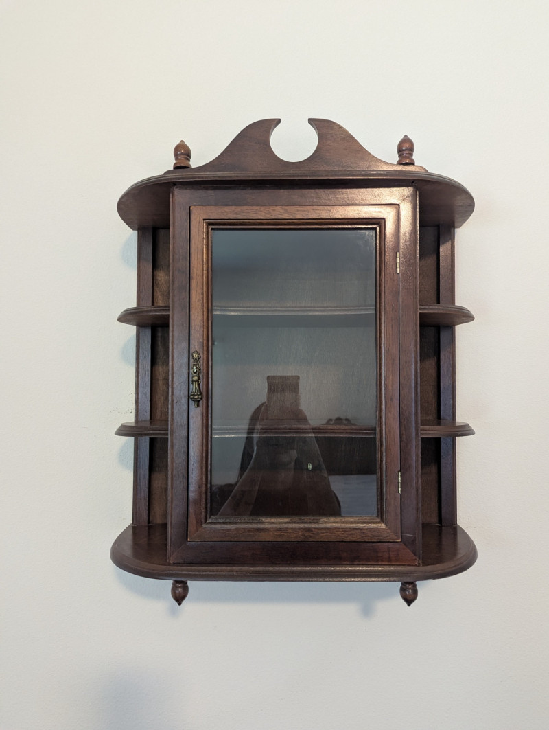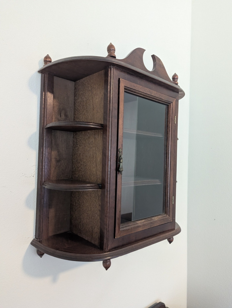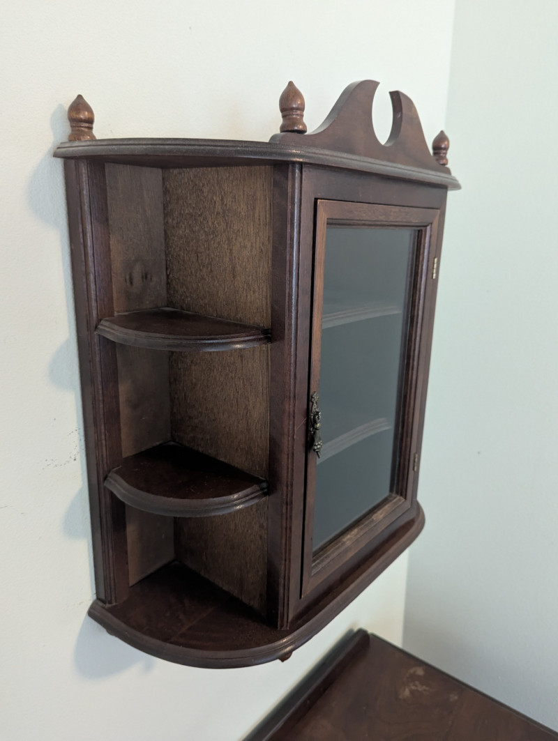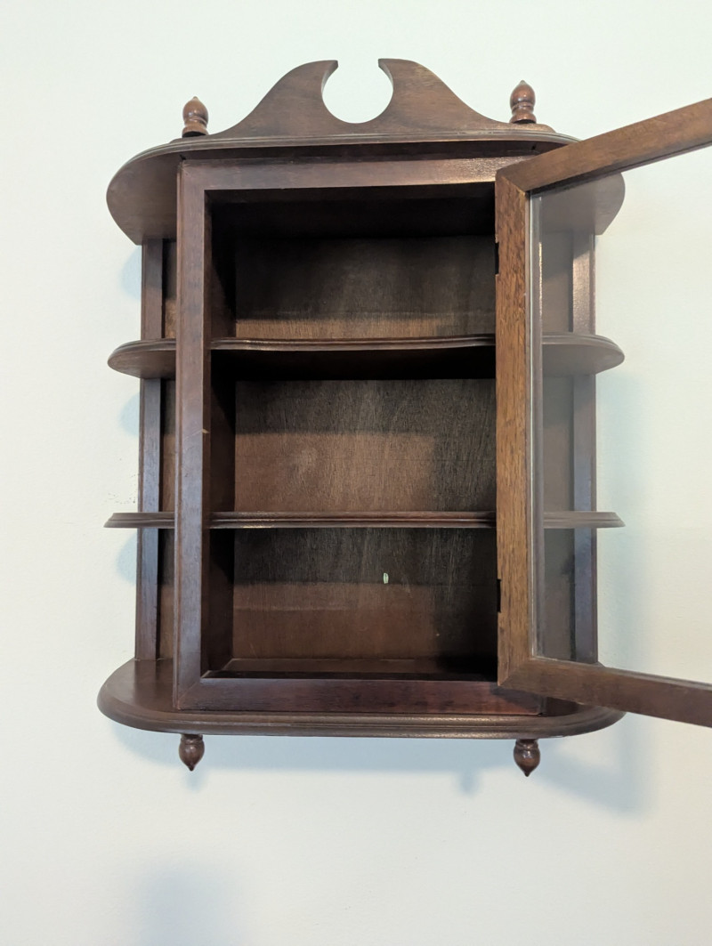 Charming vintage wooden wall curio cabinet with a glass front door, decorative crest, and side shelves for added display. Beautifully crafted with turned finials and a warm patina, this versatile piece is perfect for showcasing collectibles, small books, or decorative accents & keepsakes. Compact in size yet full of character, it works equally well in a kitchen, hallway, bedroom, or living room. In very good condition and solidly made, ready to hang and enjoy. Dimensions: 18 in L x 7.75 in D x 21 in H