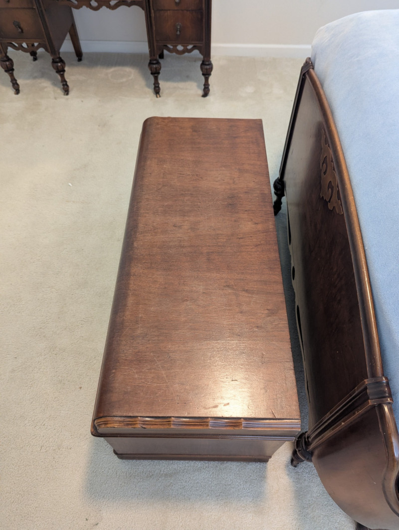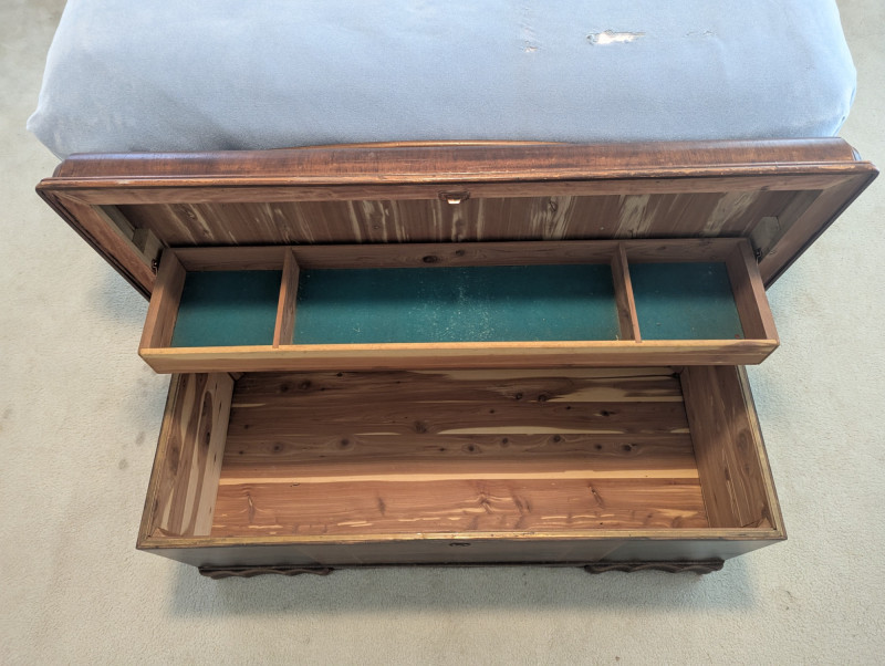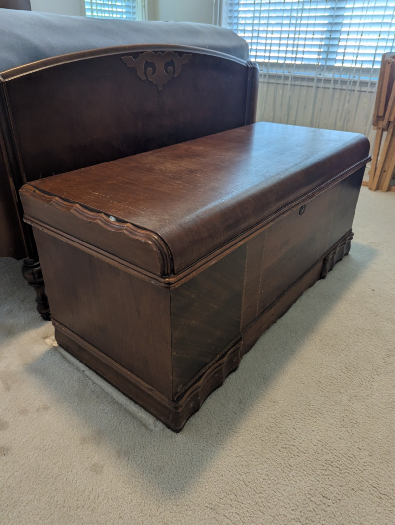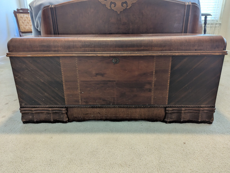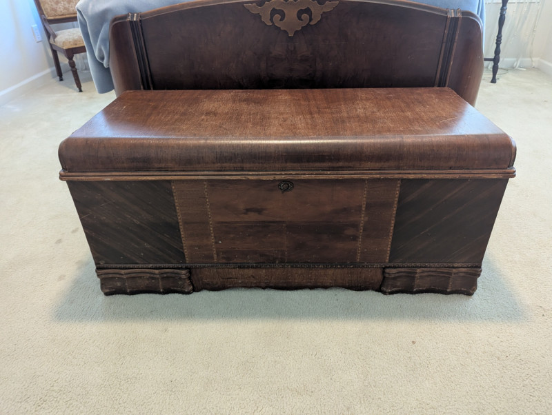 A timeless storage piece with classic appeal, this Montgomery Ward & Co. cedar chest is in very good condition and built with impressive weight and sturdiness. Its rich wood grain and smooth lines make it both practical and decorative, perfect for storing blankets, toys, or treasured keepsakes. Dimensions: 44 in L x 18 in W x 19 in H Please note: Bed shown in photos is NOT included, Chest only.