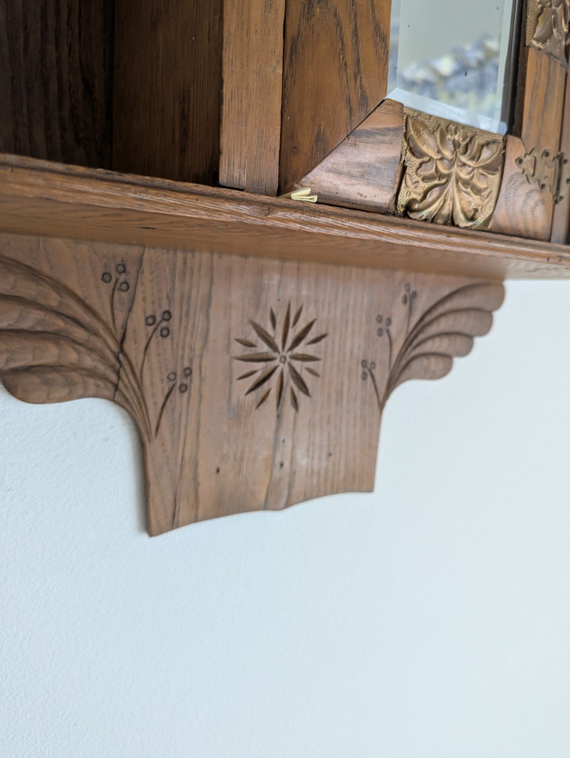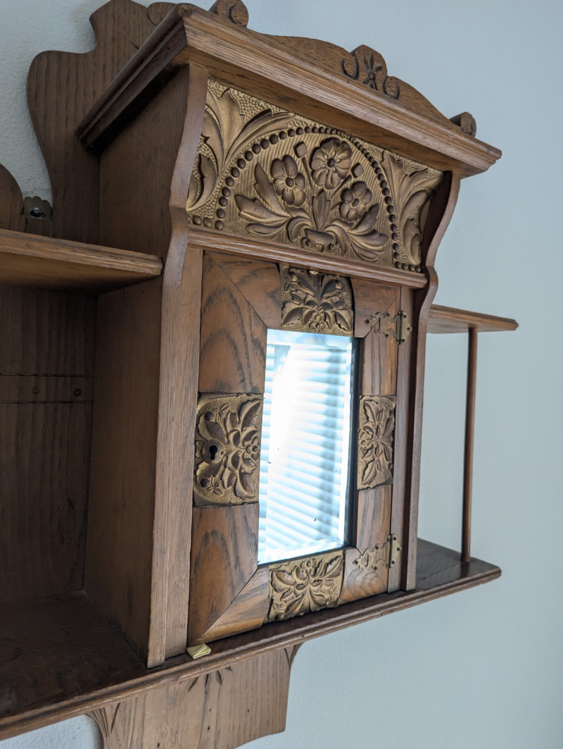 An absolute gorgeous piece that would look great in and part of your home. It has very detailed accents, possibly hand carved/stamped. It's solid wood with brass/copper sheets inlaid on the front. Dimensions are: 20W x 6.75D x 29H