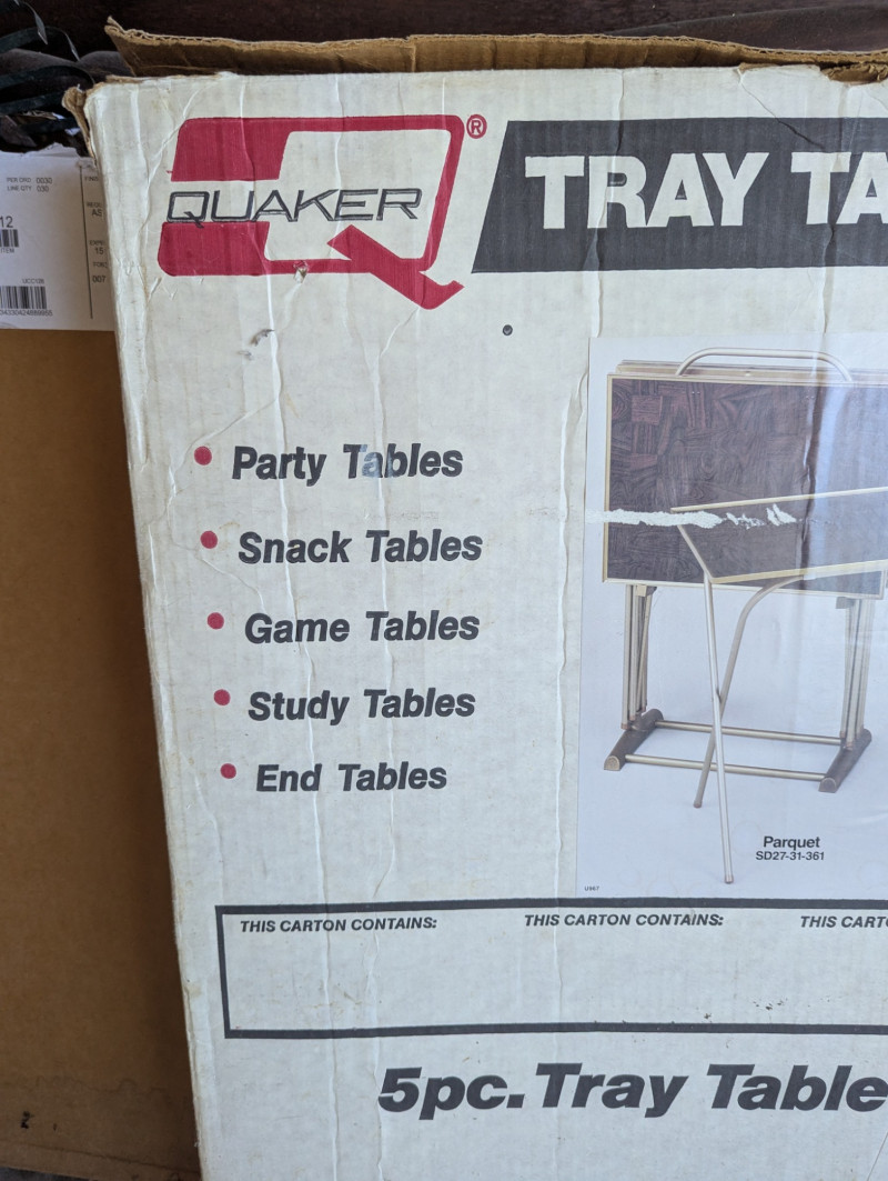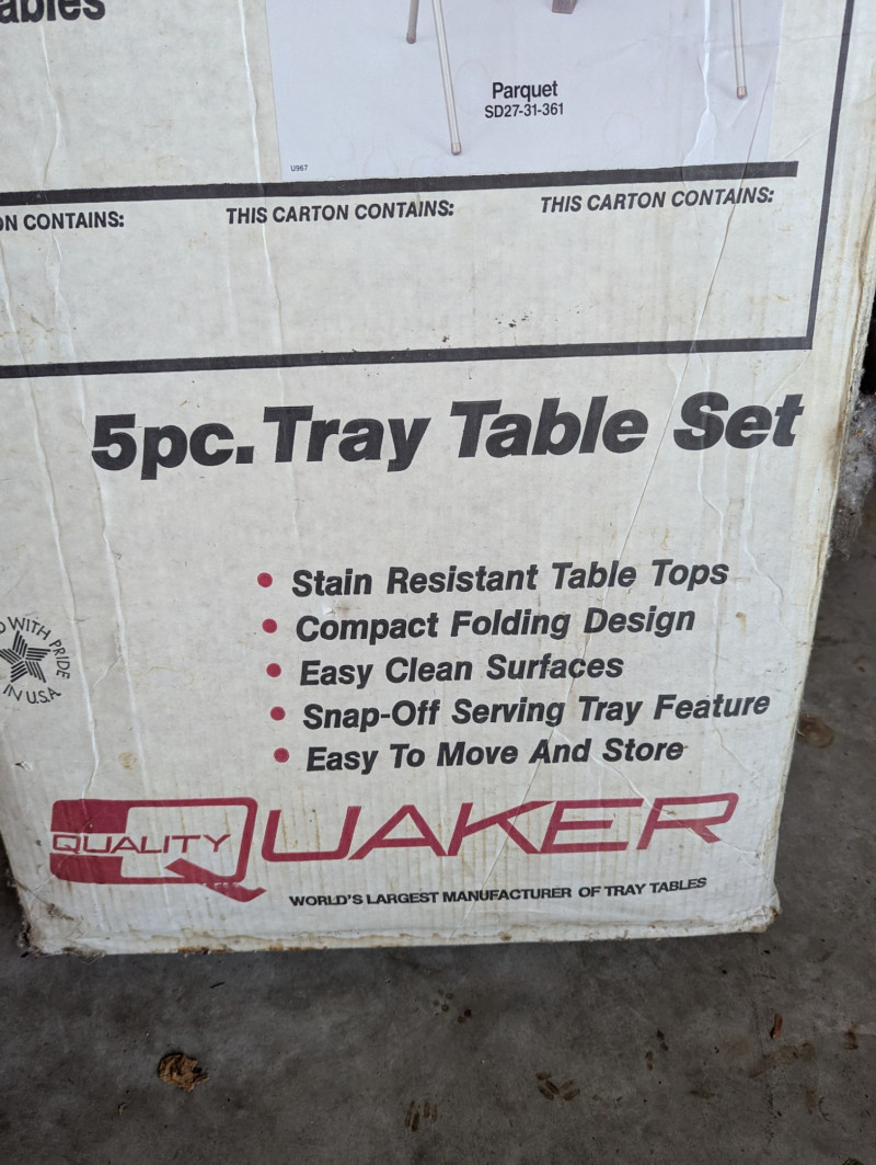 Awesome, lightweight Quaker 1960's TV tray tables. Comes with 4 trays and a standing wrack. Each tray is detachable for multi use and easy cleanup and storage. They're the size of your typical TV tray but much lighter! Quaker is identified as the "WORLD'S LARGEST MANUFACTURER OF TRAY TABLES". Reviews of Quaker tray tables from decades past suggest a consistent functional design.