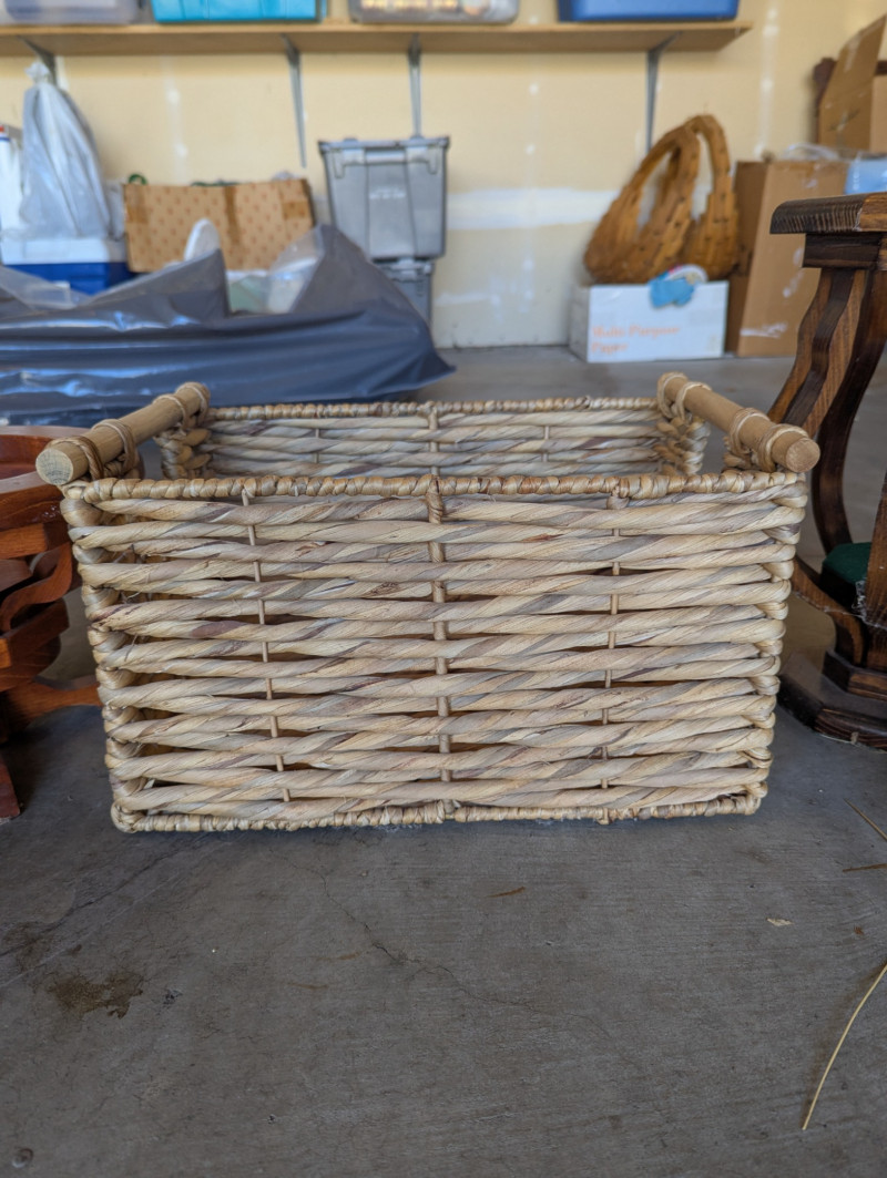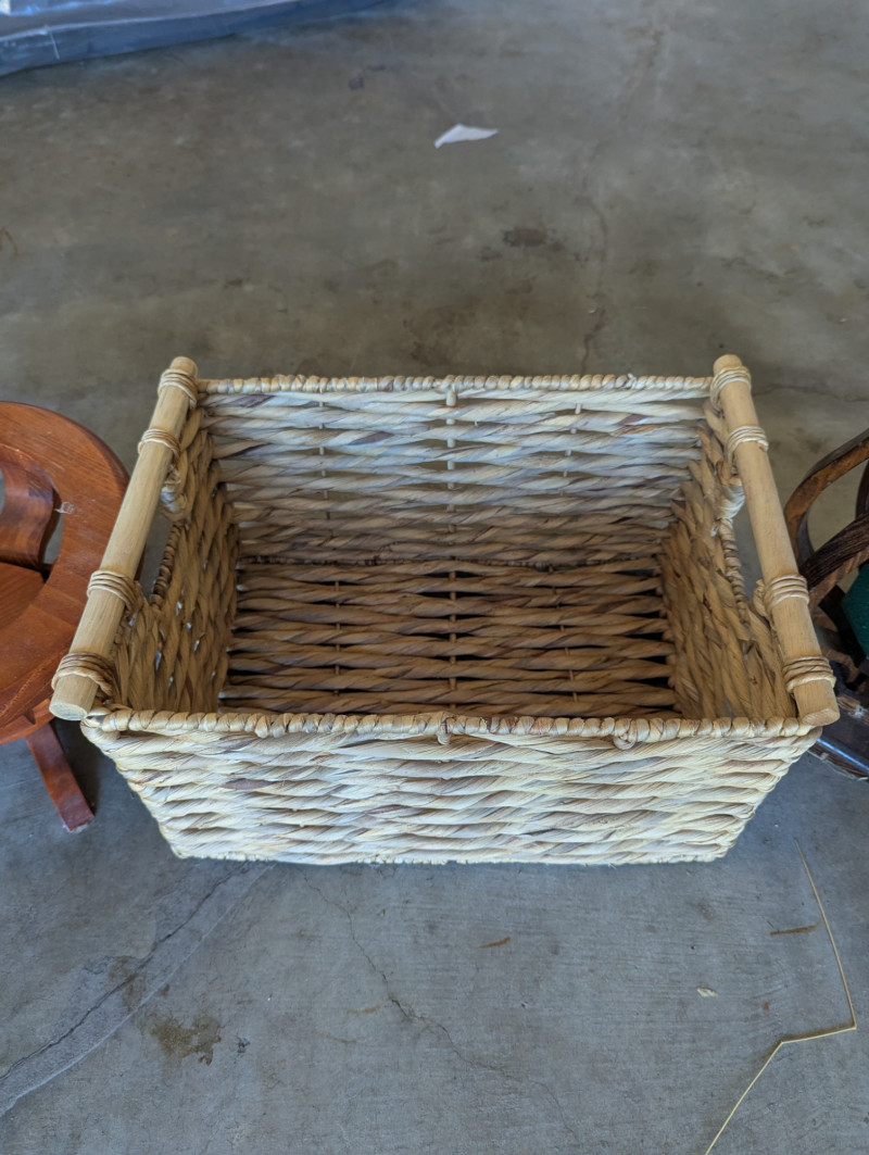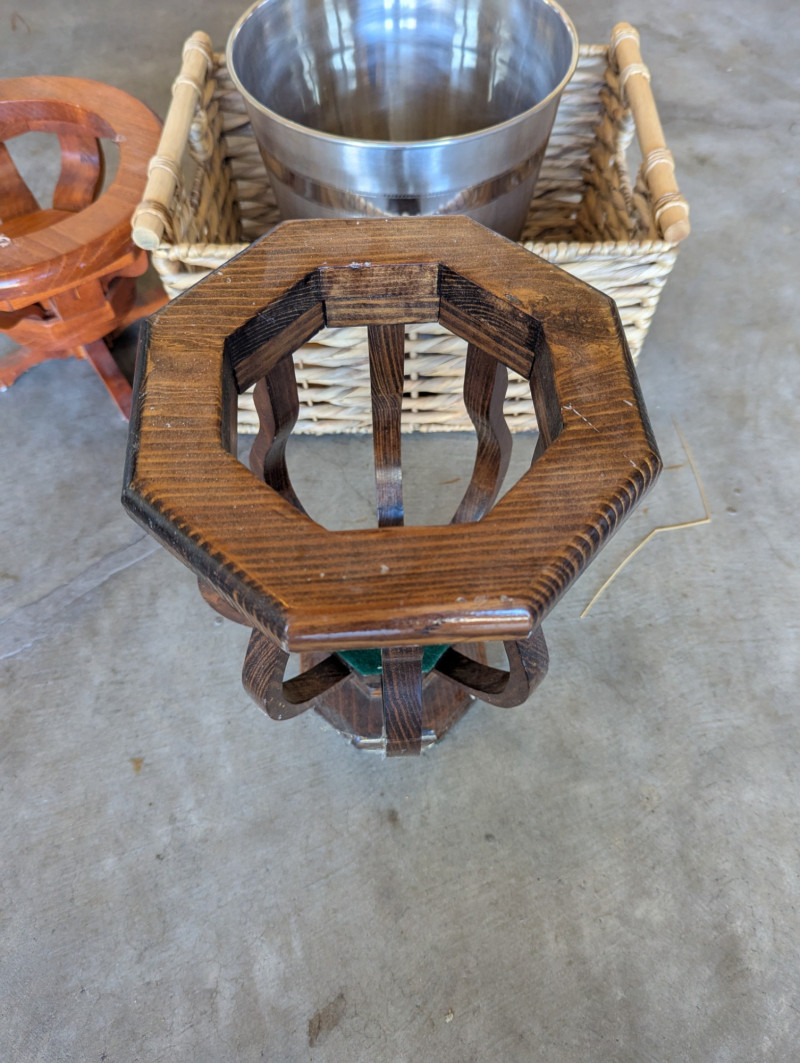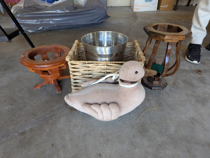 Lot # 85 - Wood Votives, wicker basket, metal waste basket and stuff goose/duck
