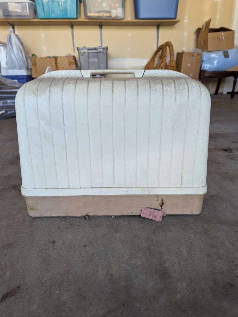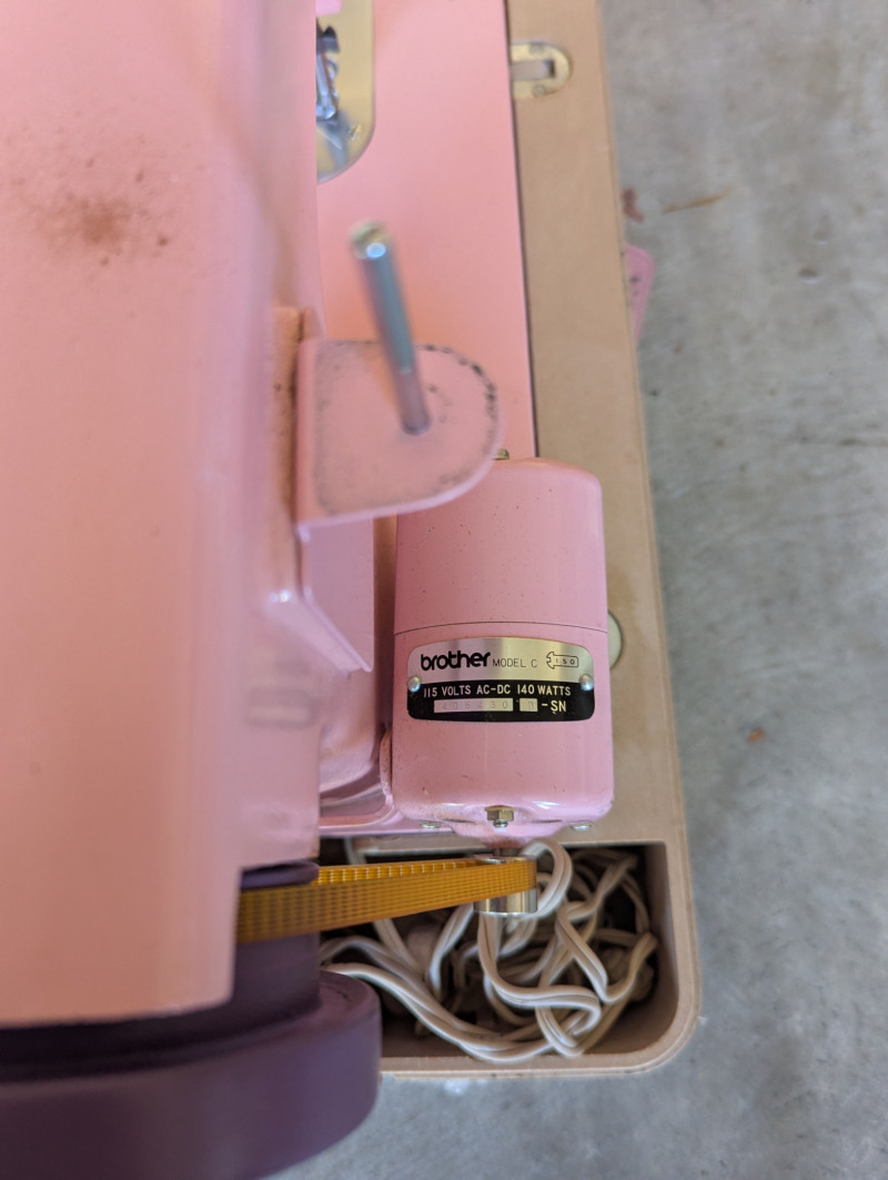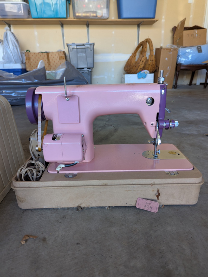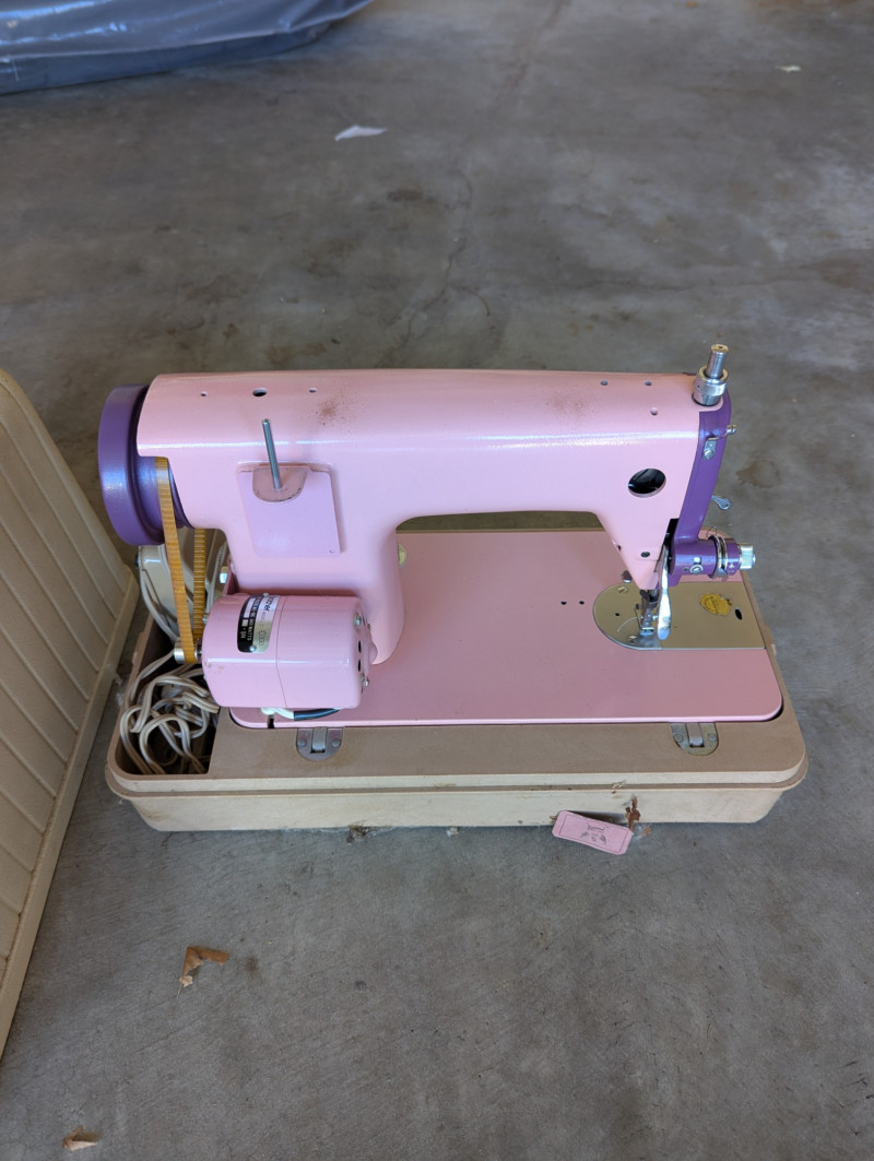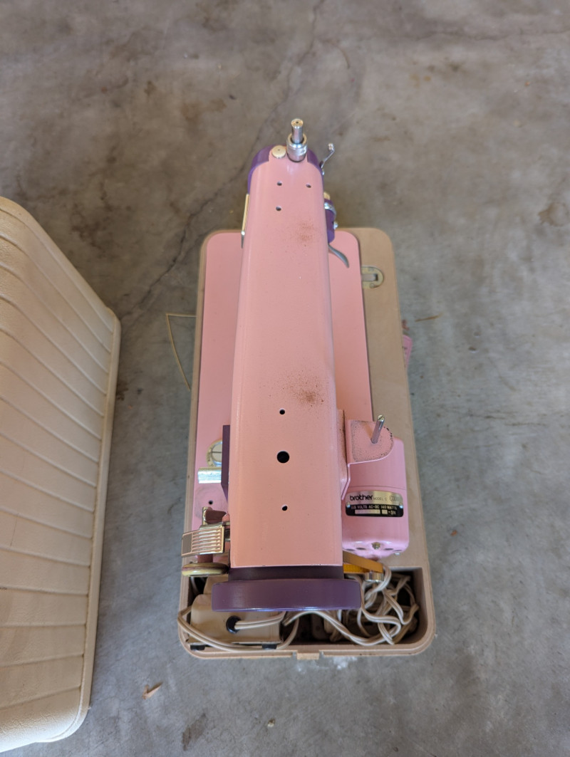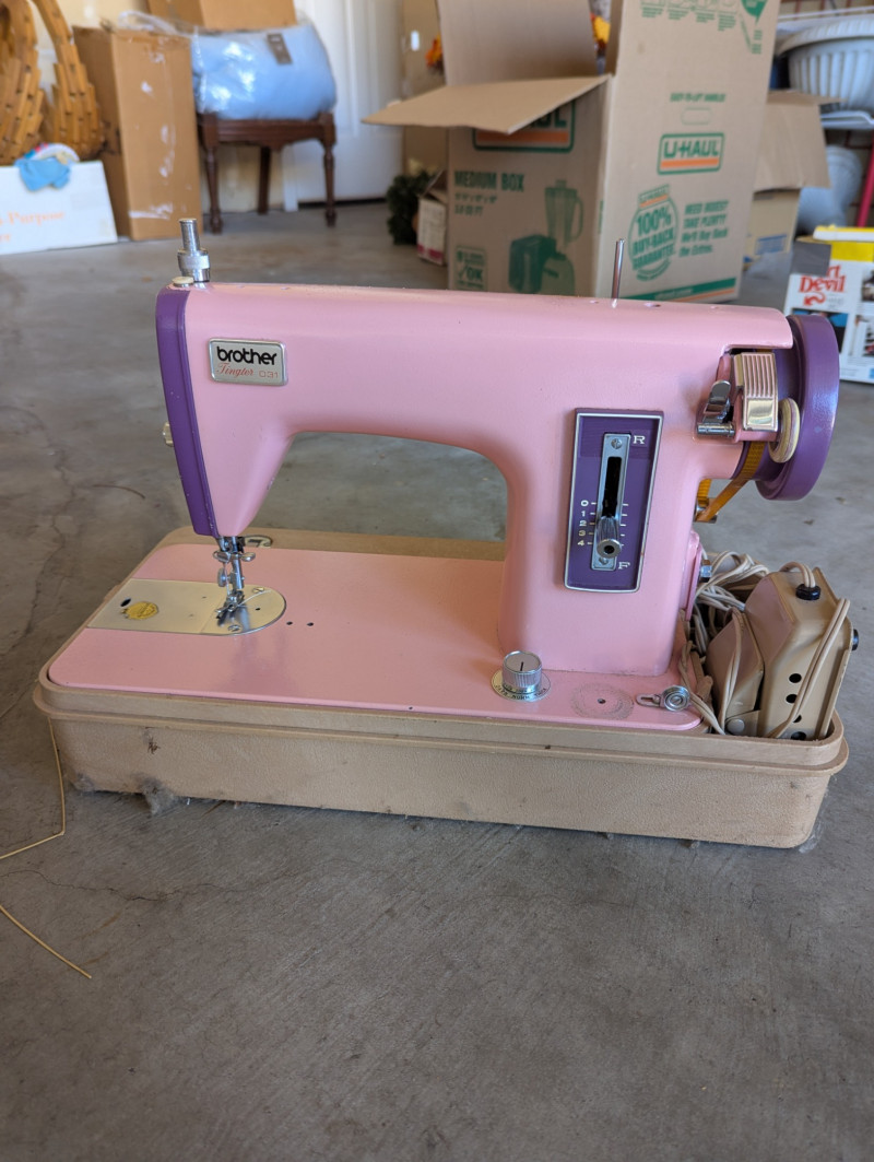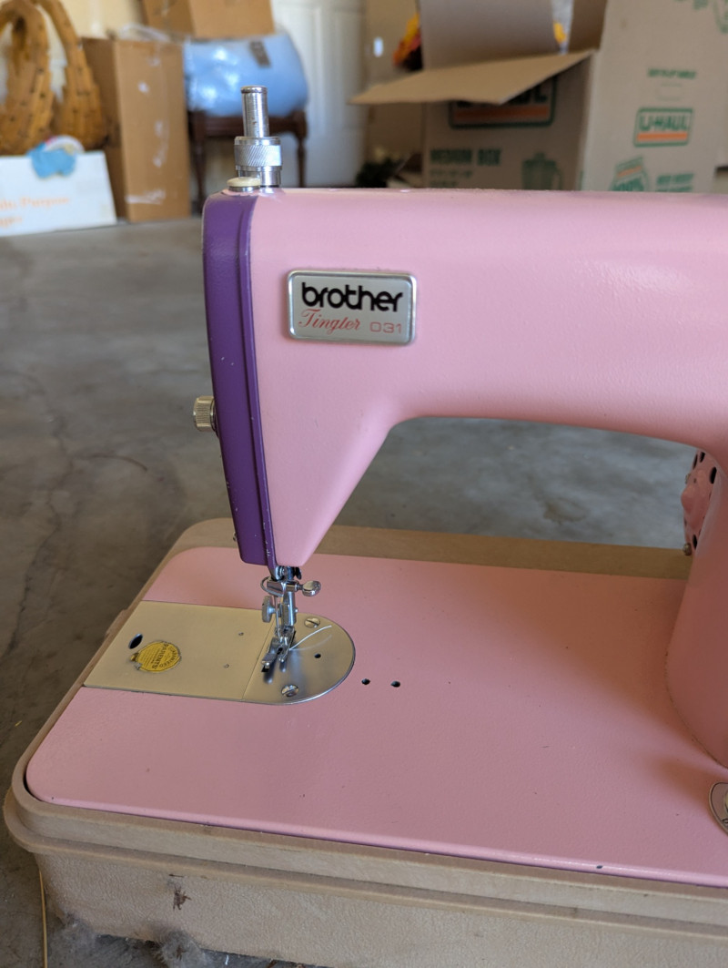 One of the cutest sewing machines you will ever see. It is a Brother Tingler 031 Model C. The Brother "Tingler" Model 031 is a vintage (circa 1953) straight-stitch-only sewing machine, known for its unique "Pepto-bismol pink" and purple color scheme. It is an all-metal machine that comes with a case and foot pedal, and it was marketed with stenciled flowers on its sides. The machine's unusual name and color made it a memorable piece of vintage industrial design and a collectible item for sewists and enthusiasts