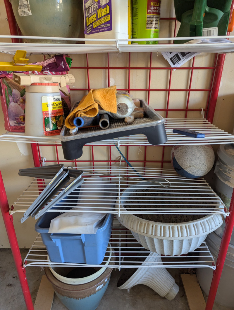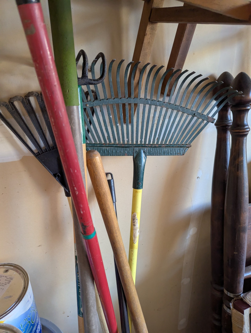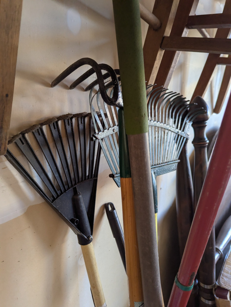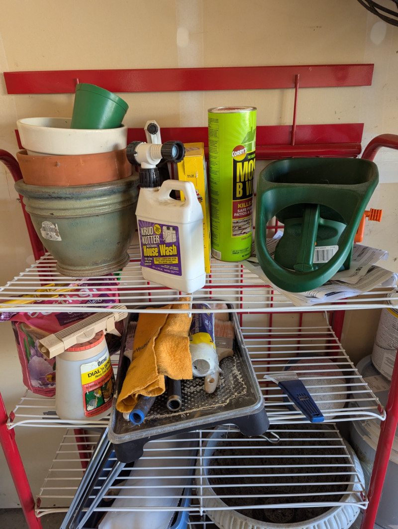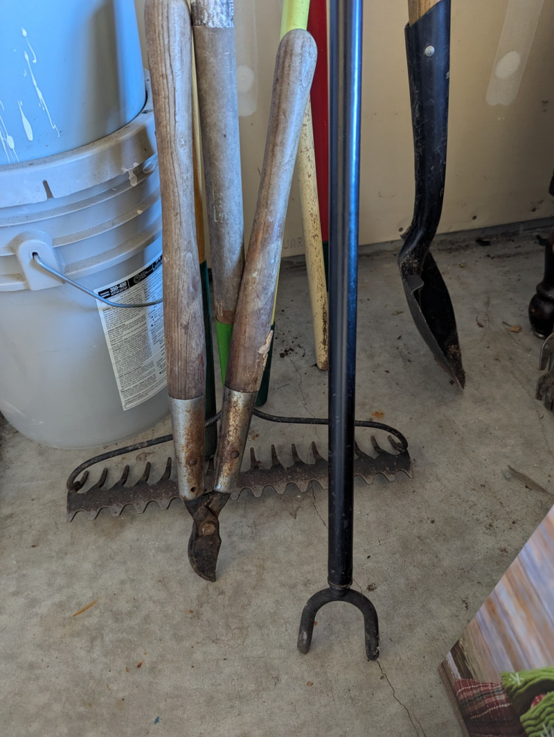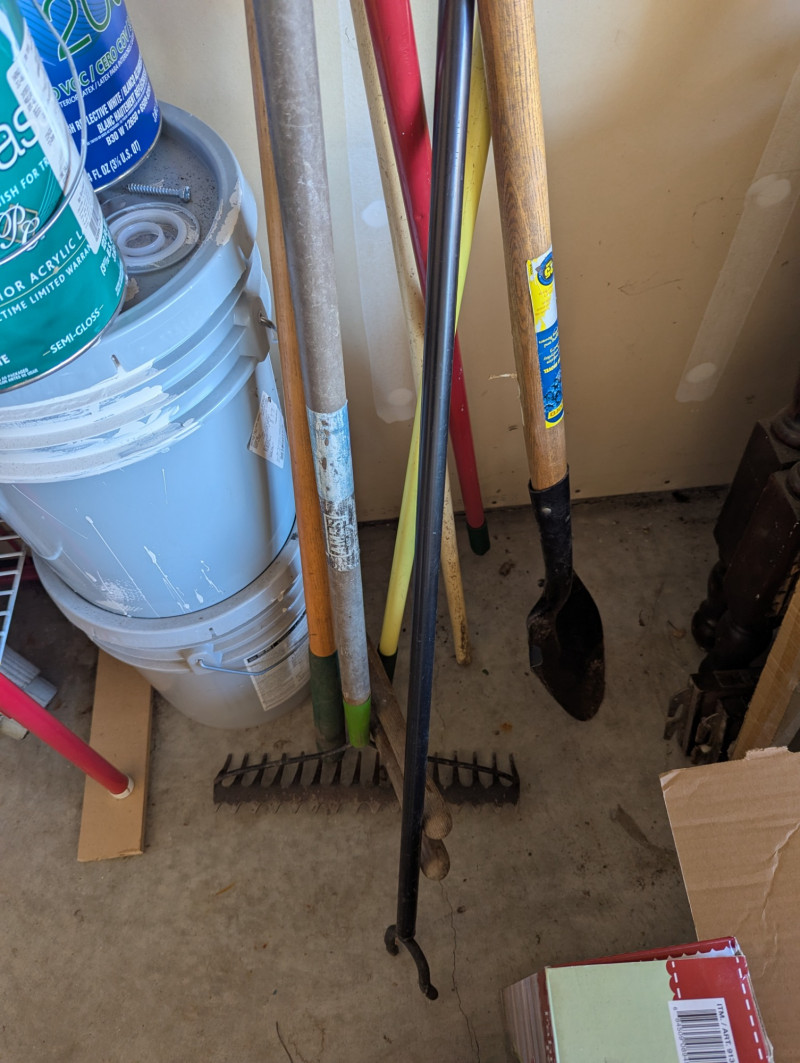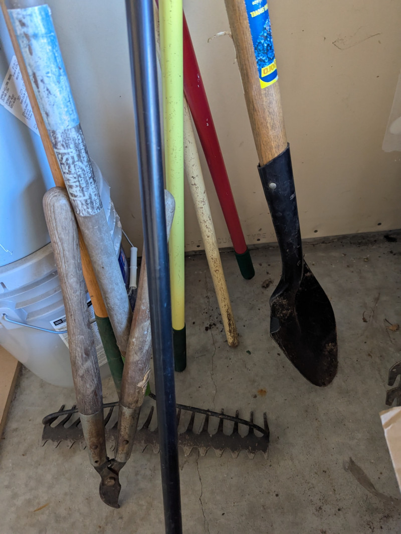 Everything you see on the rack, plus a long shovel, three different types of rakes, and long sheers. The red wire rack is included in the lot which is 57.5H x 31W x 15D