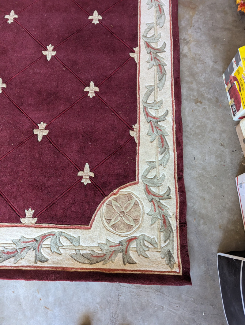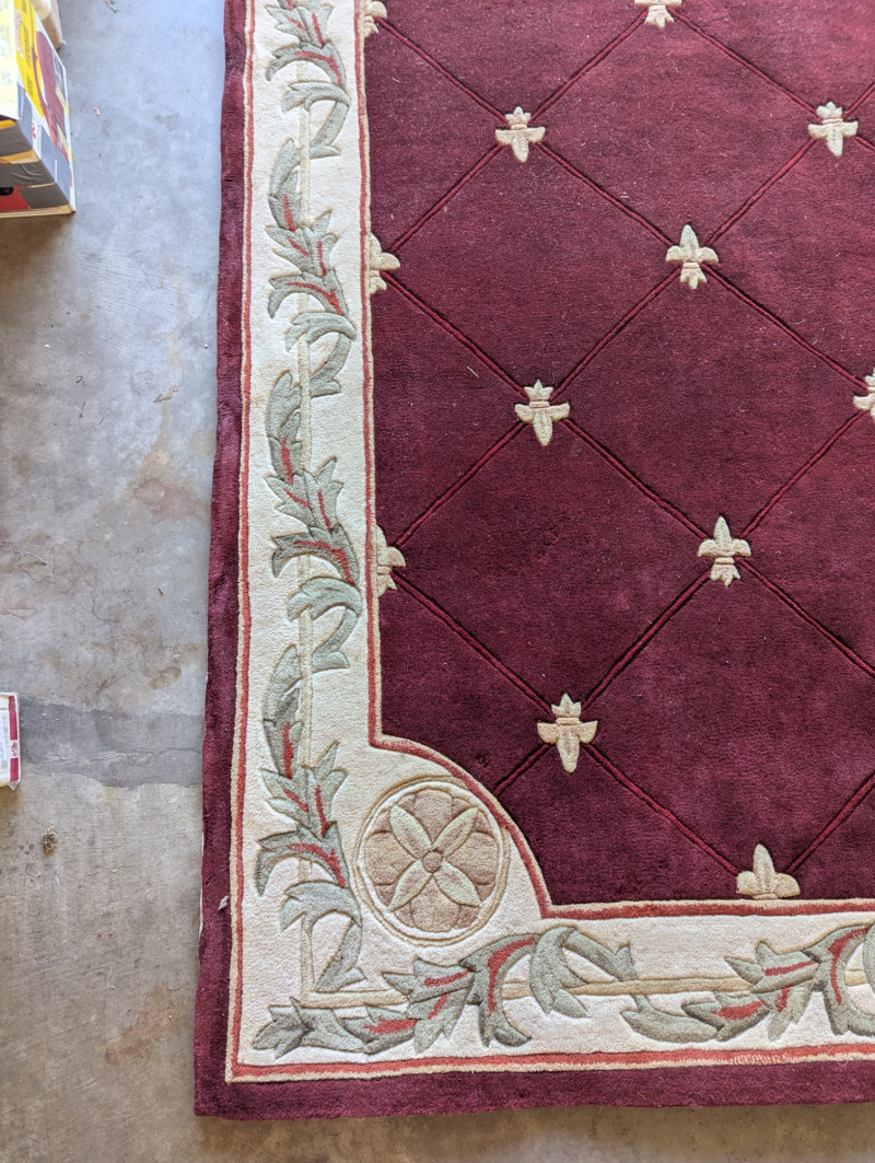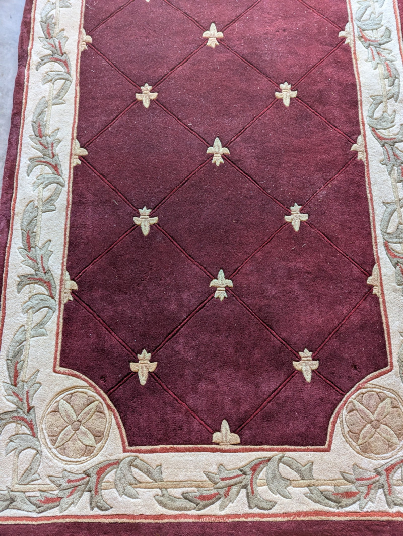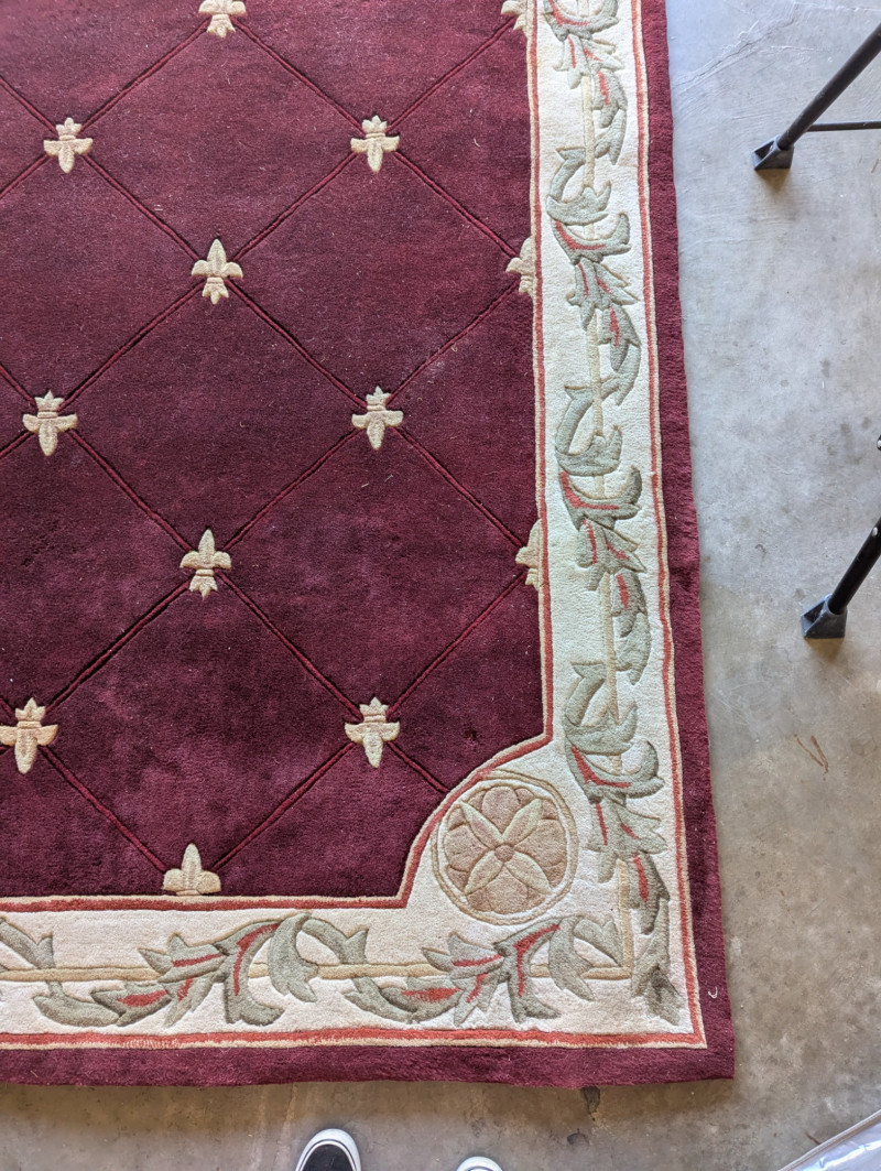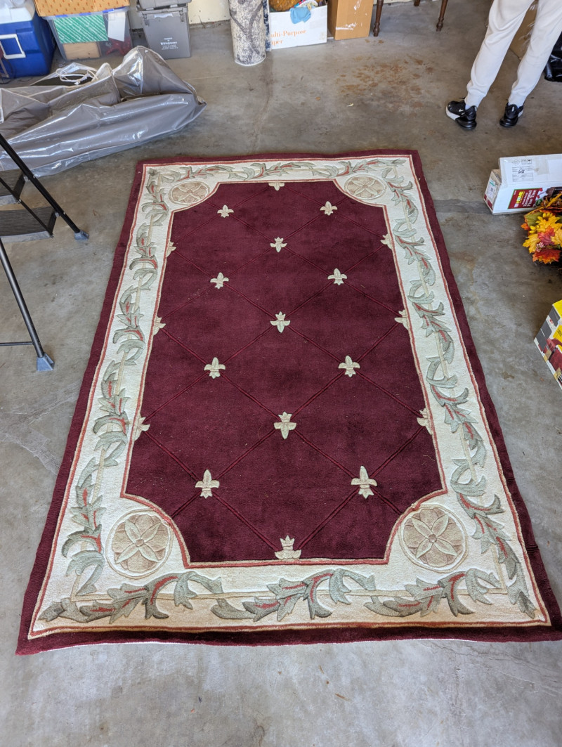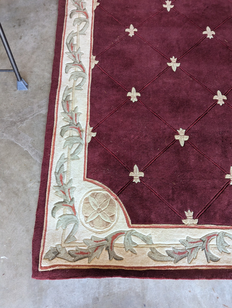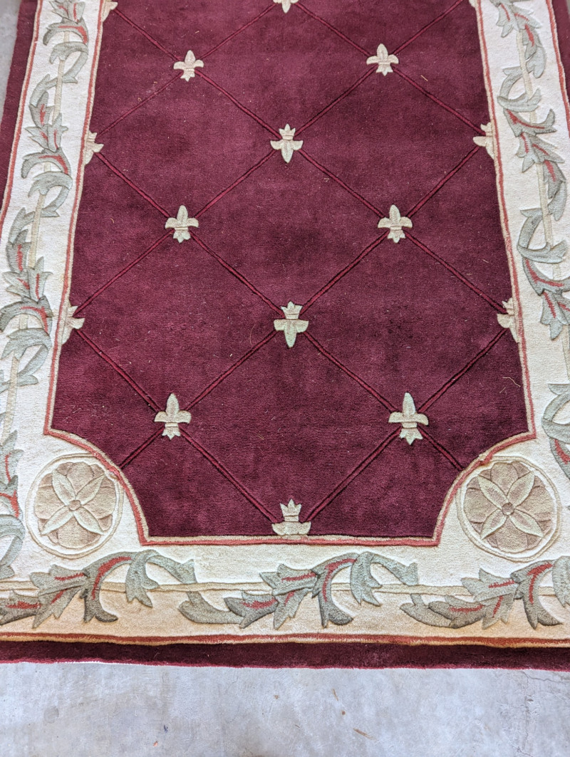Elegant burgundy color with "Fleur De Lis" accents In very good condition. Such an awesome Statement rug. The dimensions are: 5ft x 8ft.
