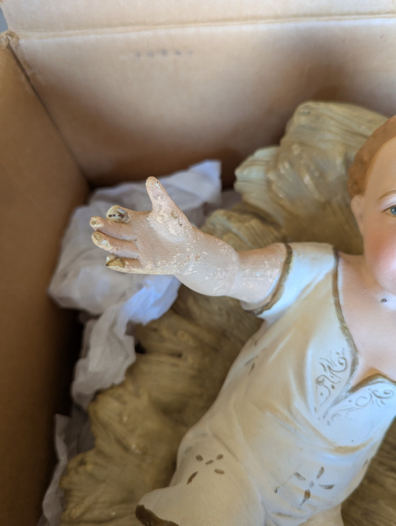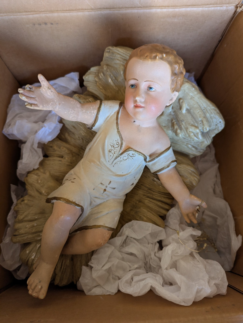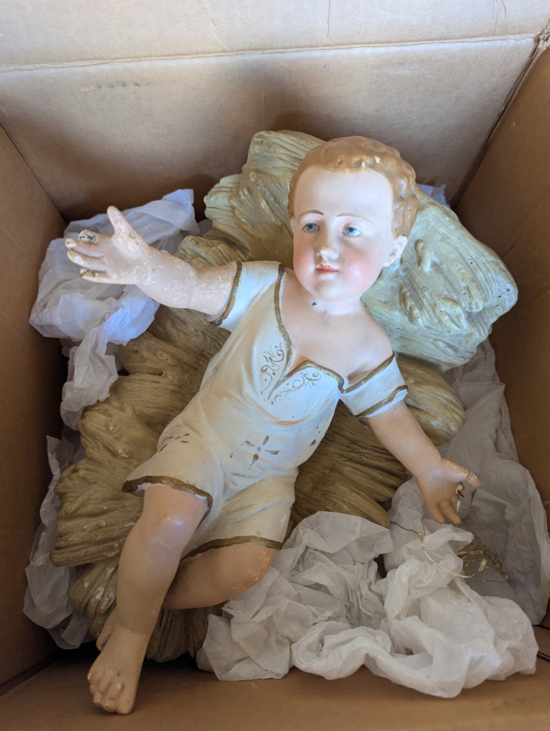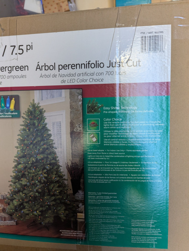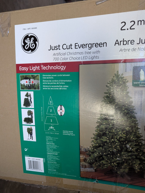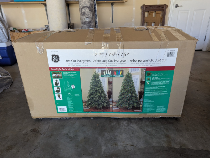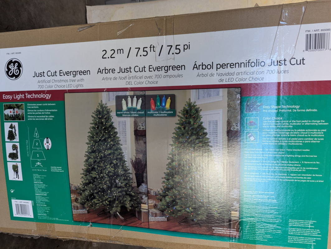 The 7.5ft GE evergreen tree is prelit with colored lights, is in good working condition and in its original box. Comes with a porcelain baby Jesus in a manger.