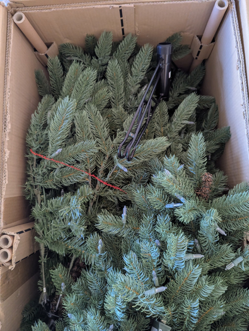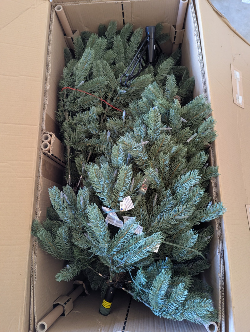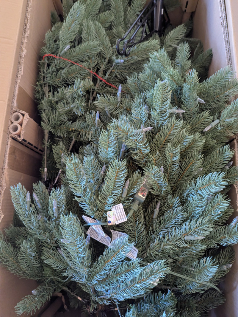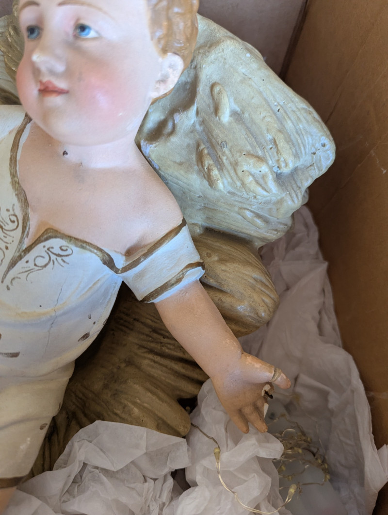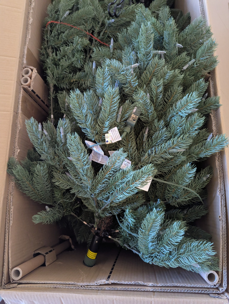 The 7.5ft GE evergreen tree is prelit with colored lights, is in good working condition and in its original box. Comes with a porcelain baby Jesus in a manger.