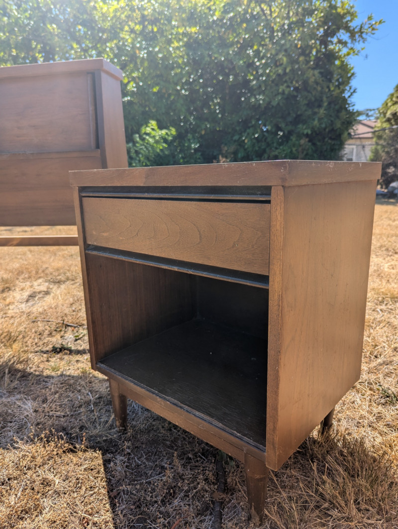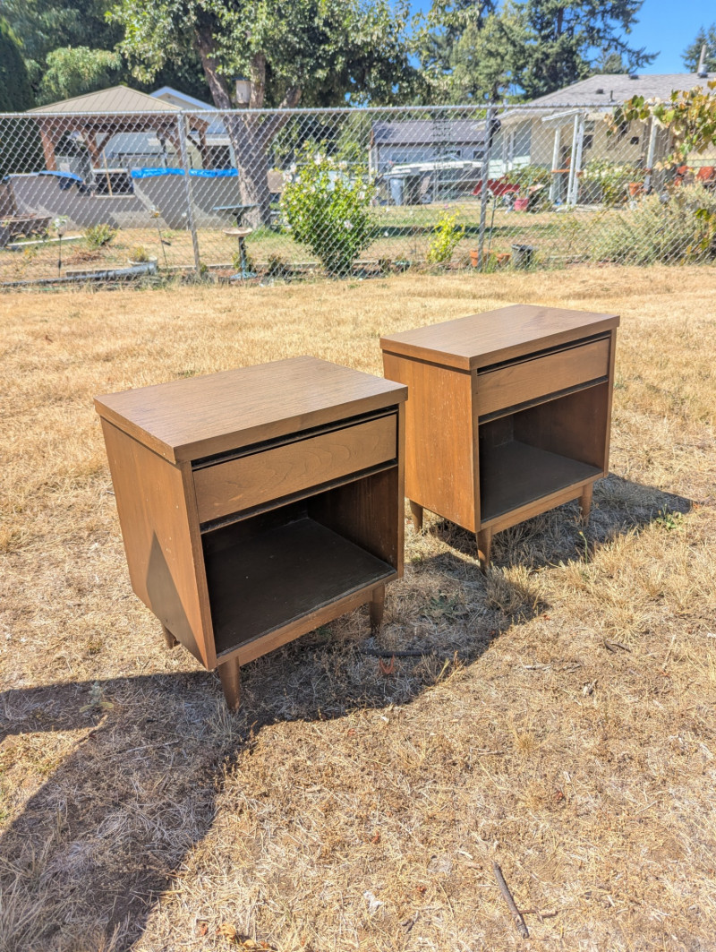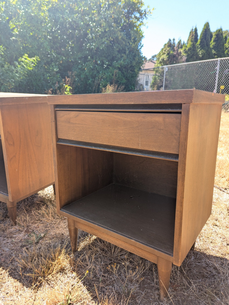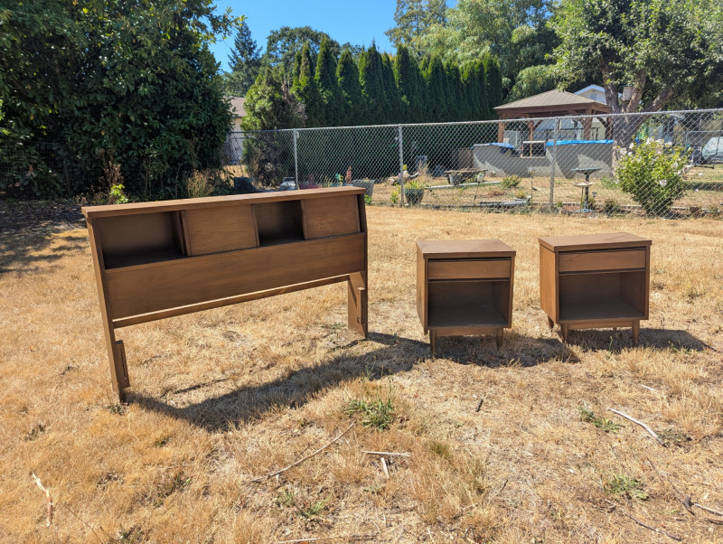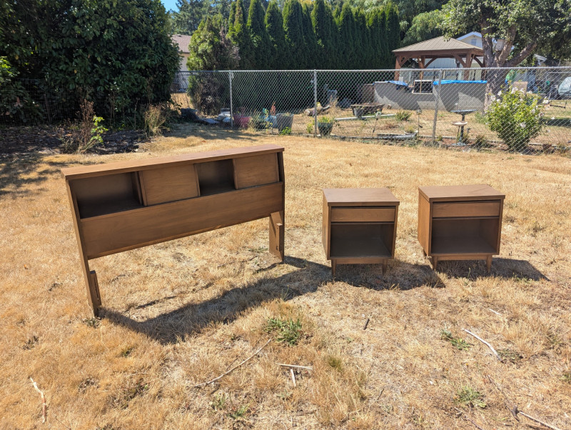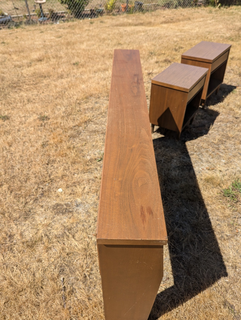 A lovely Mid Century Broyhill Saga headboard for a queen size bed. And two Mid Century Modern matching end tables with laminate tops. Dimensions are: Headboard: 57L x 37H x 7W end tables: 20L x 24H x 14W