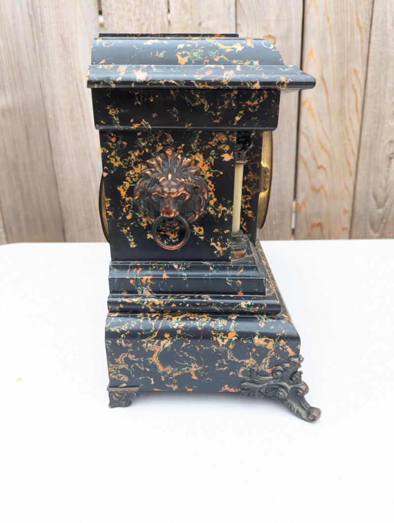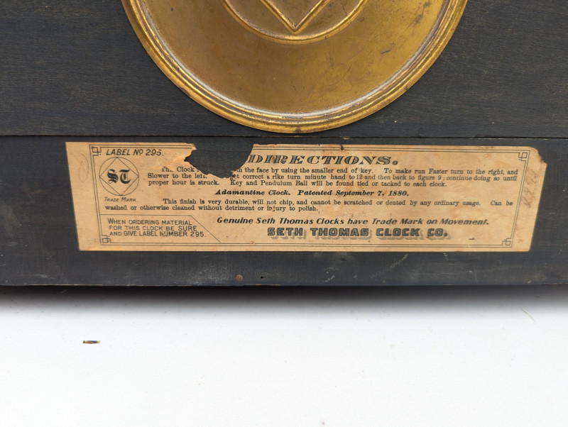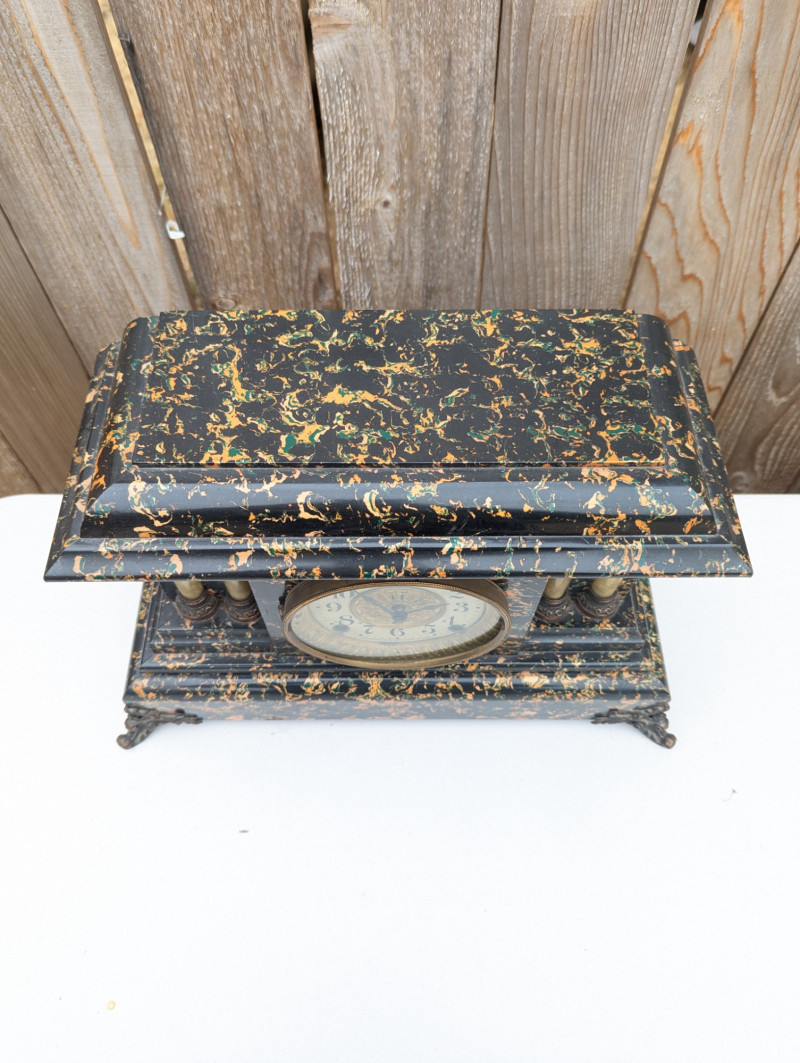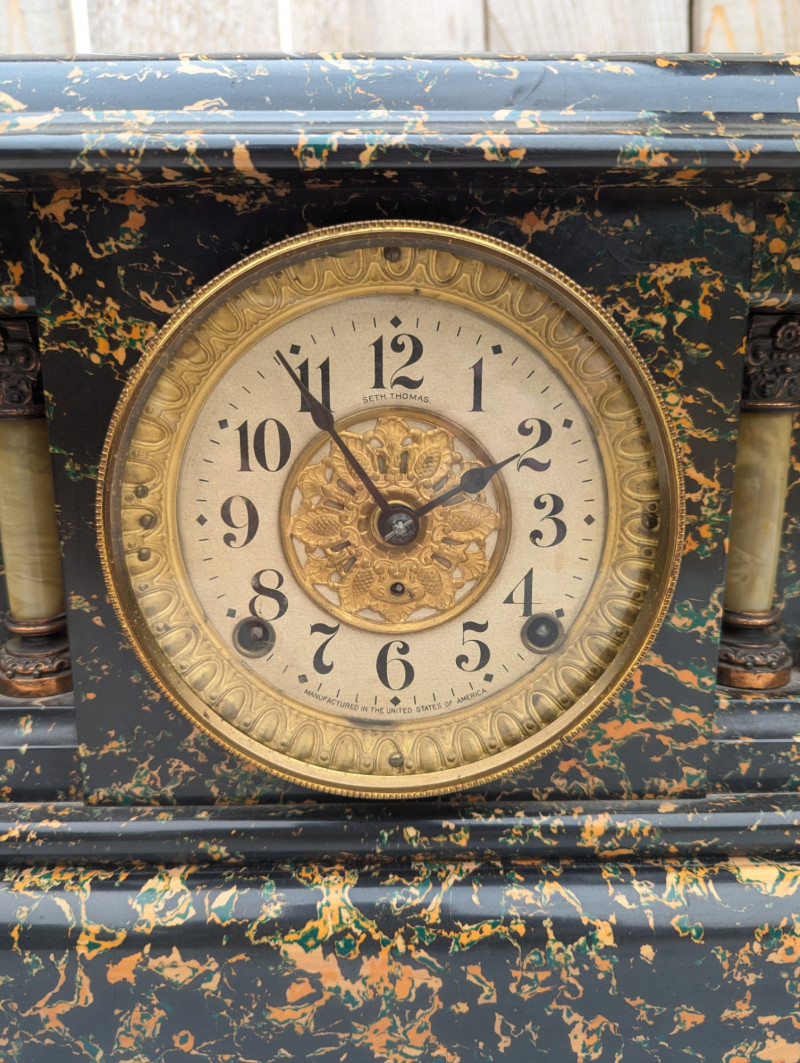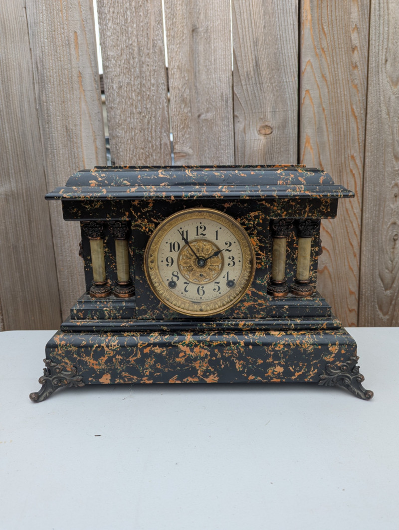 An absolutely stunning Seth Thomas Adamantine tabletop/fireplace mantel clock in good working condition. Seth Thomas Adamantine clocks were popular from 1885 to 1917, featuring cases with a unique celluloid veneer called Adamantine, developed by the Celluloid Manufacturing Company and licensed by Seth Thomas in 1881. These "Black Mantel Clocks" came in various patterns, simulating marble or wood grain, and were sold as affordable alternatives to expensive French clocks. Dimensions: 16L x 6W x 10H