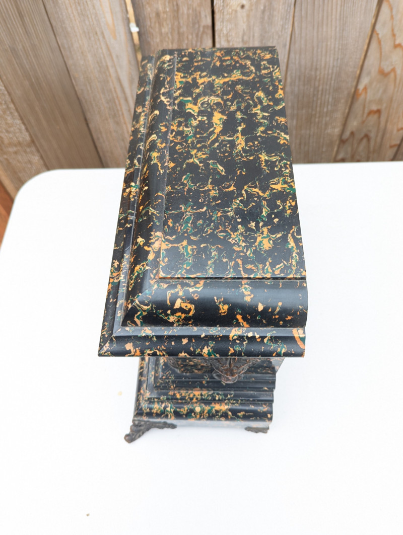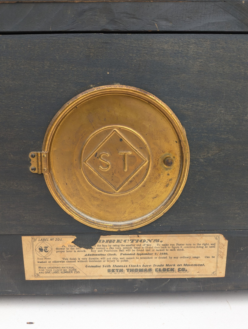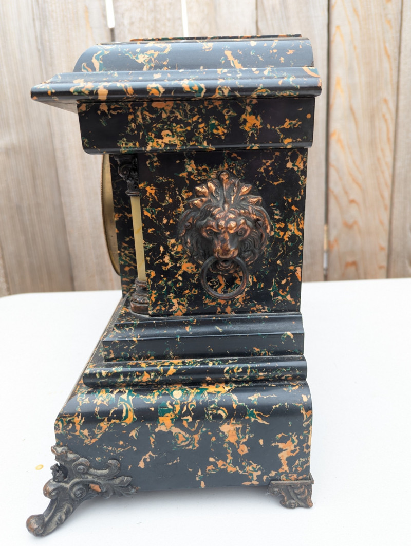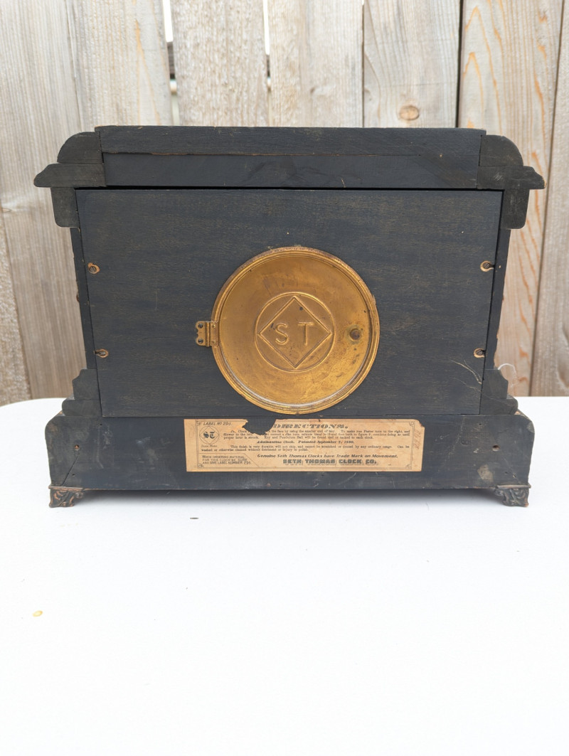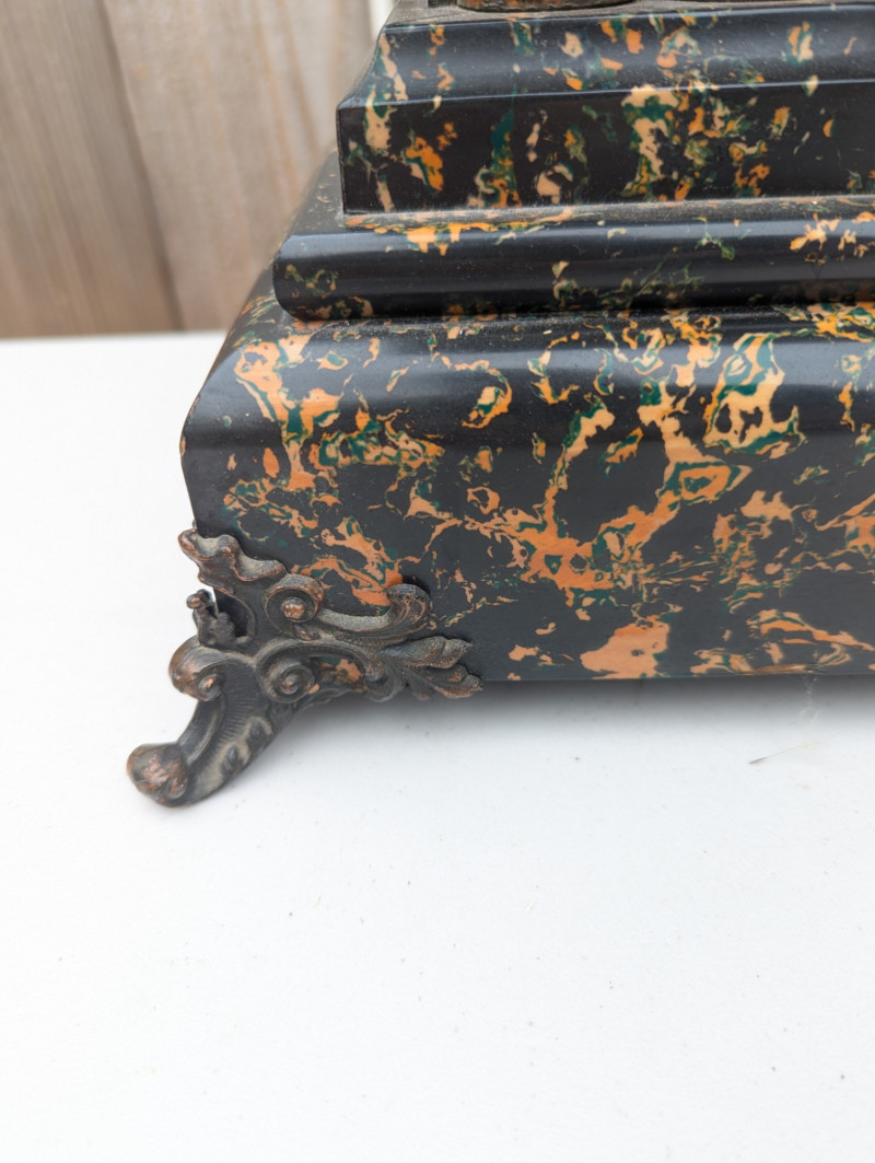 An absolutely stunning Seth Thomas Adamantine tabletop/fireplace mantel clock in good working condition. Seth Thomas Adamantine clocks were popular from 1885 to 1917, featuring cases with a unique celluloid veneer called Adamantine, developed by the Celluloid Manufacturing Company and licensed by Seth Thomas in 1881. These "Black Mantel Clocks" came in various patterns, simulating marble or wood grain, and were sold as affordable alternatives to expensive French clocks. Dimensions: 16L x 6W x 10H