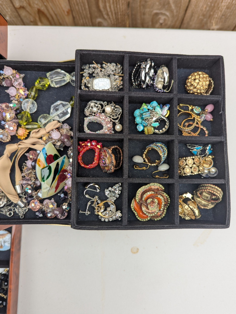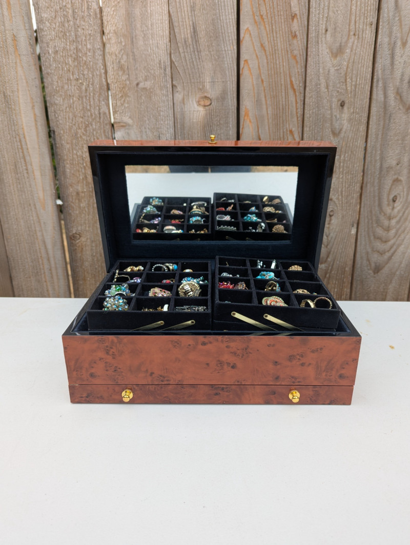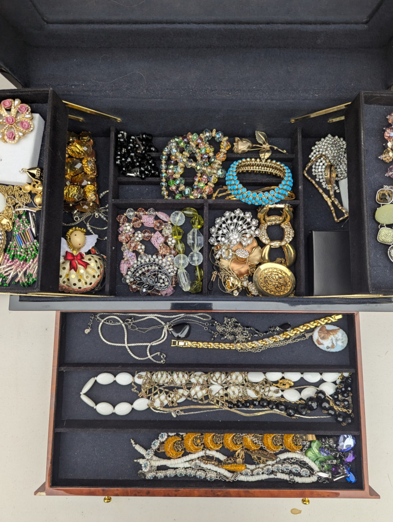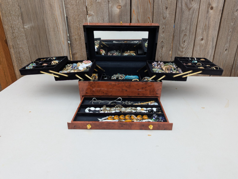 A gorgeous jewelry box that is FILLED with costume jewelry. Both the box and the jewelry are in very good condition.