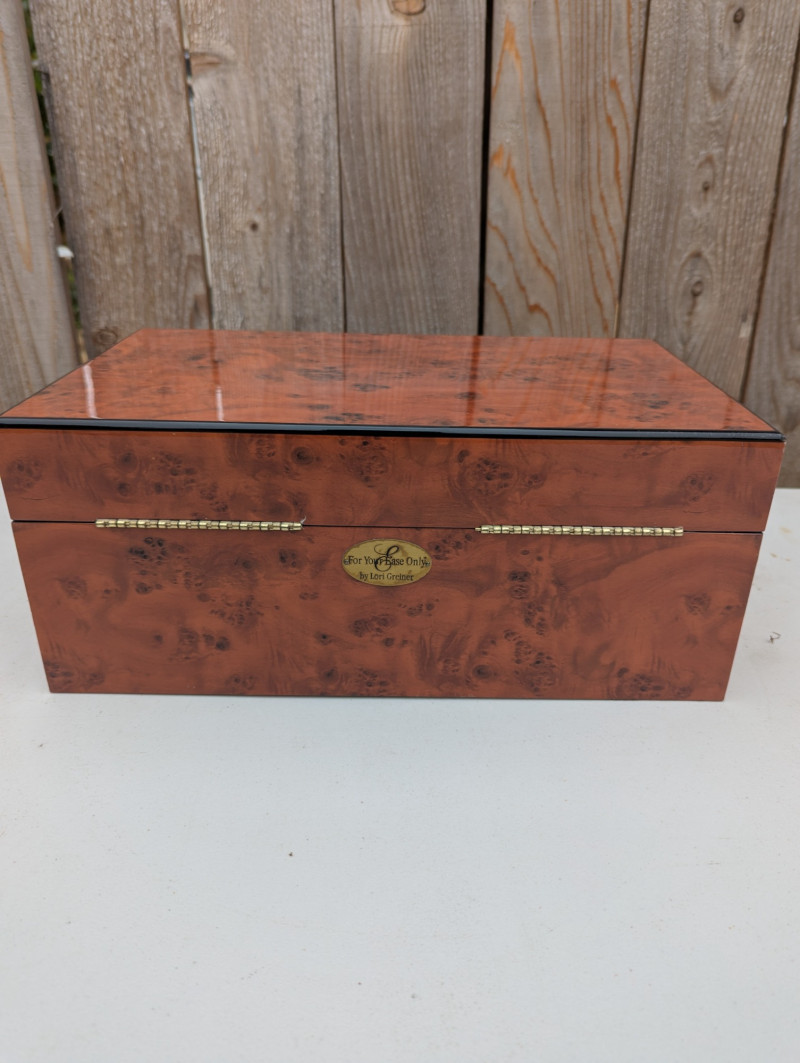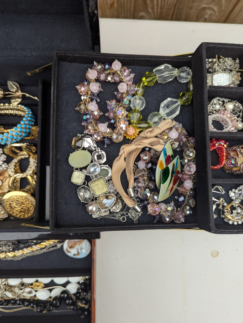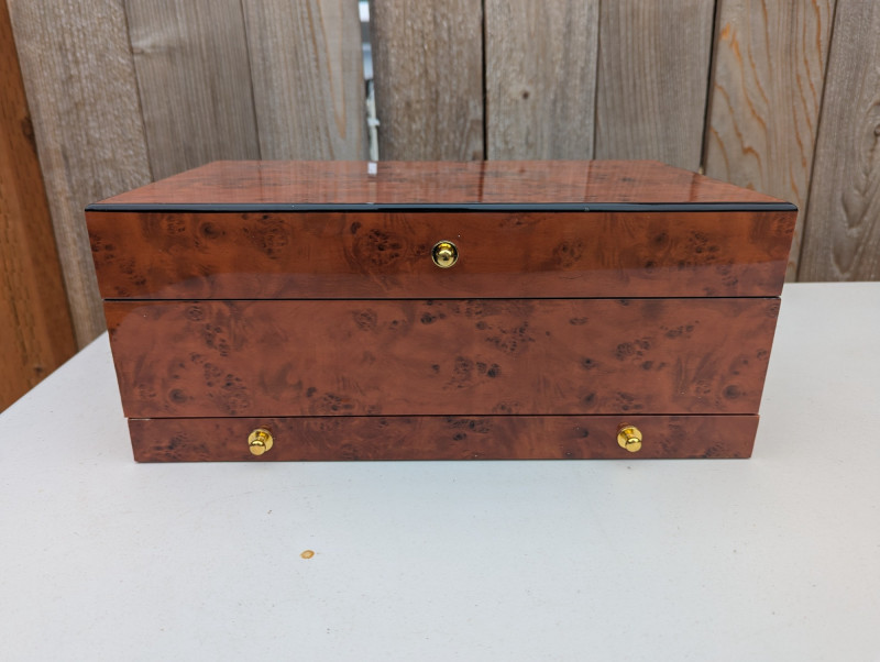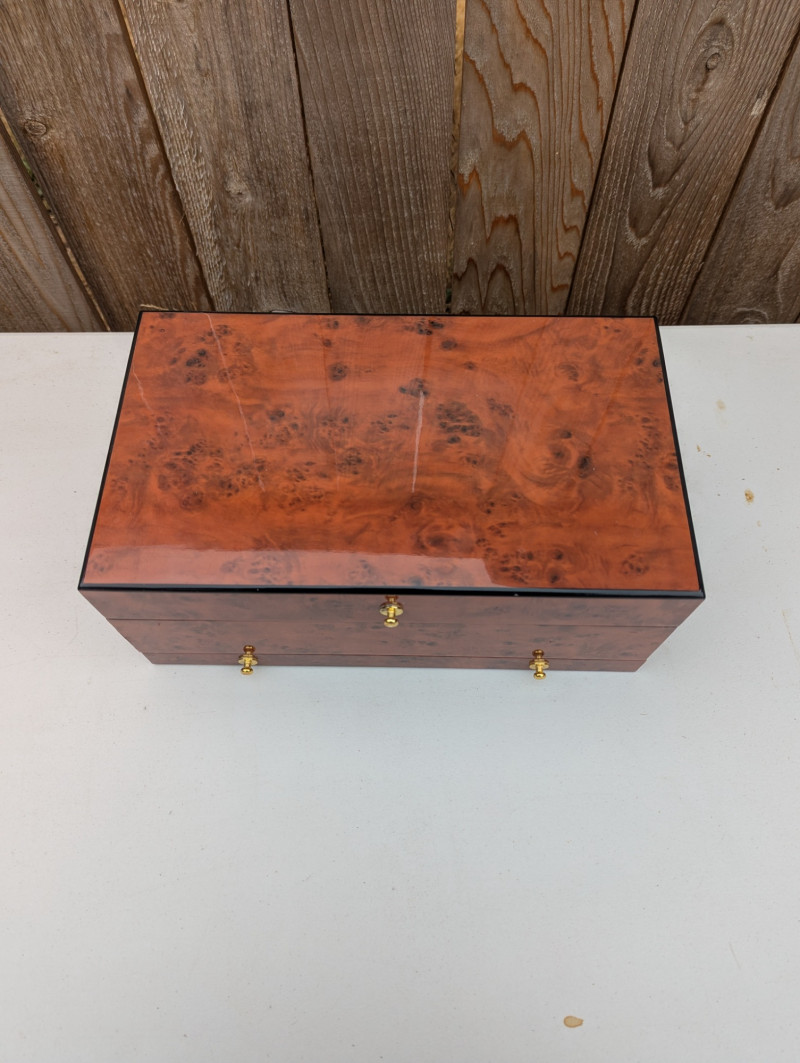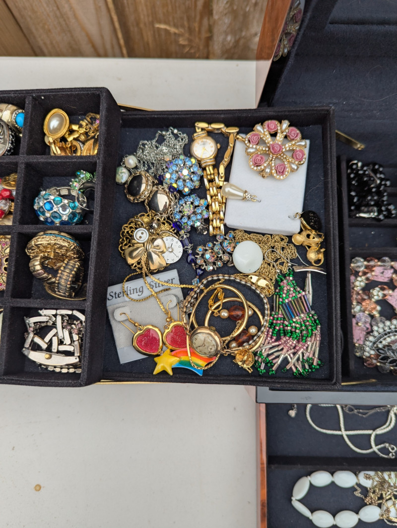 A gorgeous jewelry box that is FILLED with costume jewelry. Both the box and the jewelry are in very good condition.