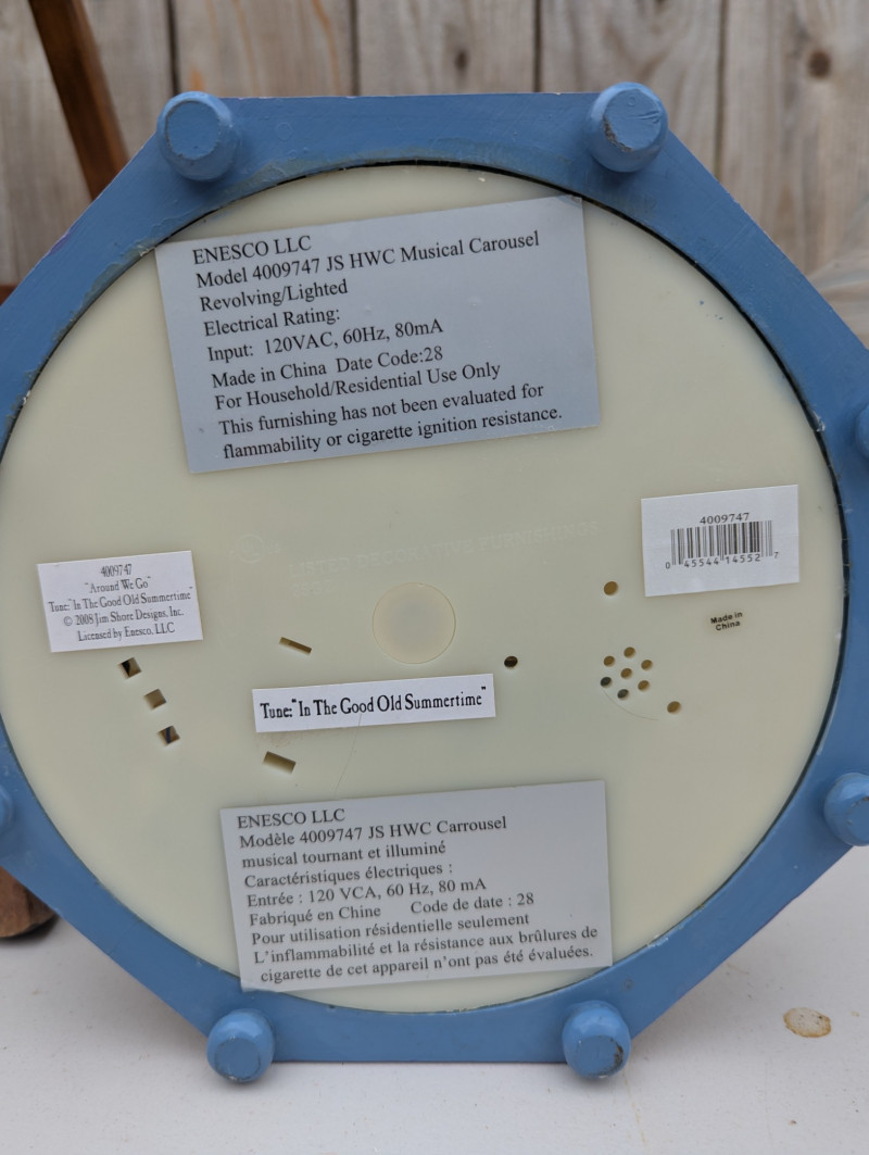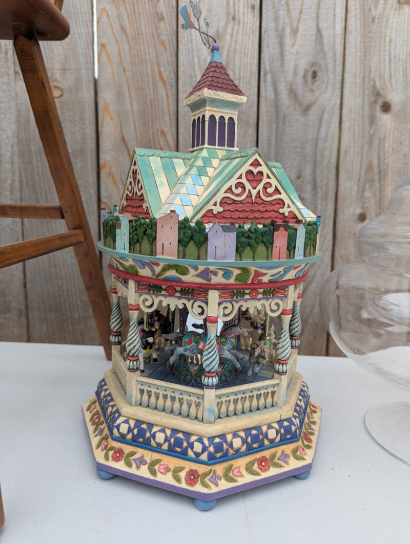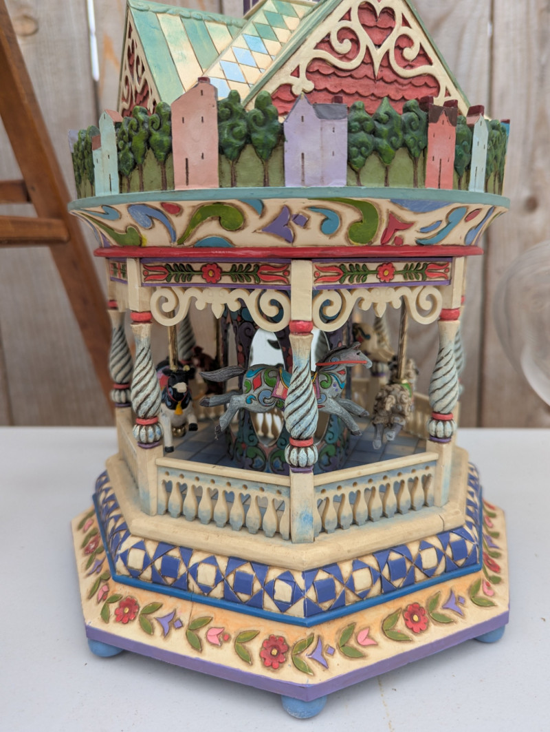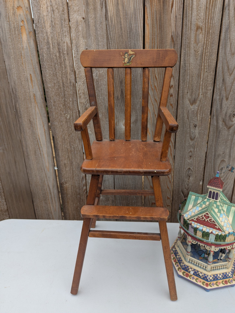 The chair would be perfect for a porcelain doll, small teddy bears or baby doll. The musical carousel appears to be in near perfect condition and works well! And neither the candle holders or vase have been used and come in their original boxes.