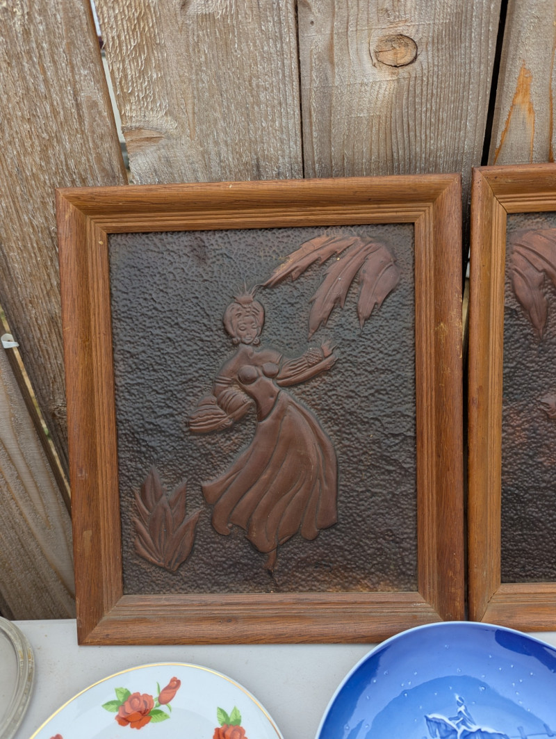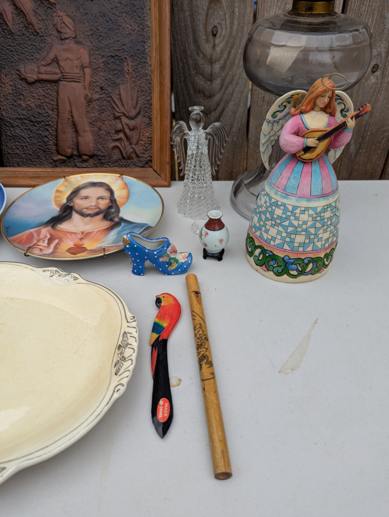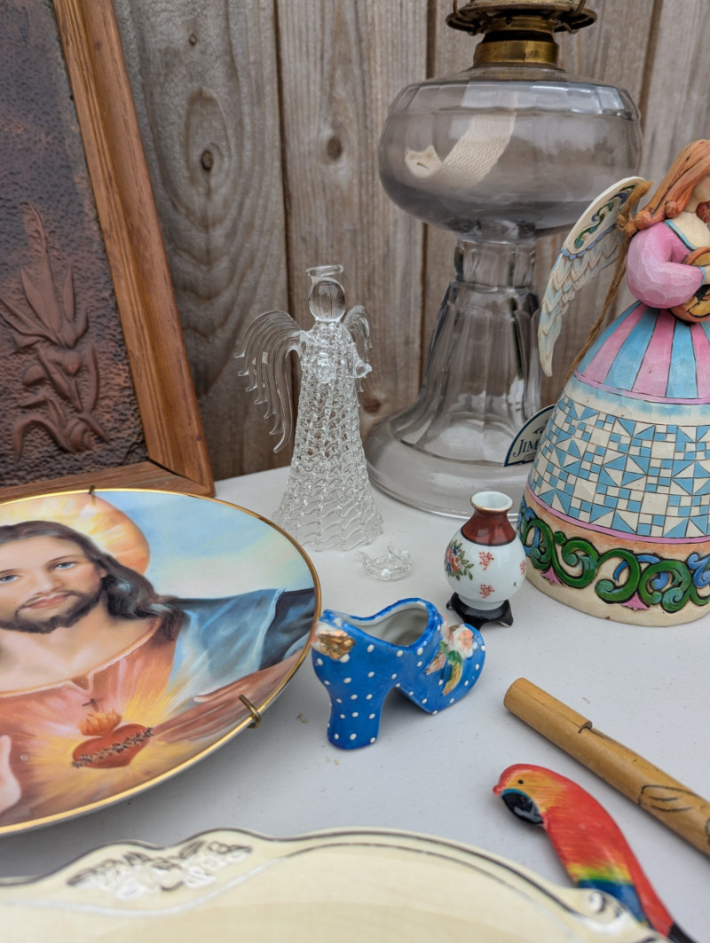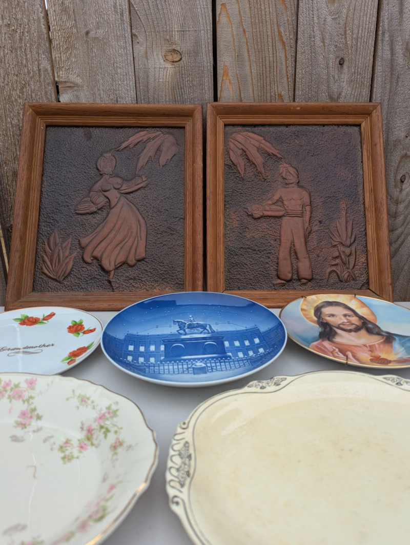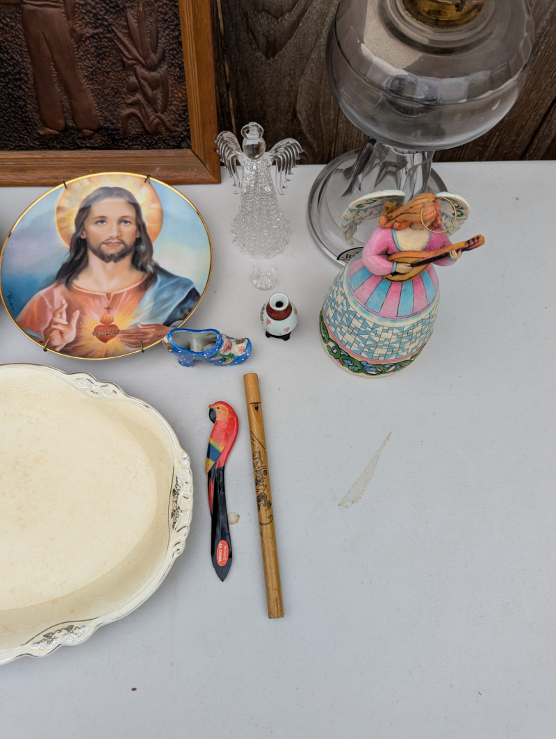 A Fun Assortment of Decor and Figurines. 2 Vintage oil lamps. Stunning brass/copper style pictures depicting a man and a woman. Some lovely angel figurines. One Crystal and one made by Jim Shore (The Jim Shore angel figurines are handcrafted sculptures made of stone resin, featuring folk-art styling with intricate, hand-painted details like rosemaling and quilt-inspired patterns. ) Decorative Plates and a few more small figurines.