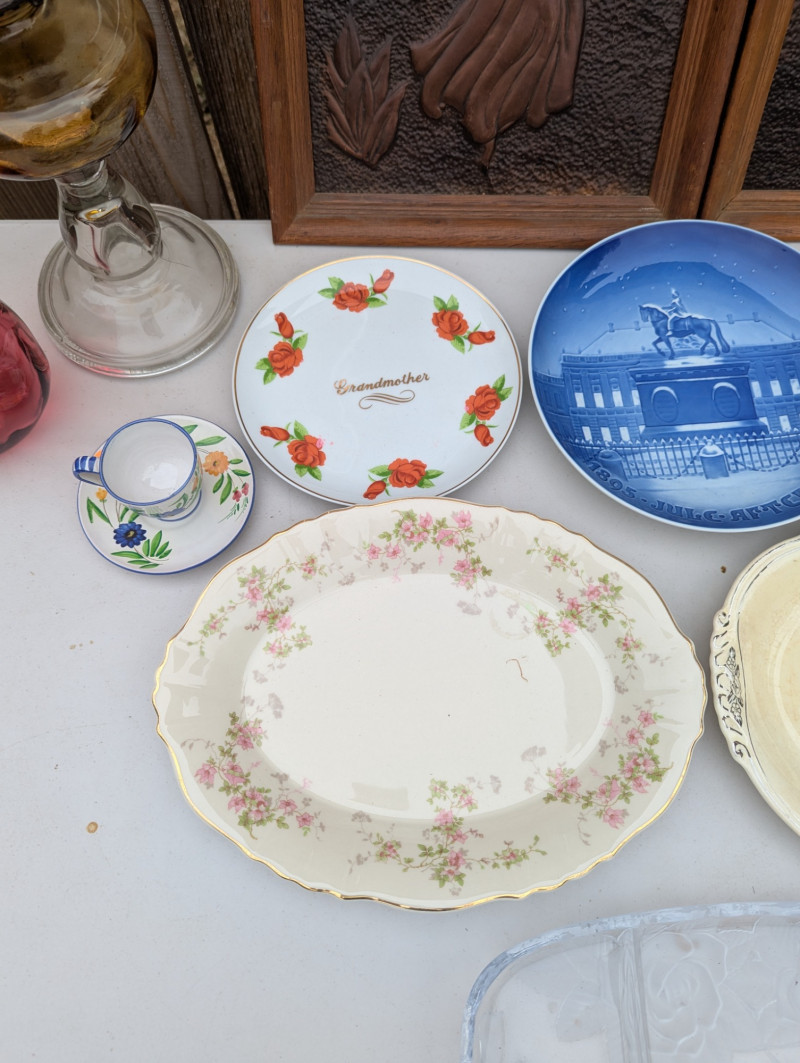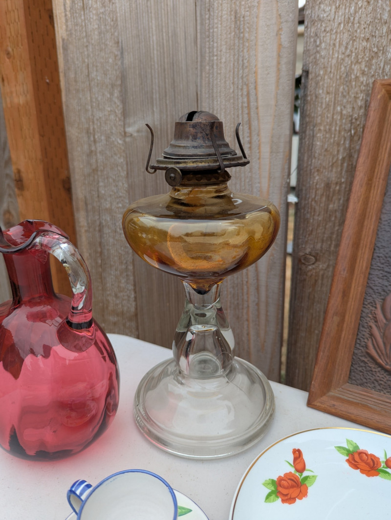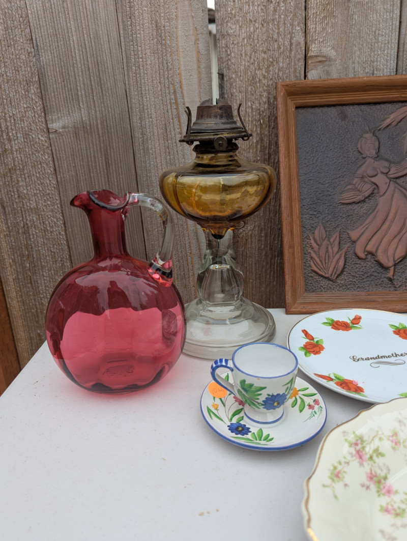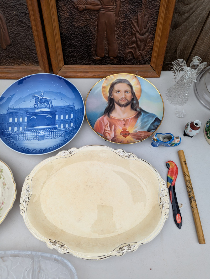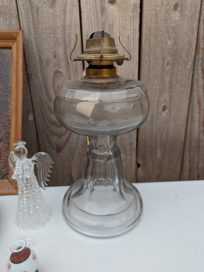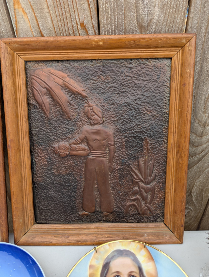 A Fun Assortment of Decor and Figurines. 2 Vintage oil lamps. Stunning brass/copper style pictures depicting a man and a woman. Some lovely angel figurines. One Crystal and one made by Jim Shore (The Jim Shore angel figurines are handcrafted sculptures made of stone resin, featuring folk-art styling with intricate, hand-painted details like rosemaling and quilt-inspired patterns. ) Decorative Plates and a few more small figurines.