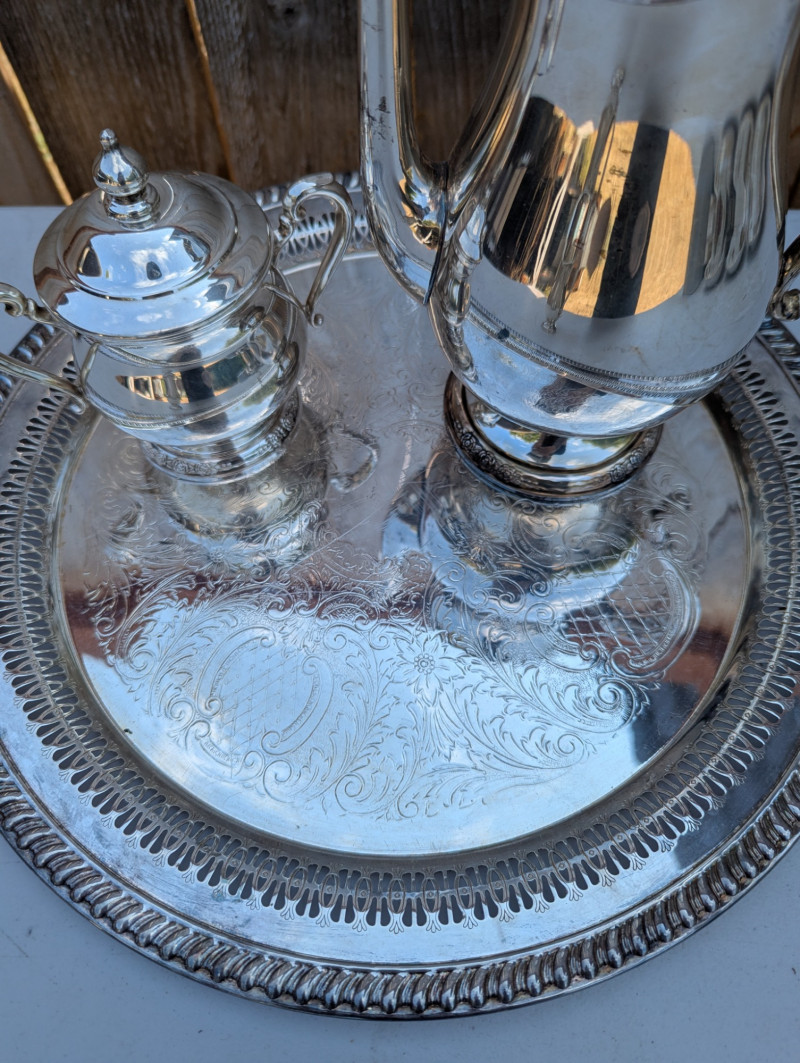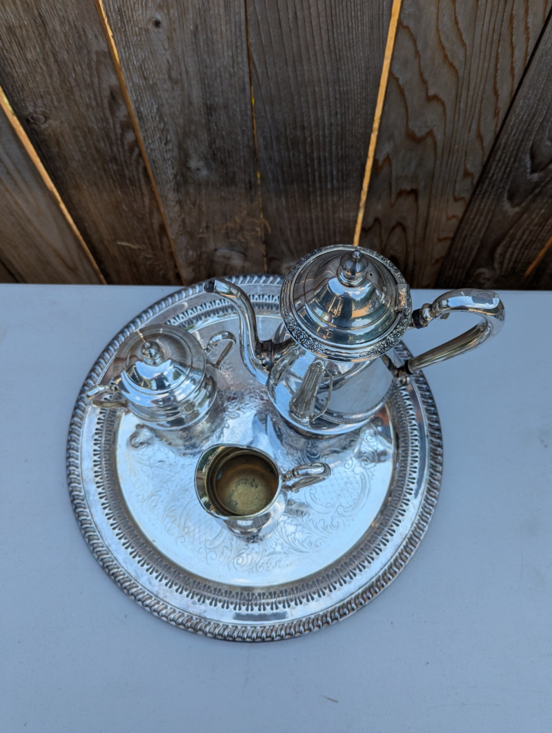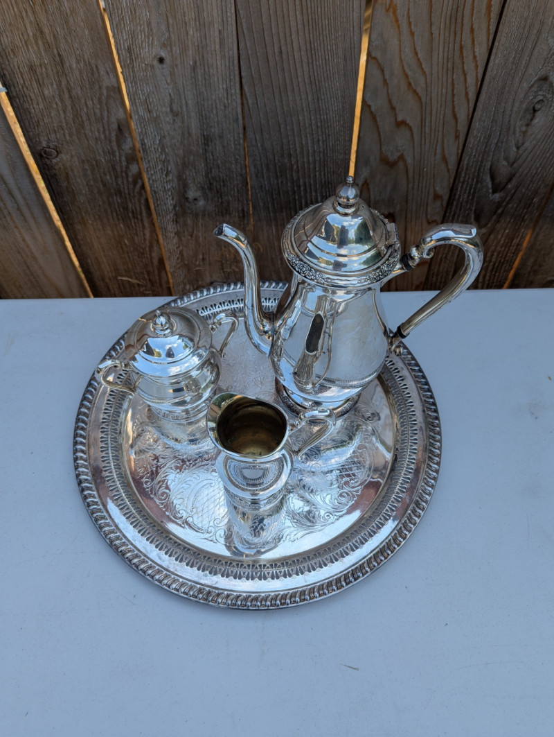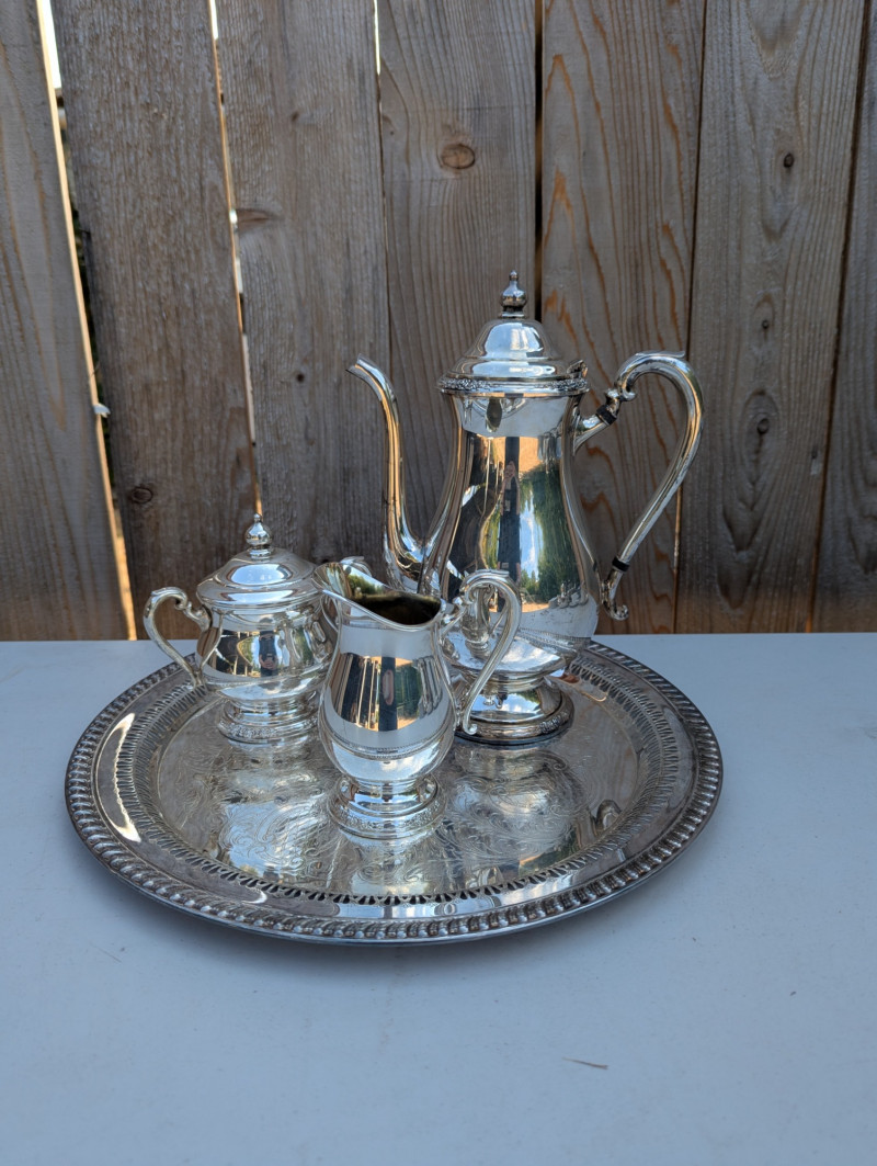 A Gorgeous Camille International Silver Co. (Crown Emblem) teapot set. that includes a teapot, creamer, sugar with lid, butter dish with lid and tray. In very good condition. The Camille pattern was produced by the International Silver Company (ISC) as a silver-plated tea set, possibly in the 20th century, though pinpointing the exact production year is difficult. While the pattern itself might have Victorian or Art Nouveau influences with floral motifs on the rims and bases, one source suggests a 1970s production, while others indicate a 1920-1940 or 1950s timeframe. Would be an excellent Christmas gift!